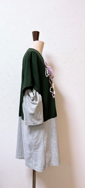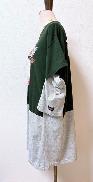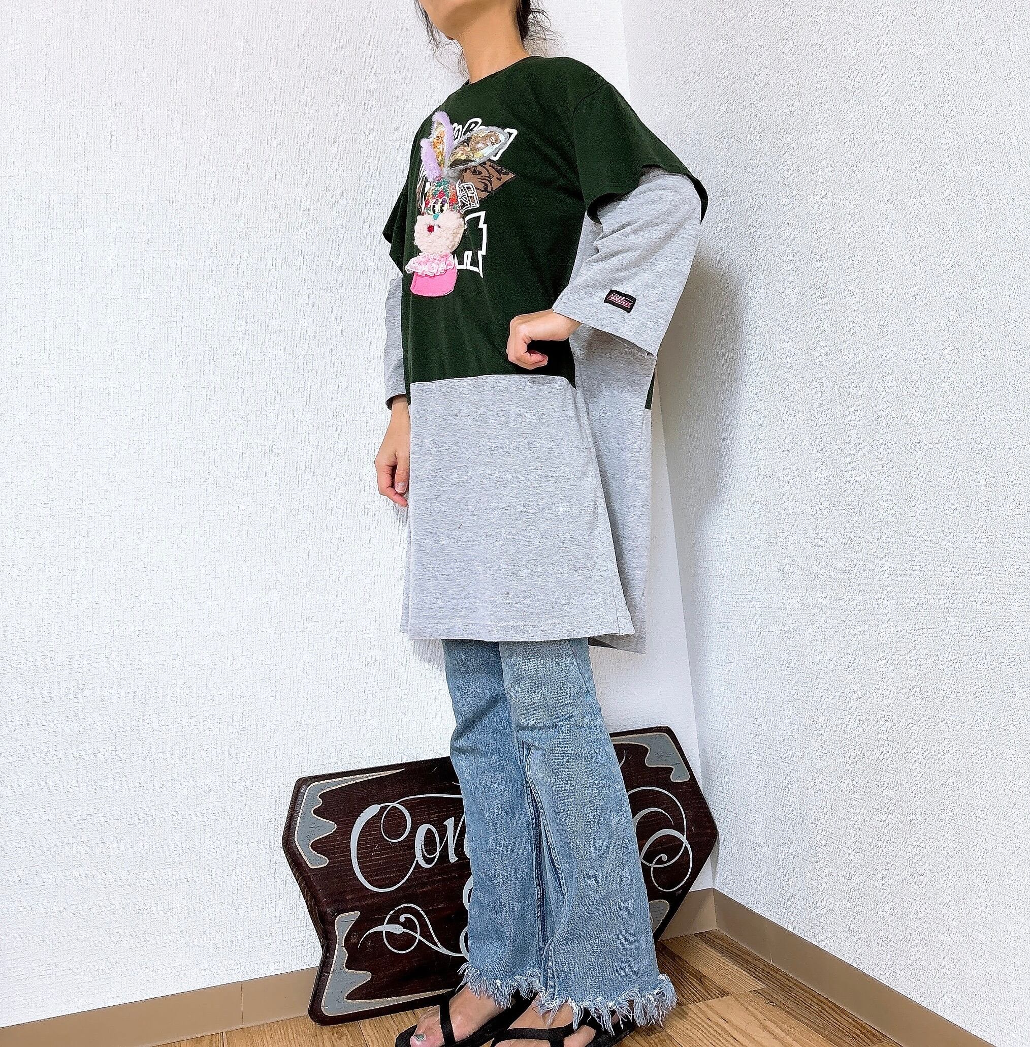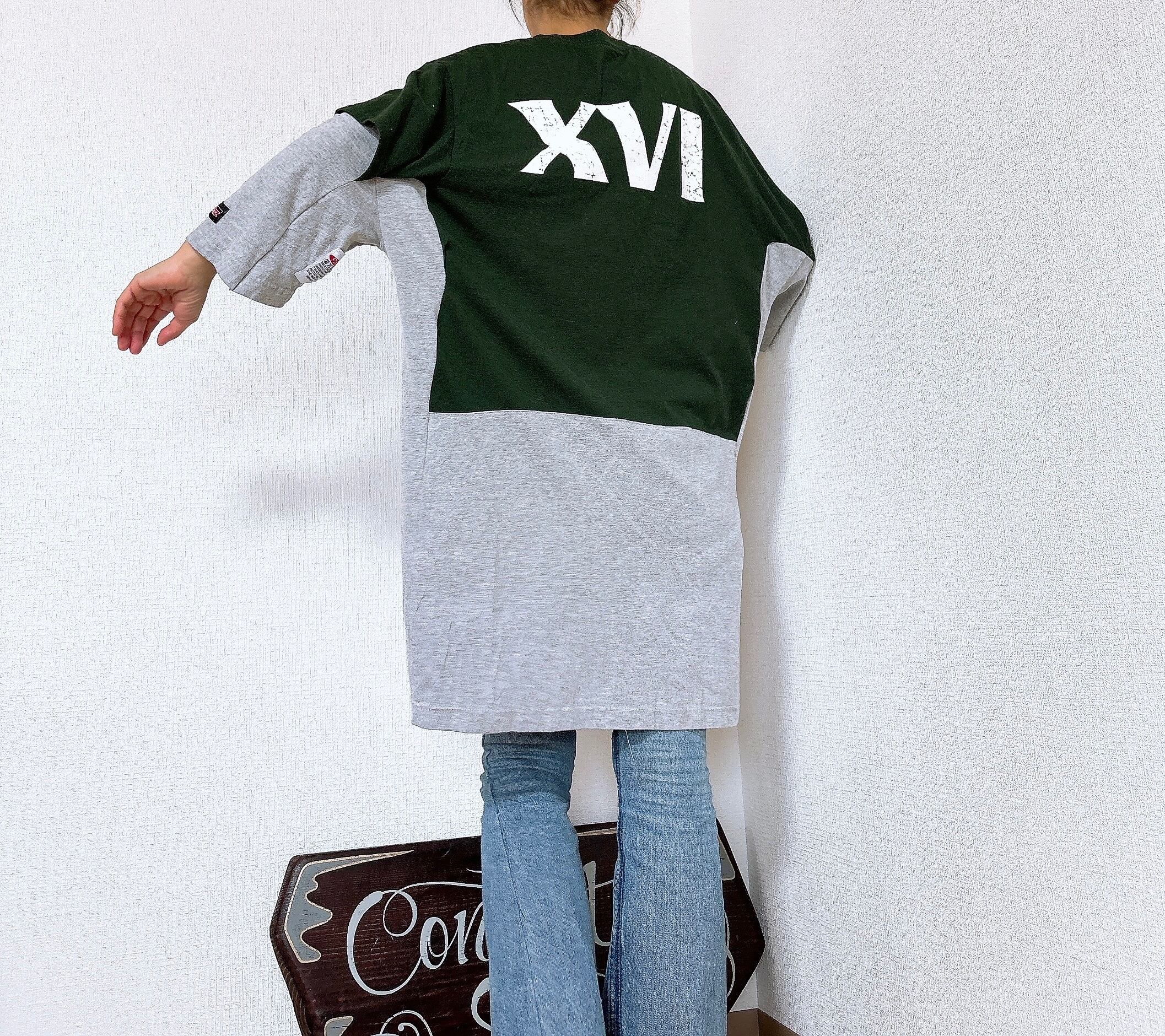 小さいteeと大きなteeを繋げて縦長のシルエットにしました。