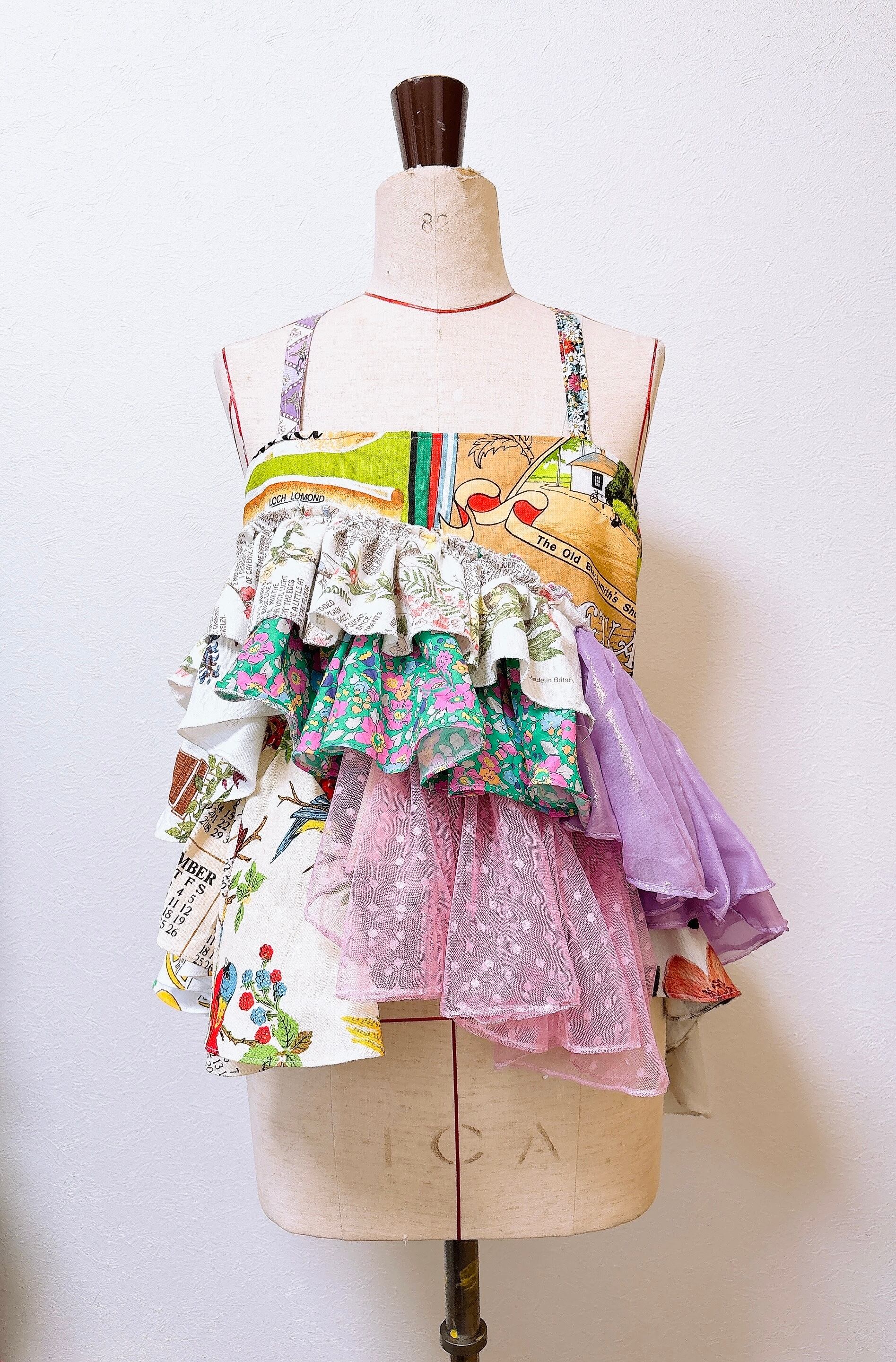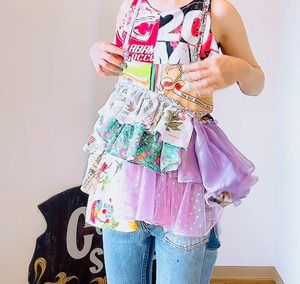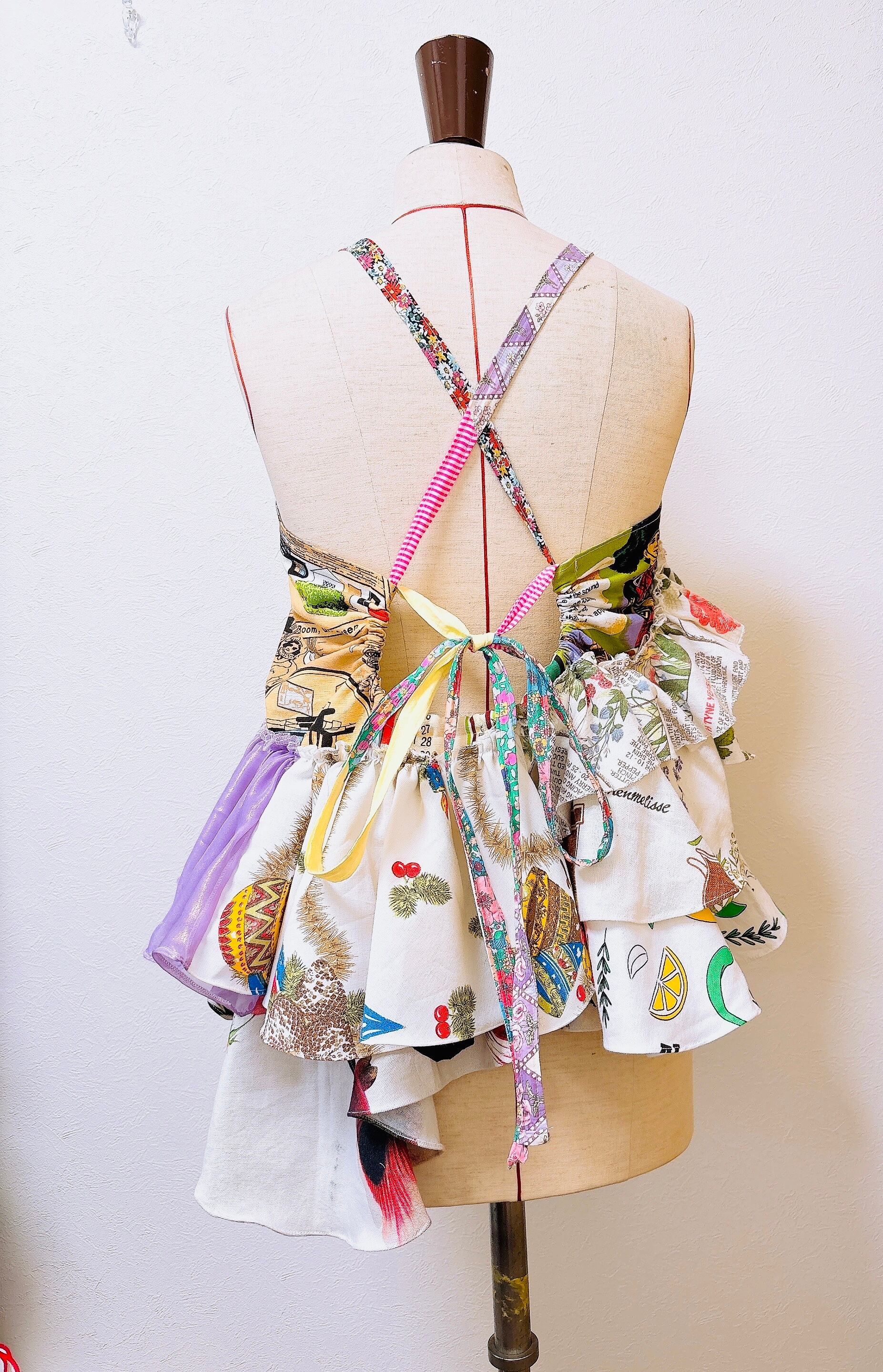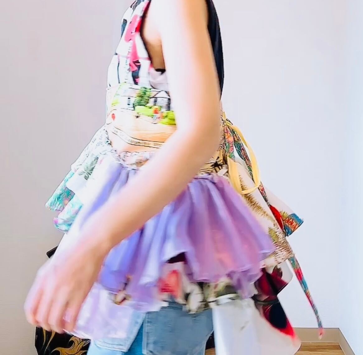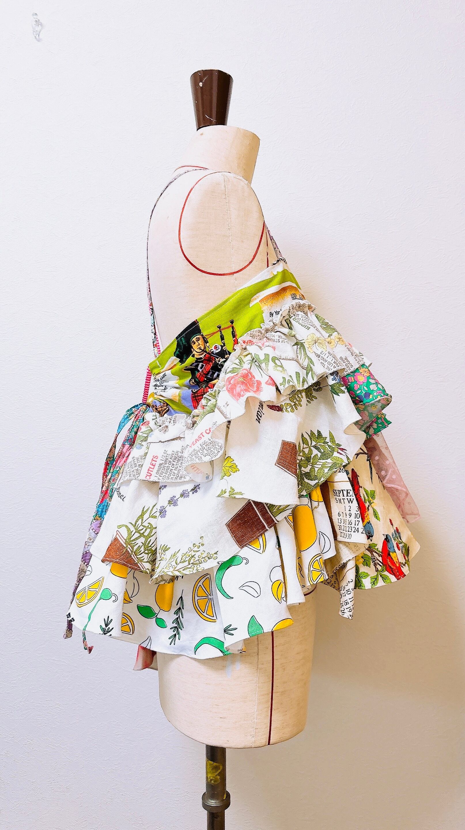 異素材で、トレンドのアシメトリーヘムを採用した華やかなフリルビスチェを作りました。