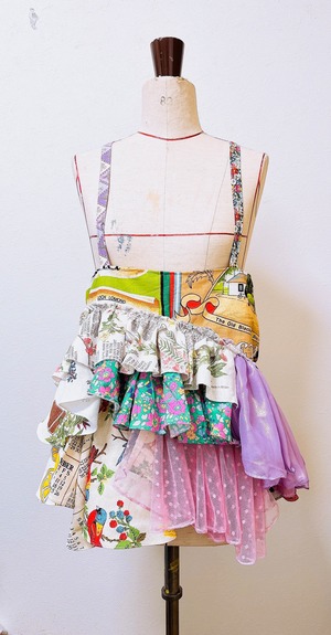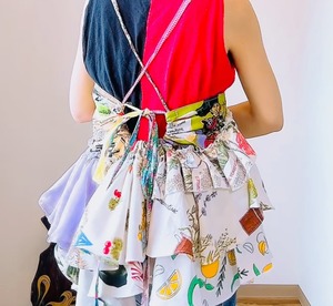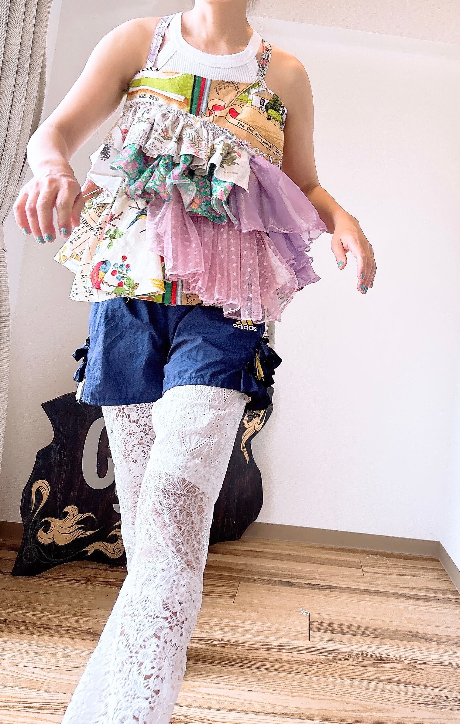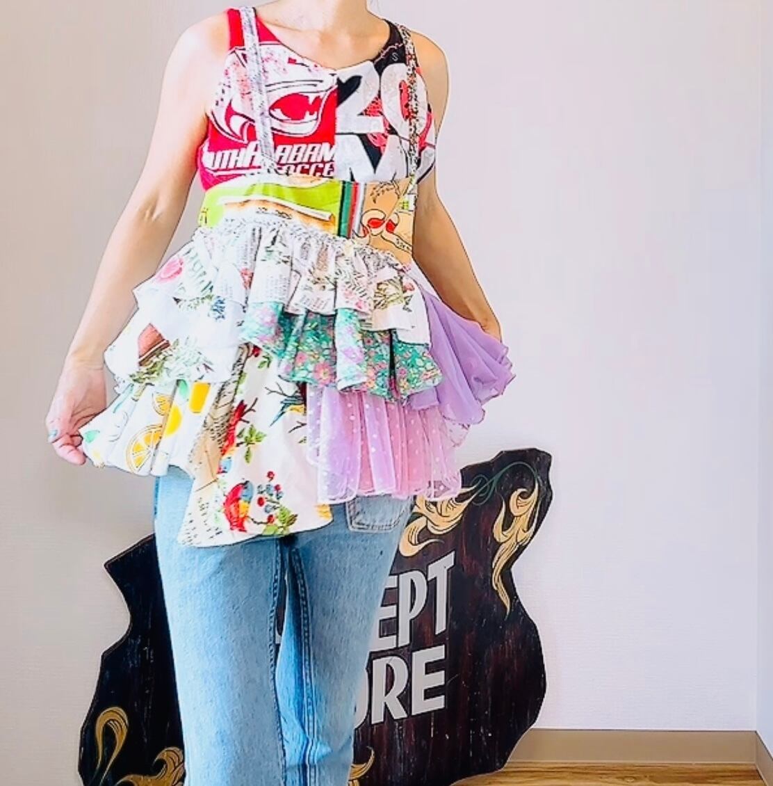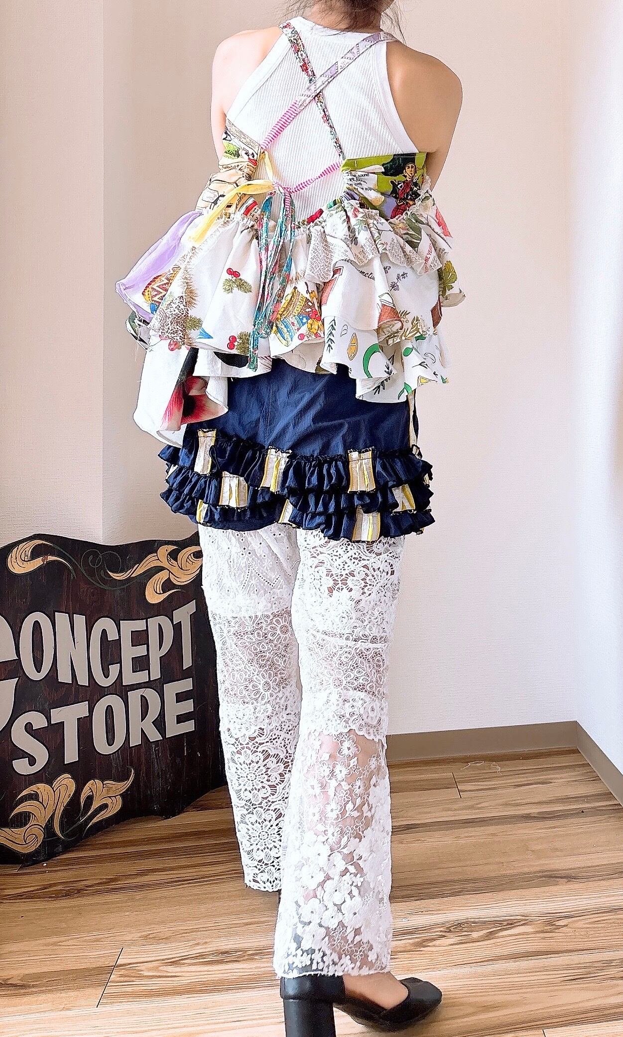 異素材で、トレンドのアシメトリーヘムを採用した華やかなフリルビスチェを作りました。