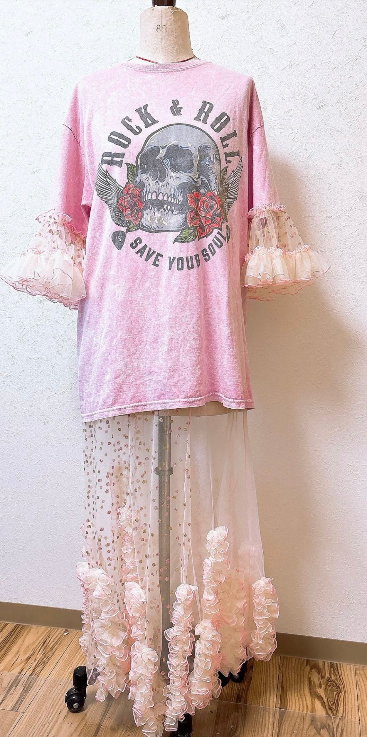 teeは全部出してもフリルが邪魔しないから無理に入れなくてもコーデが決まります。