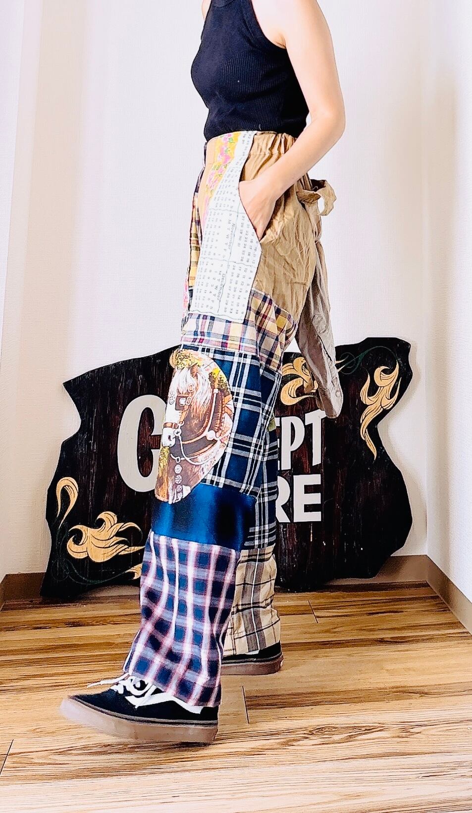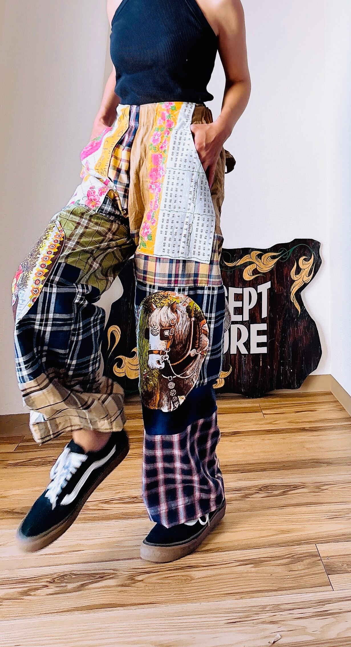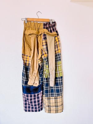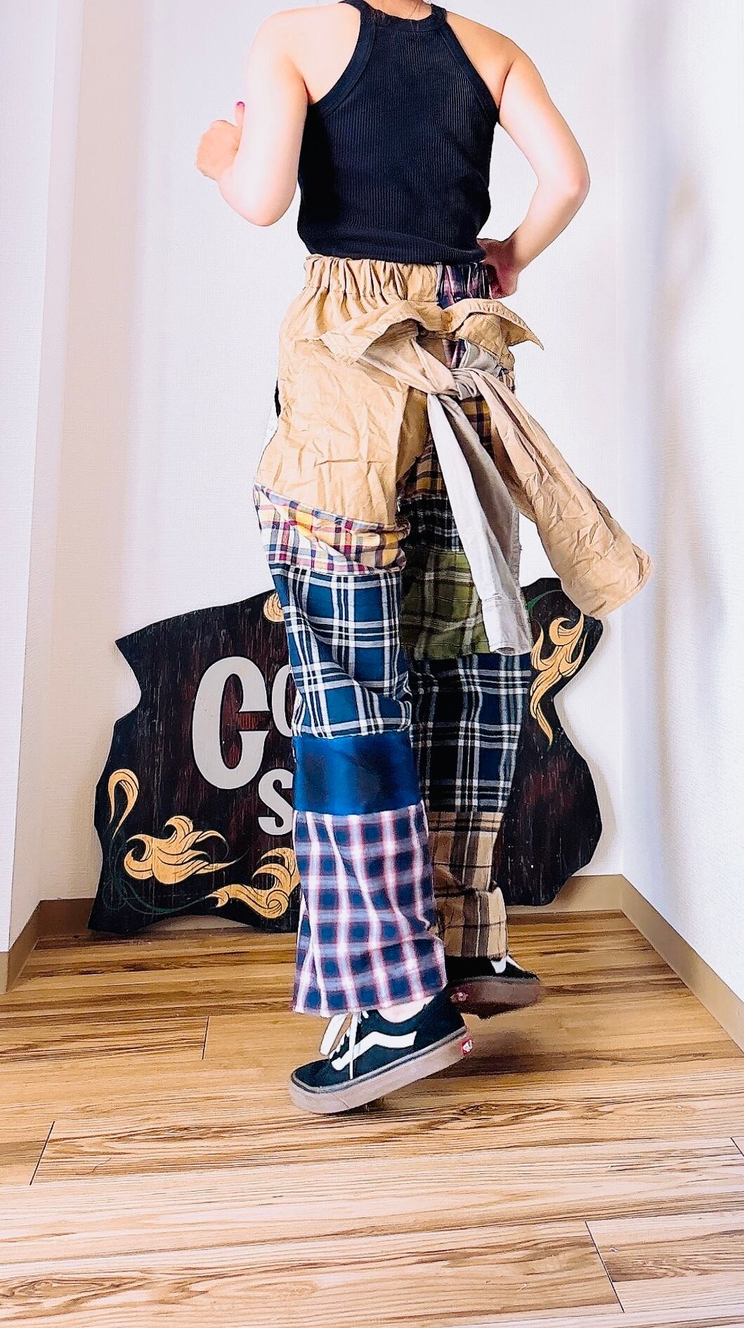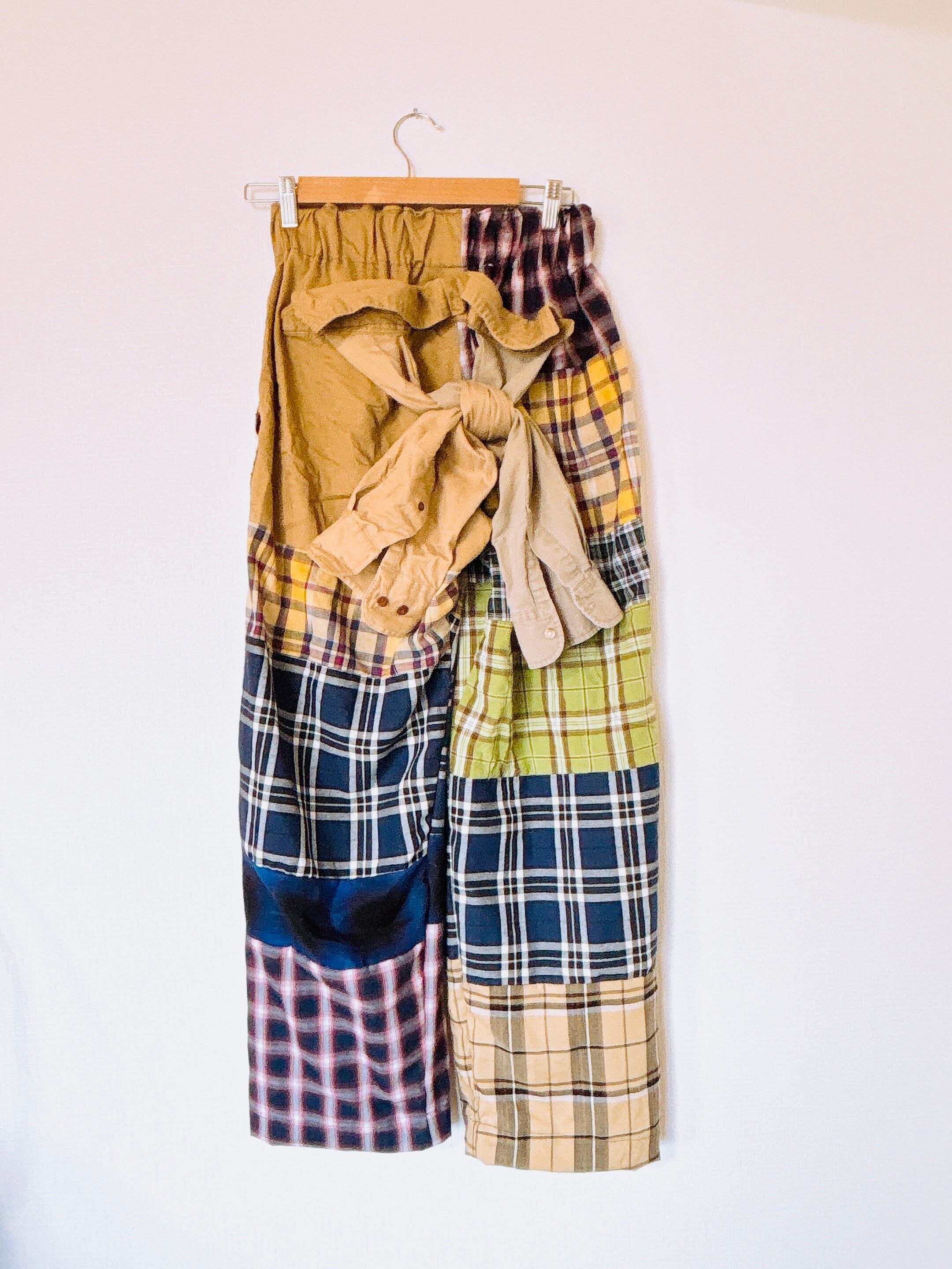 膝にパッチワークして、後ろにミリタリーシャツの袖をつけたパンツにしました。