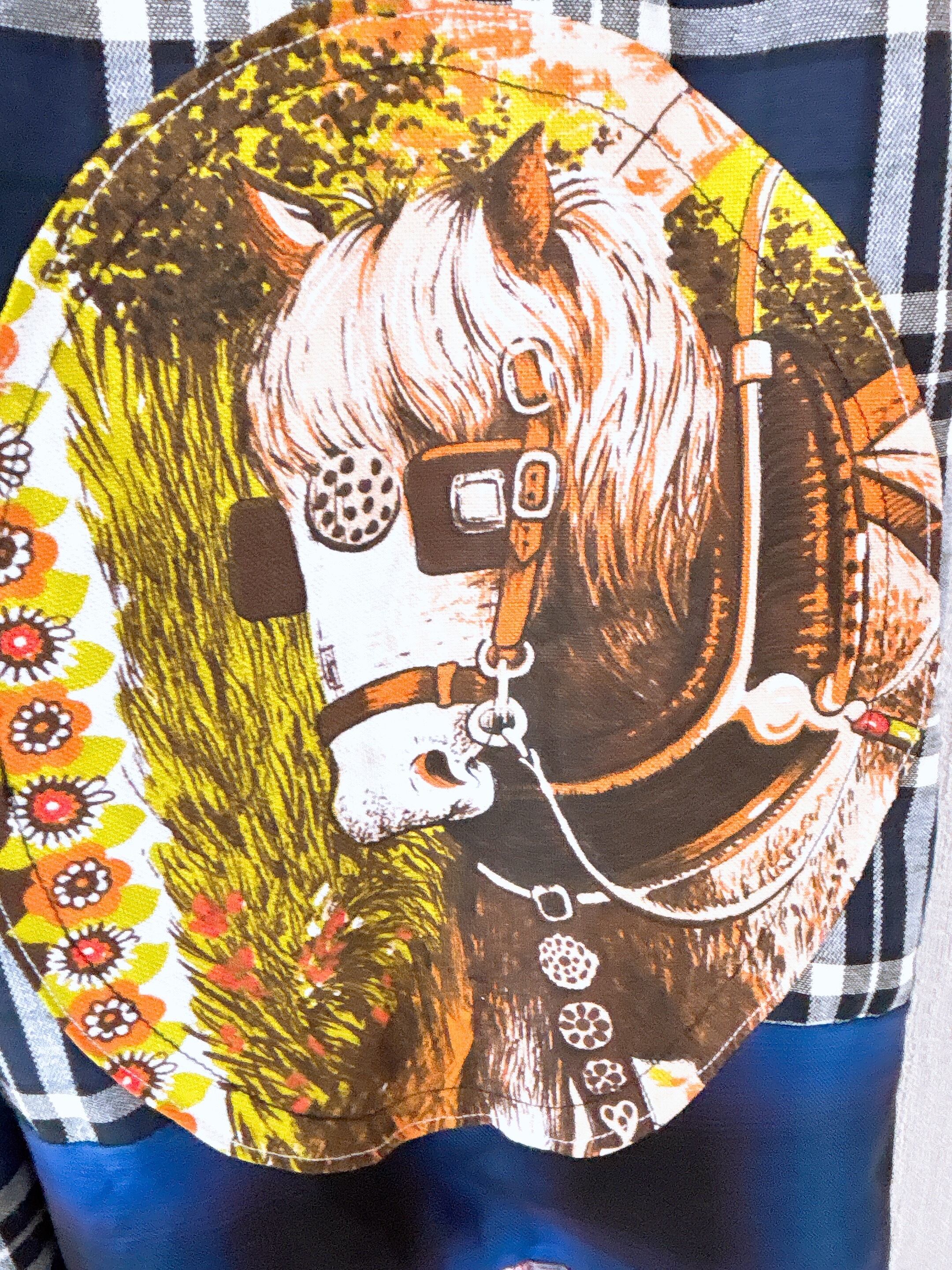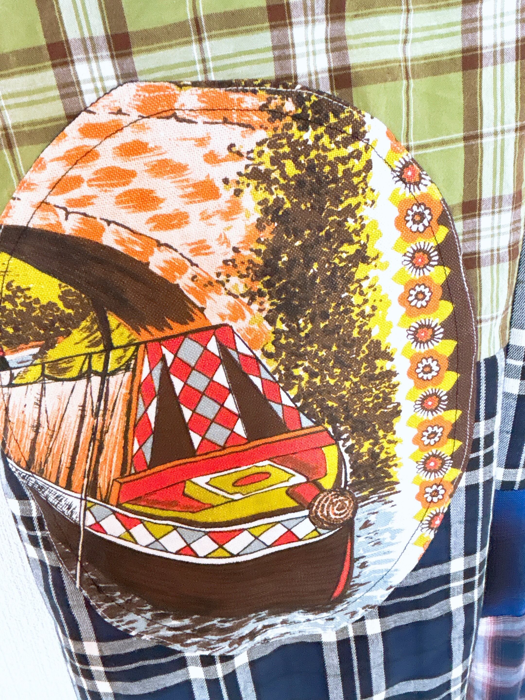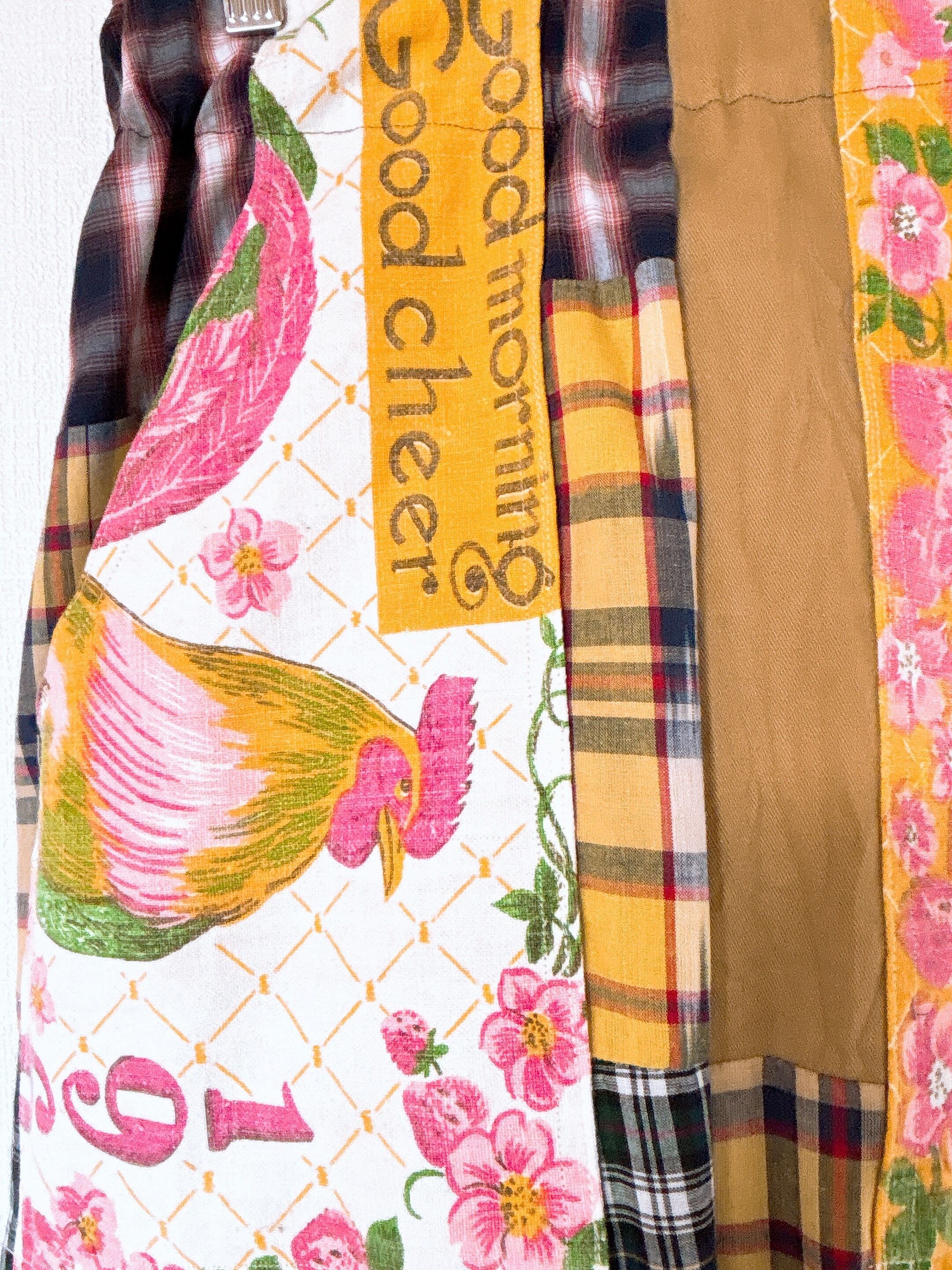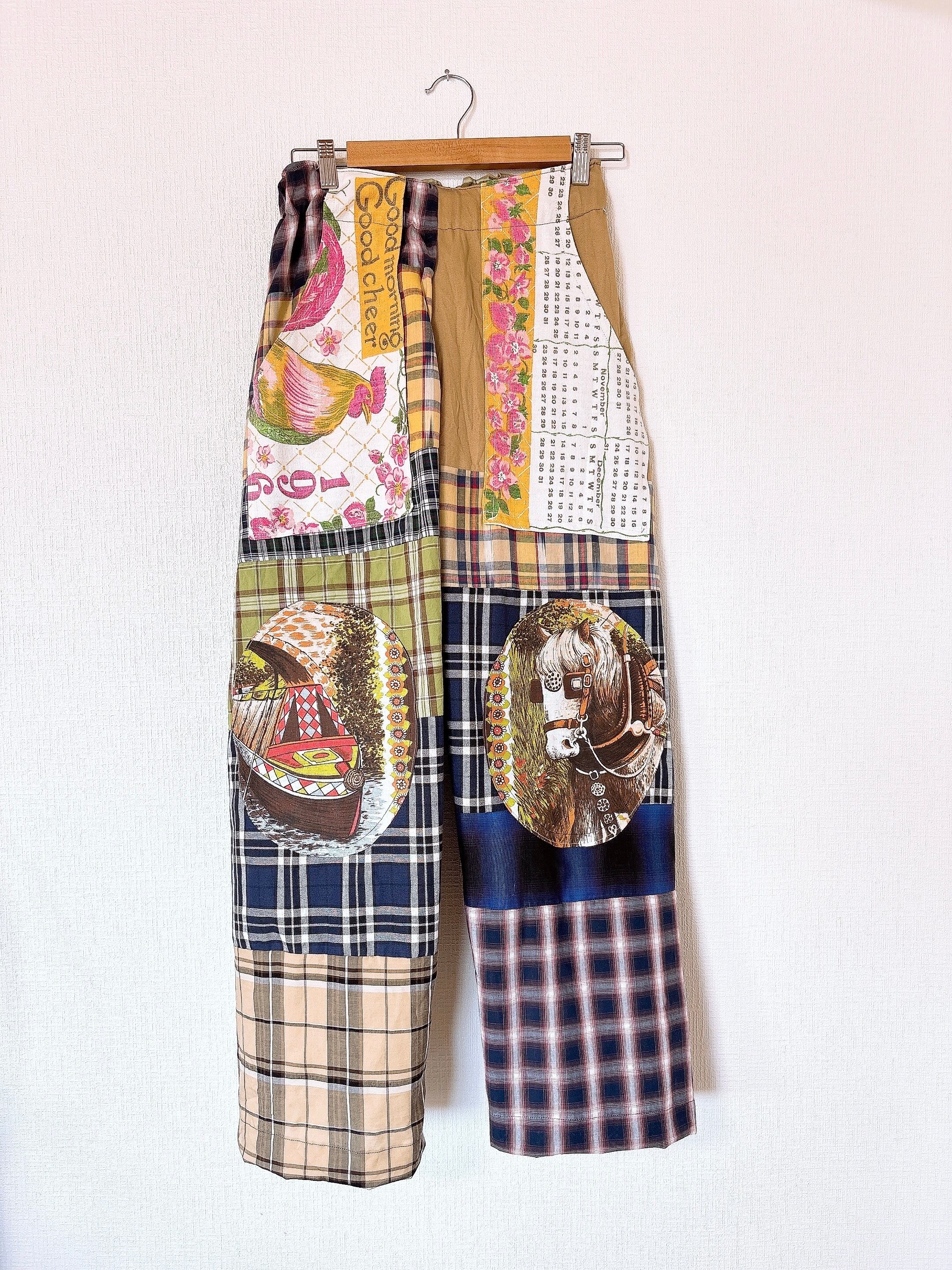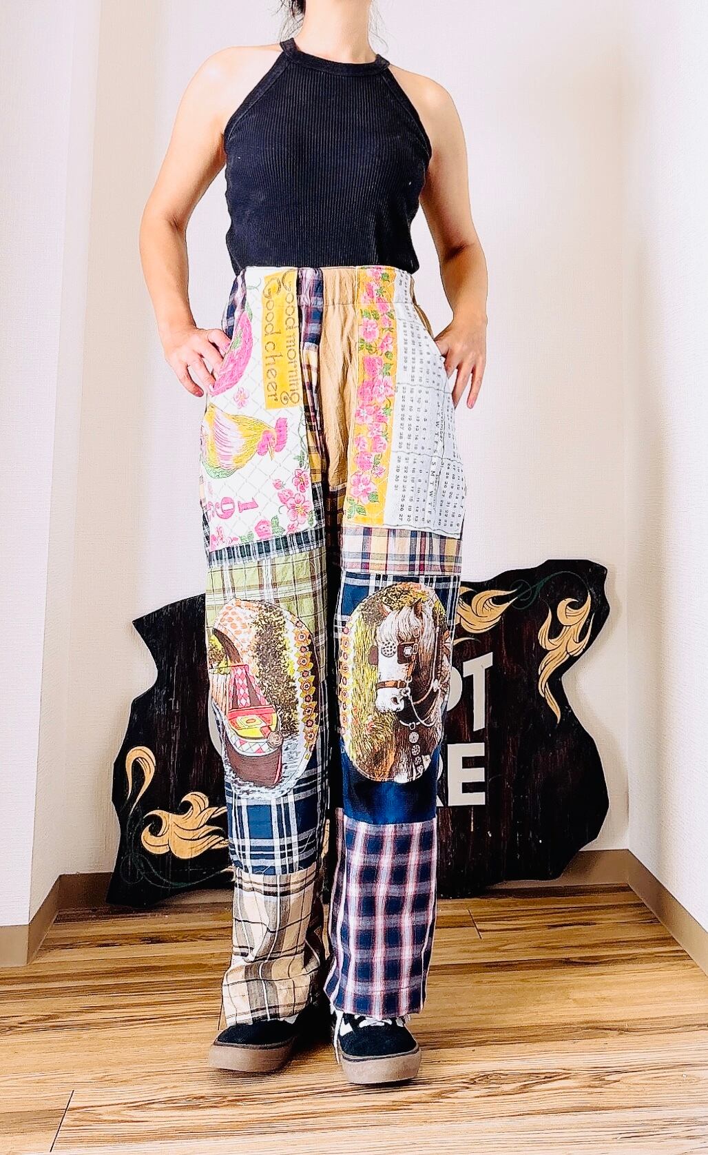 膝にパッチワークして、後ろにミリタリーシャツの袖をつけたパンツにしました。