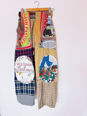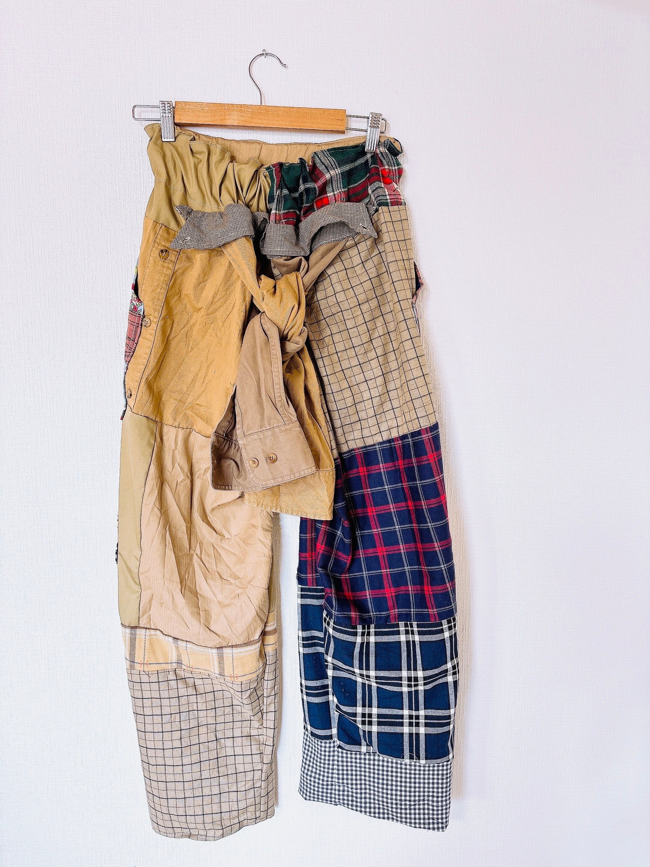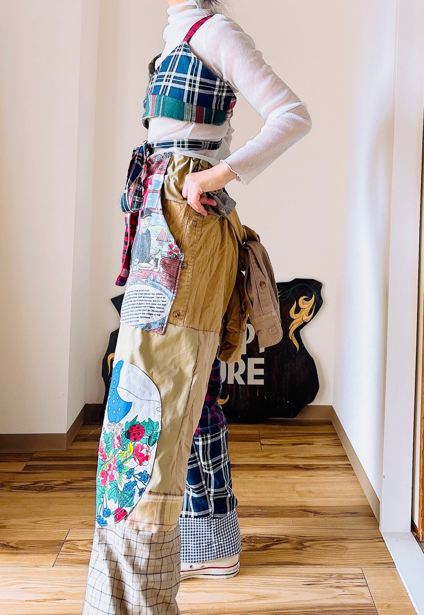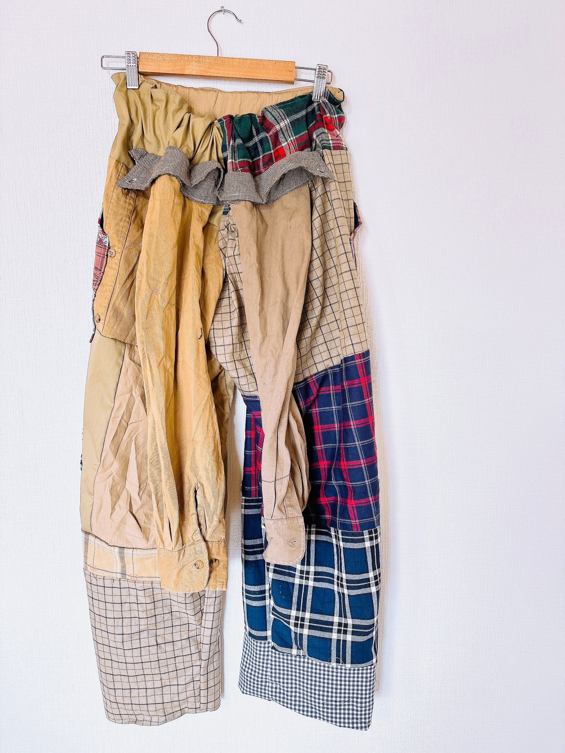膝にパッチワークして、後ろにミリタリーシャツの袖をつけたパンツにしました。