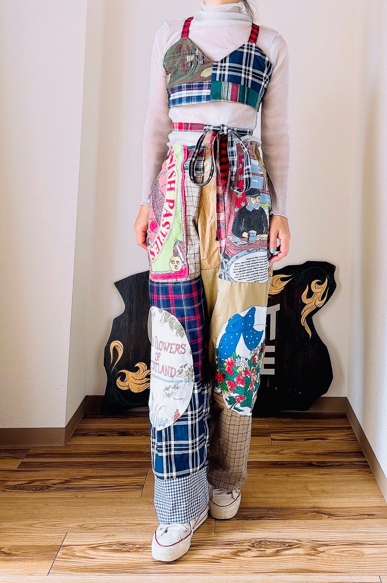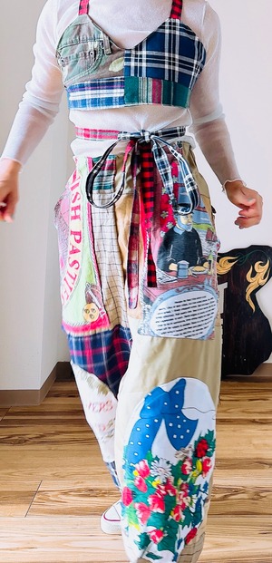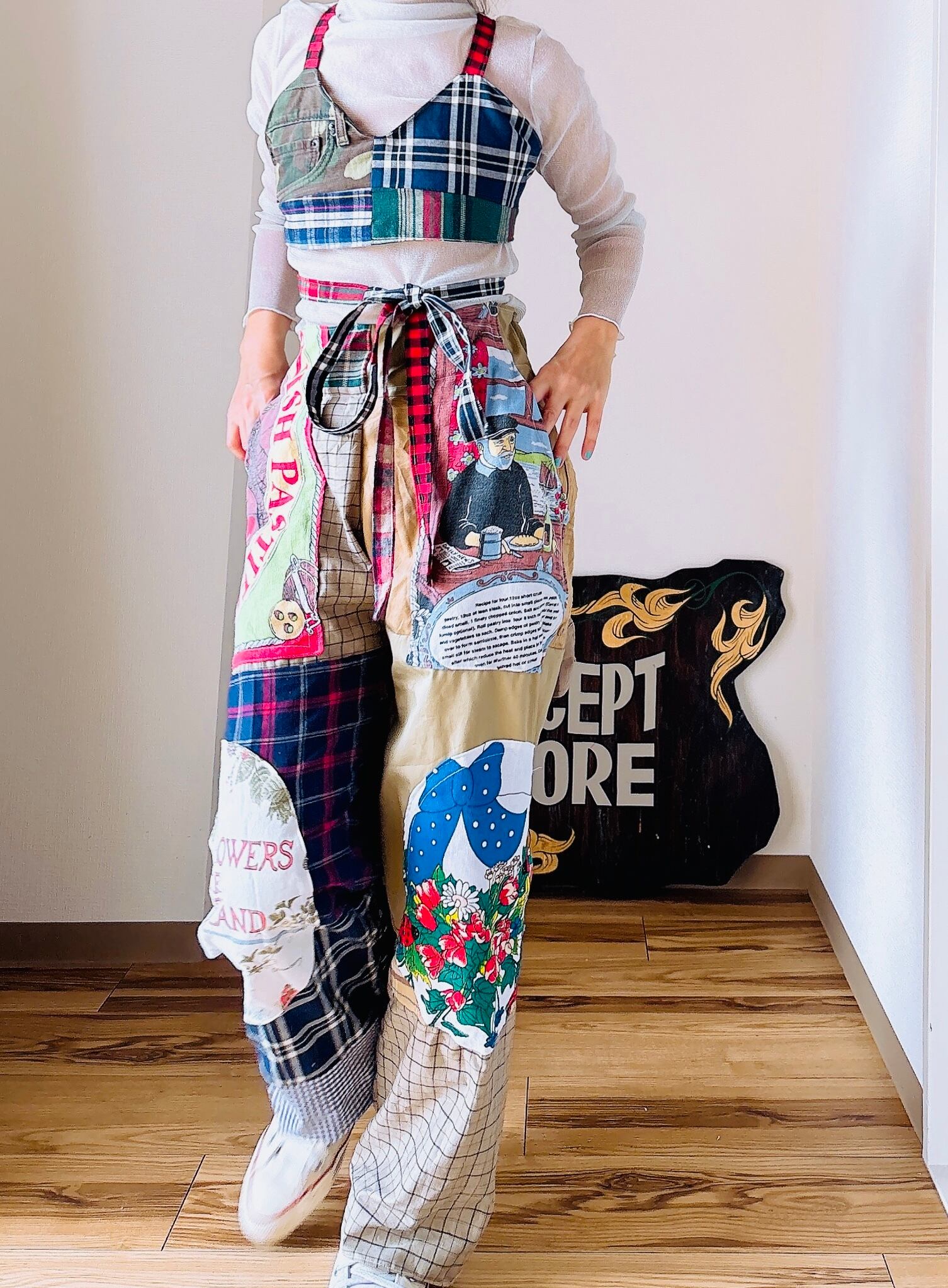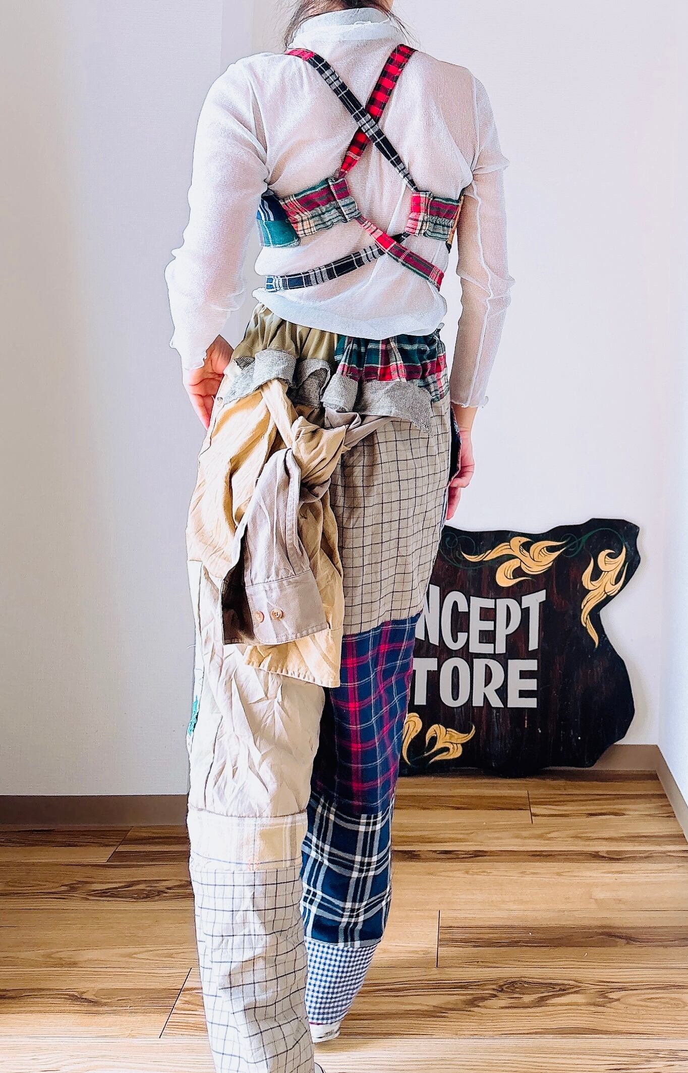 膝にパッチワークして、後ろにミリタリーシャツの袖をつけたパンツにしました。