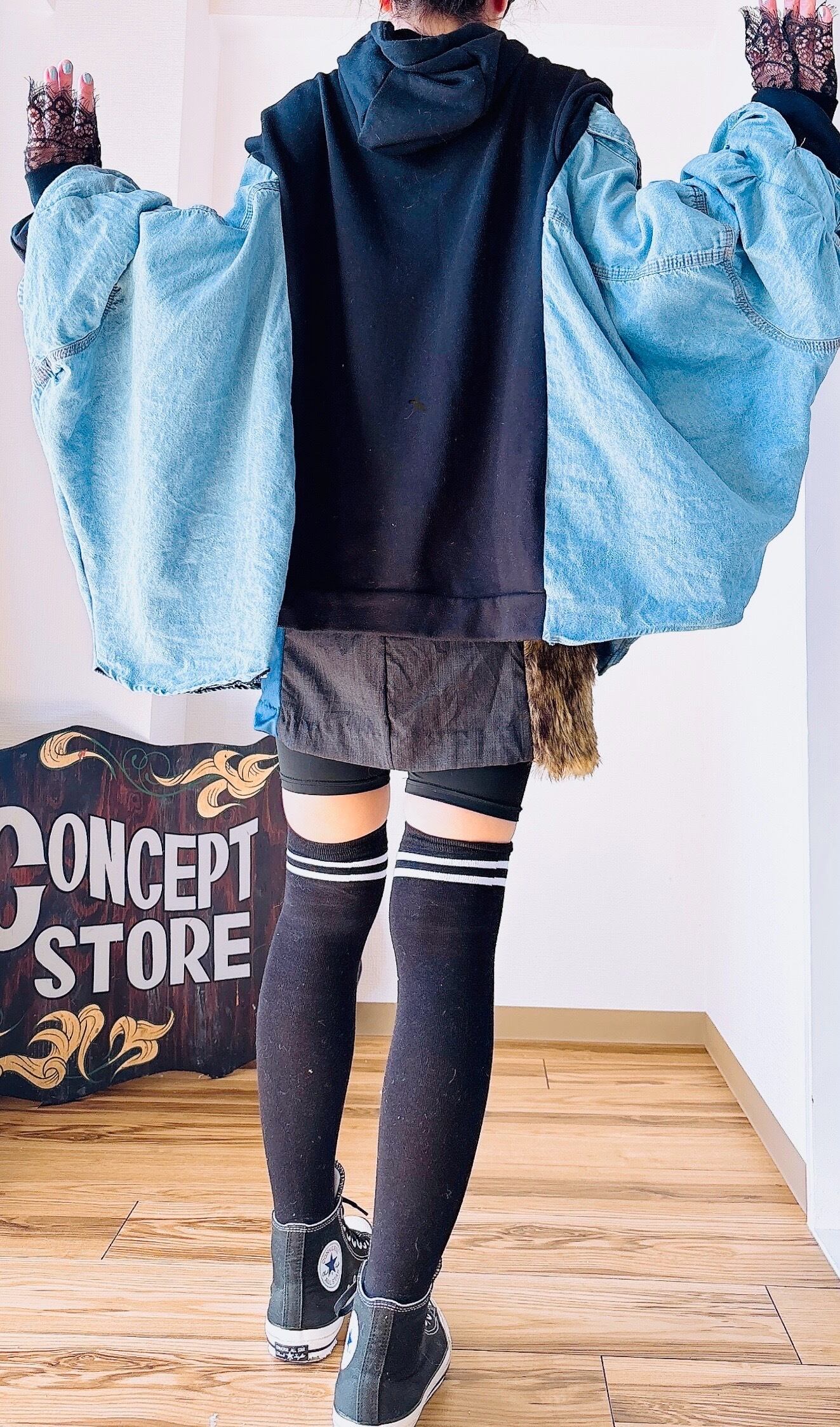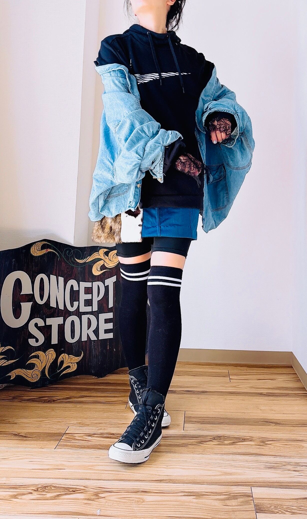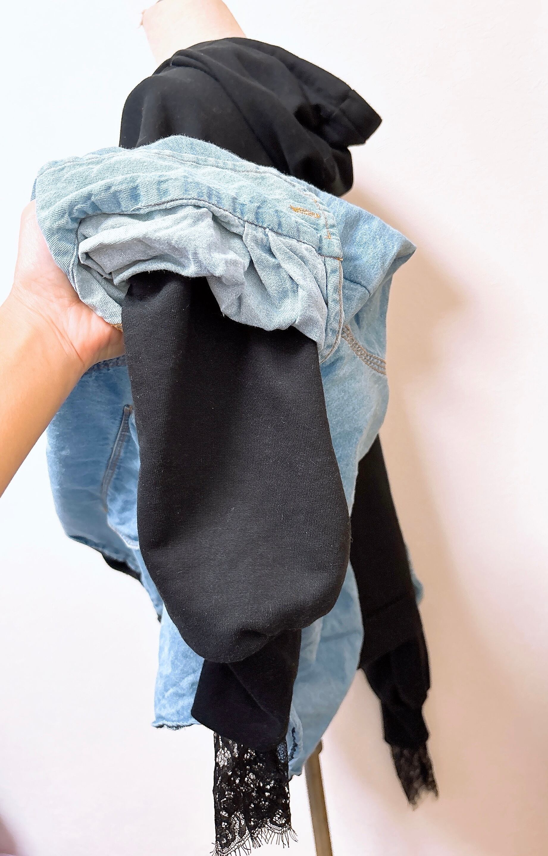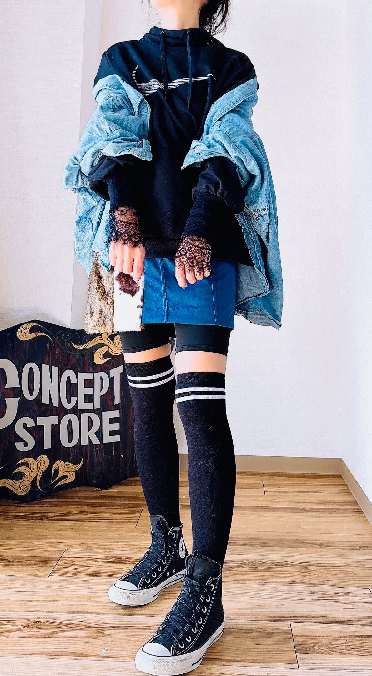 デニムシャツの下からパフ袖が見えて更にストレッチレースが見える小技が聞いたレイヤード。