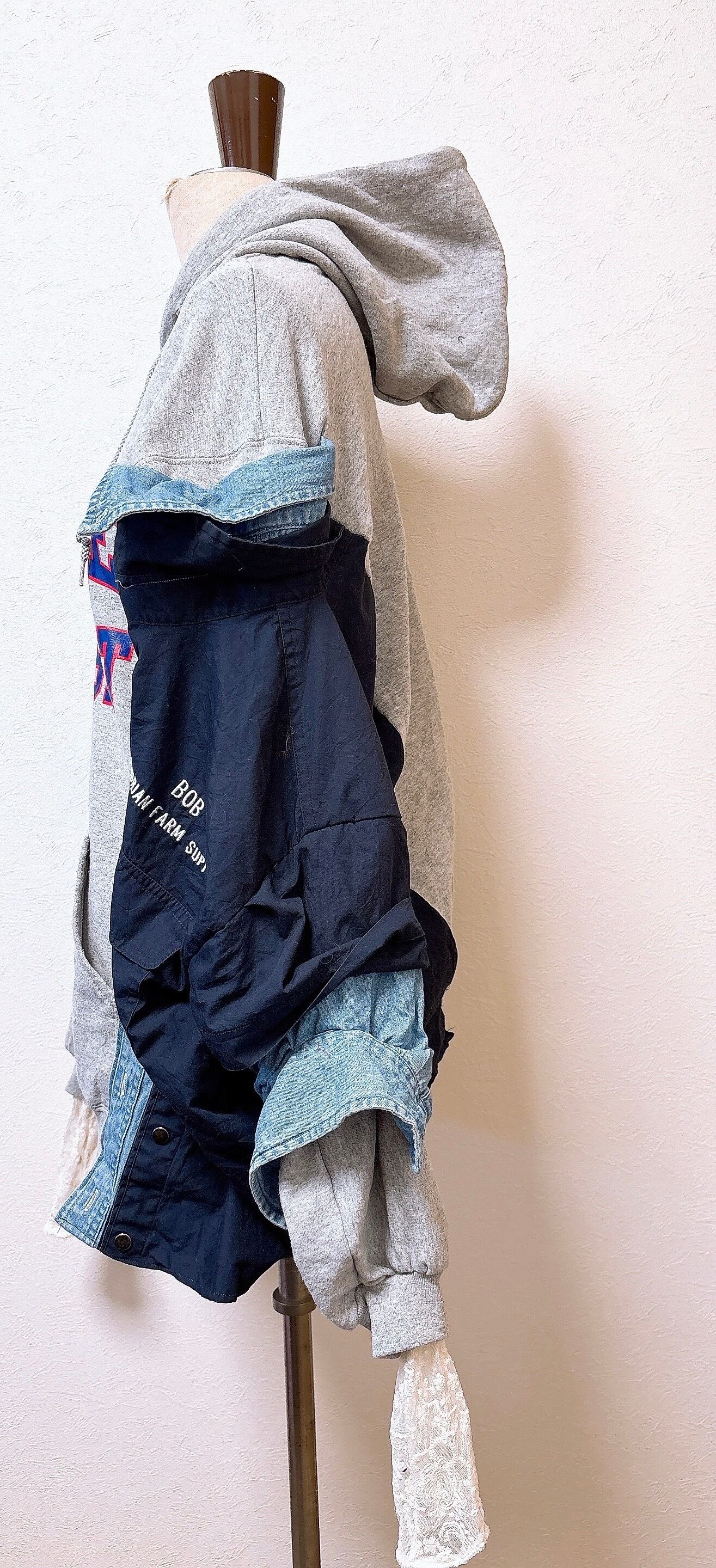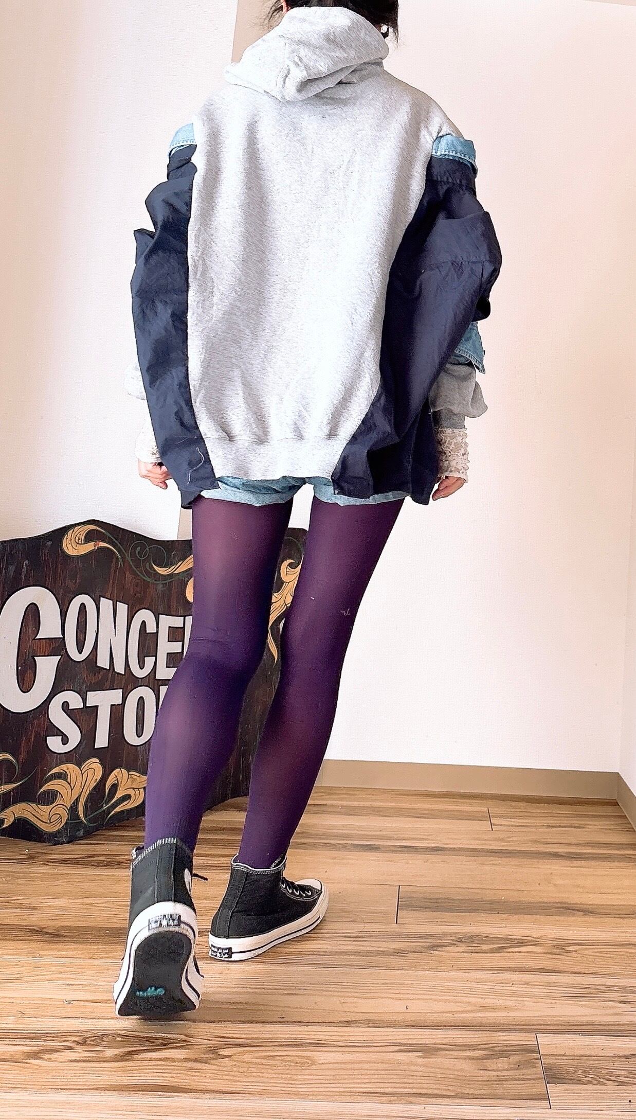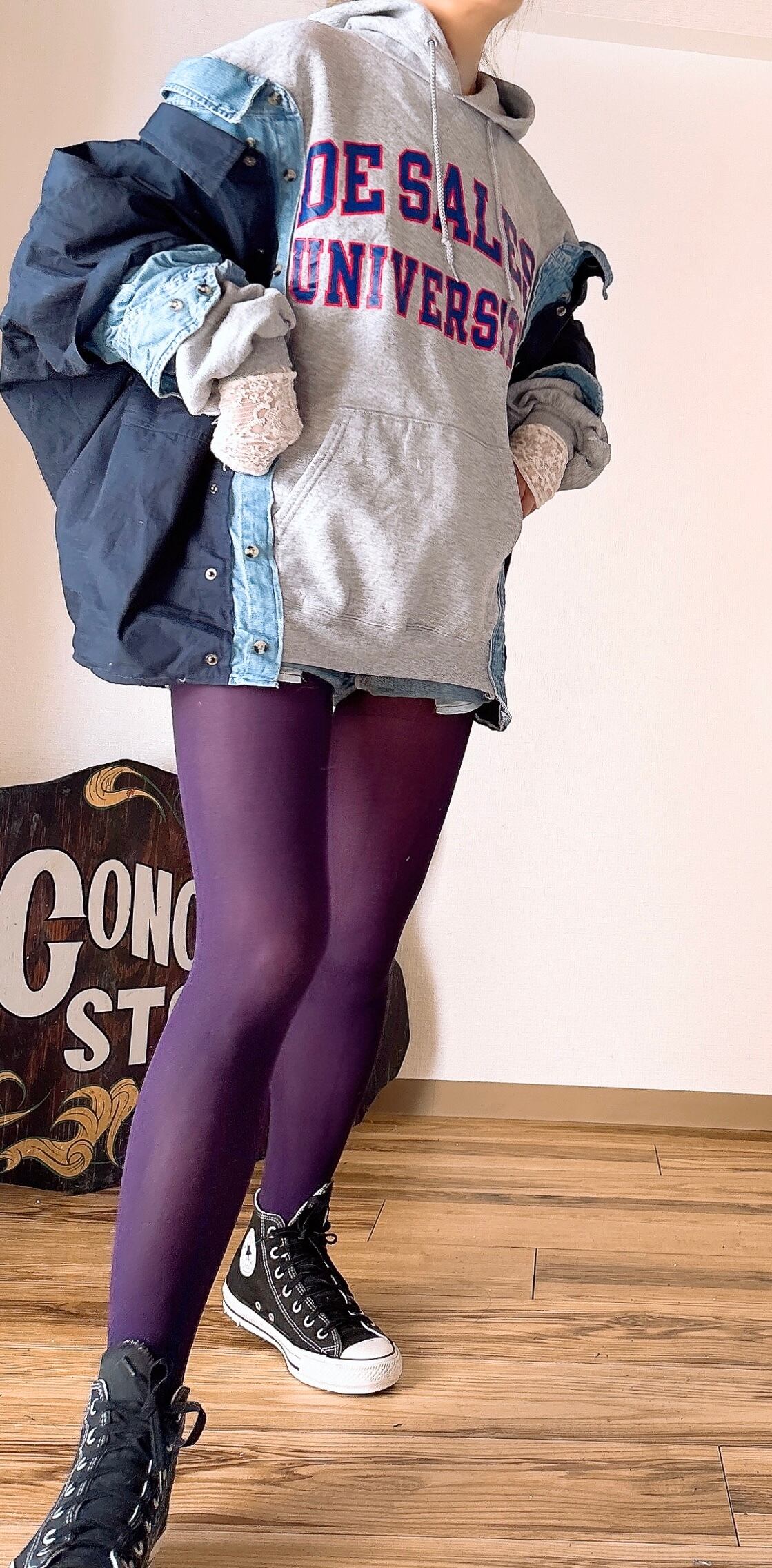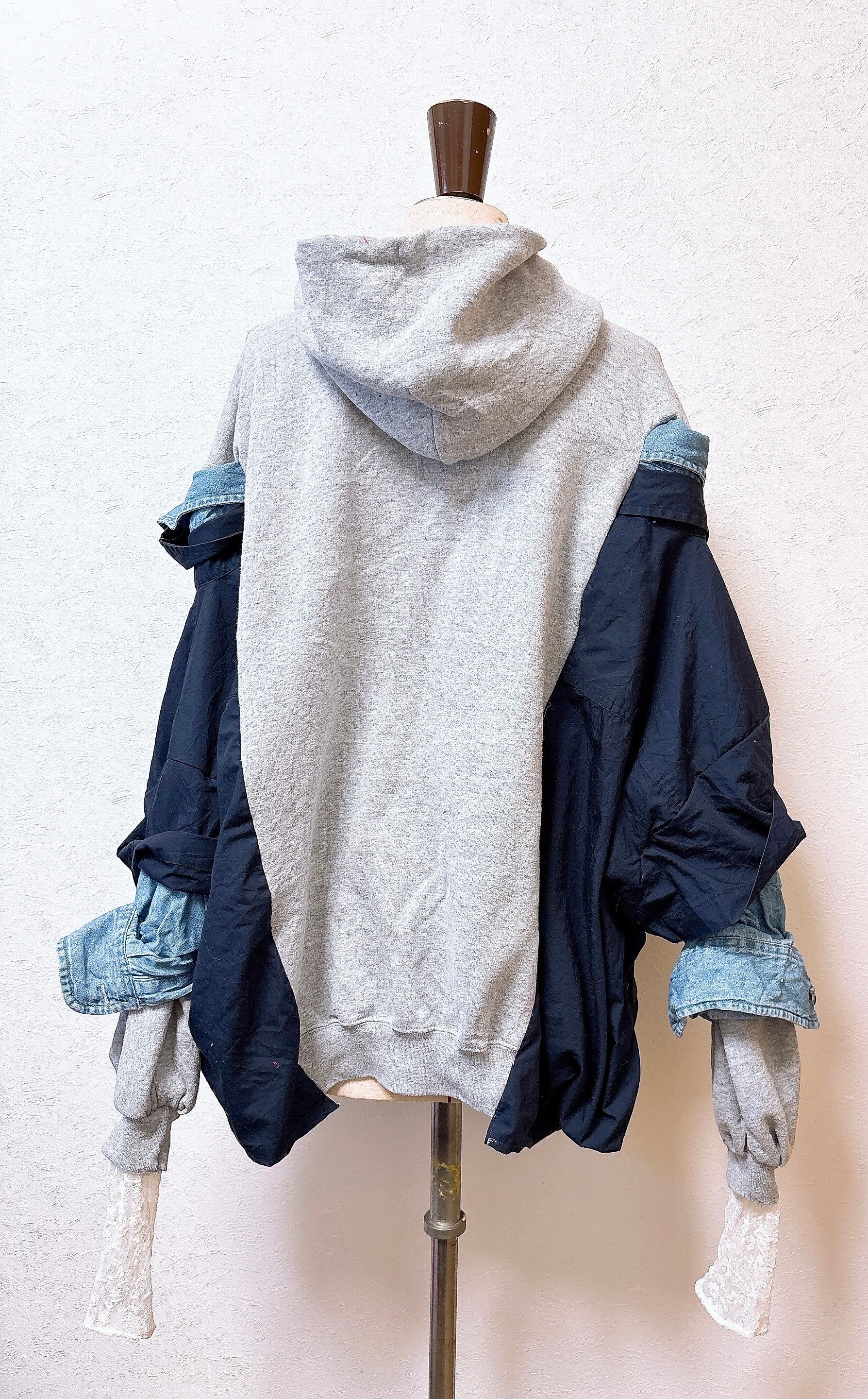 メンズシャツの下からパフ袖が見えて更にストレッチレースが見える小技が聞いたレイヤード。
