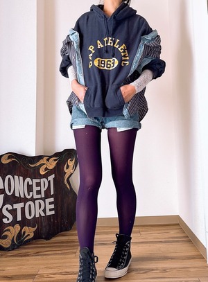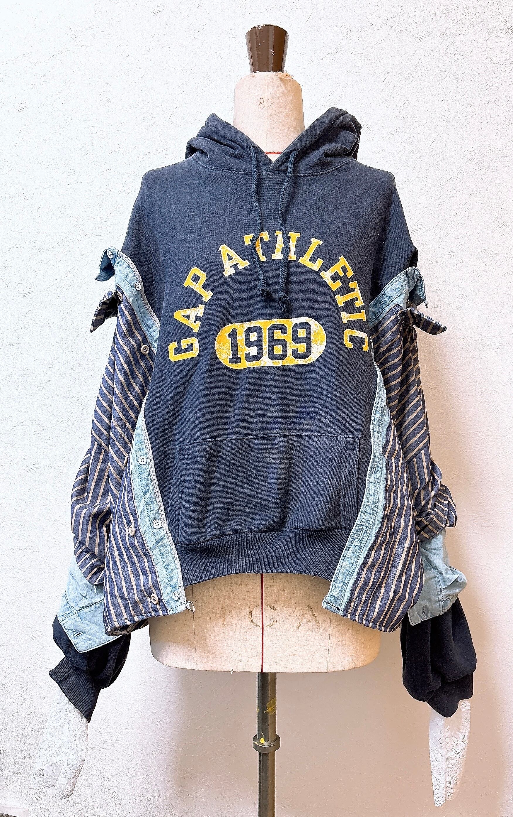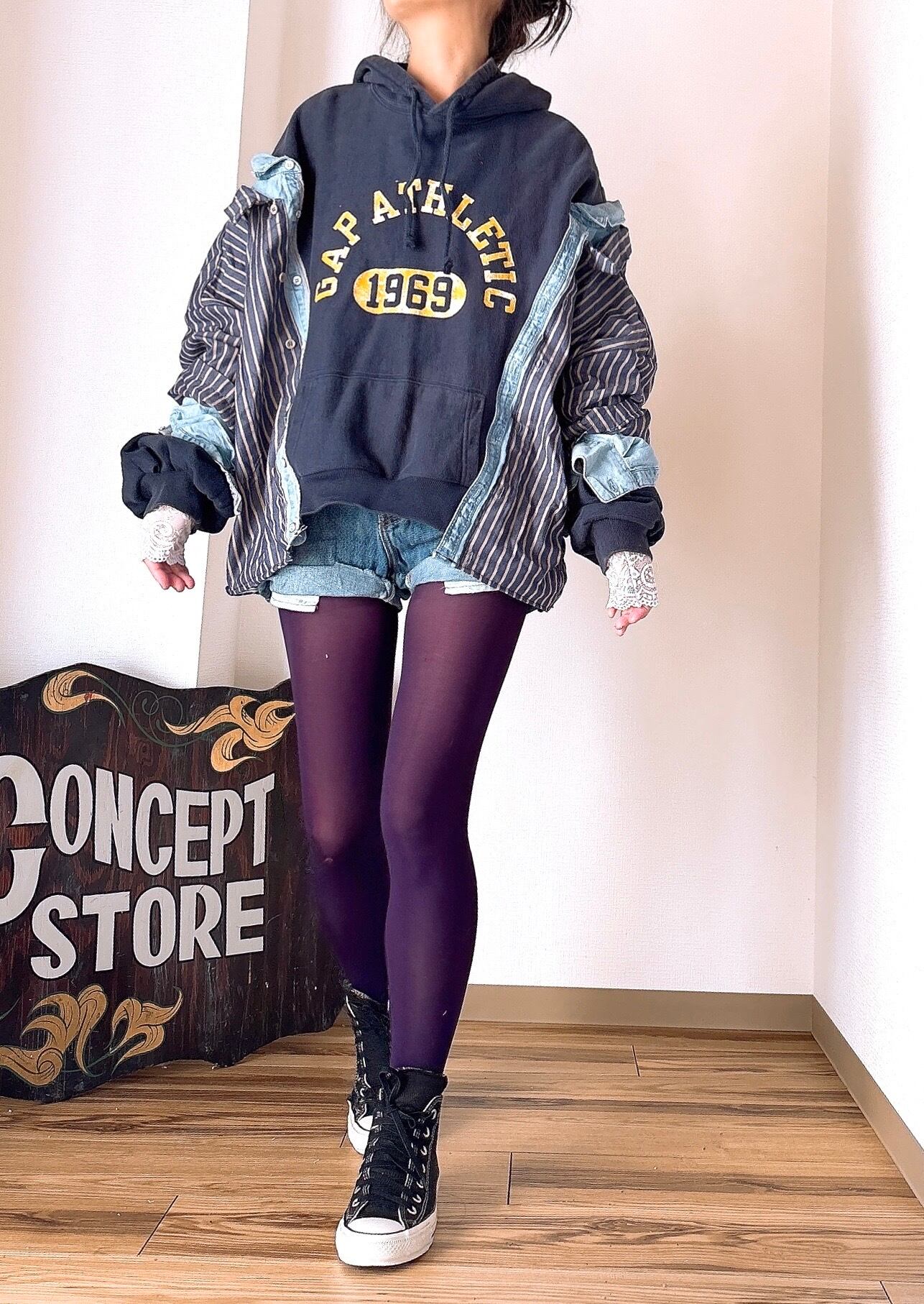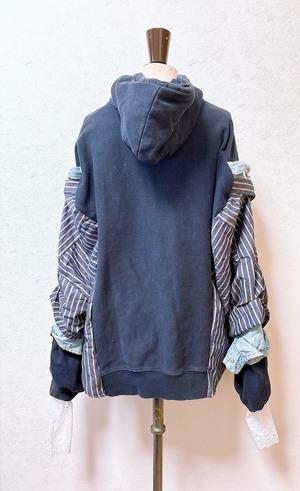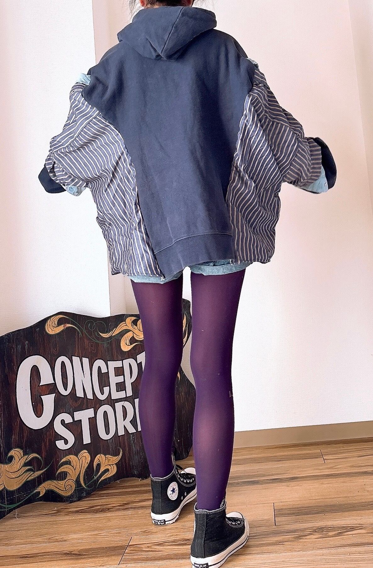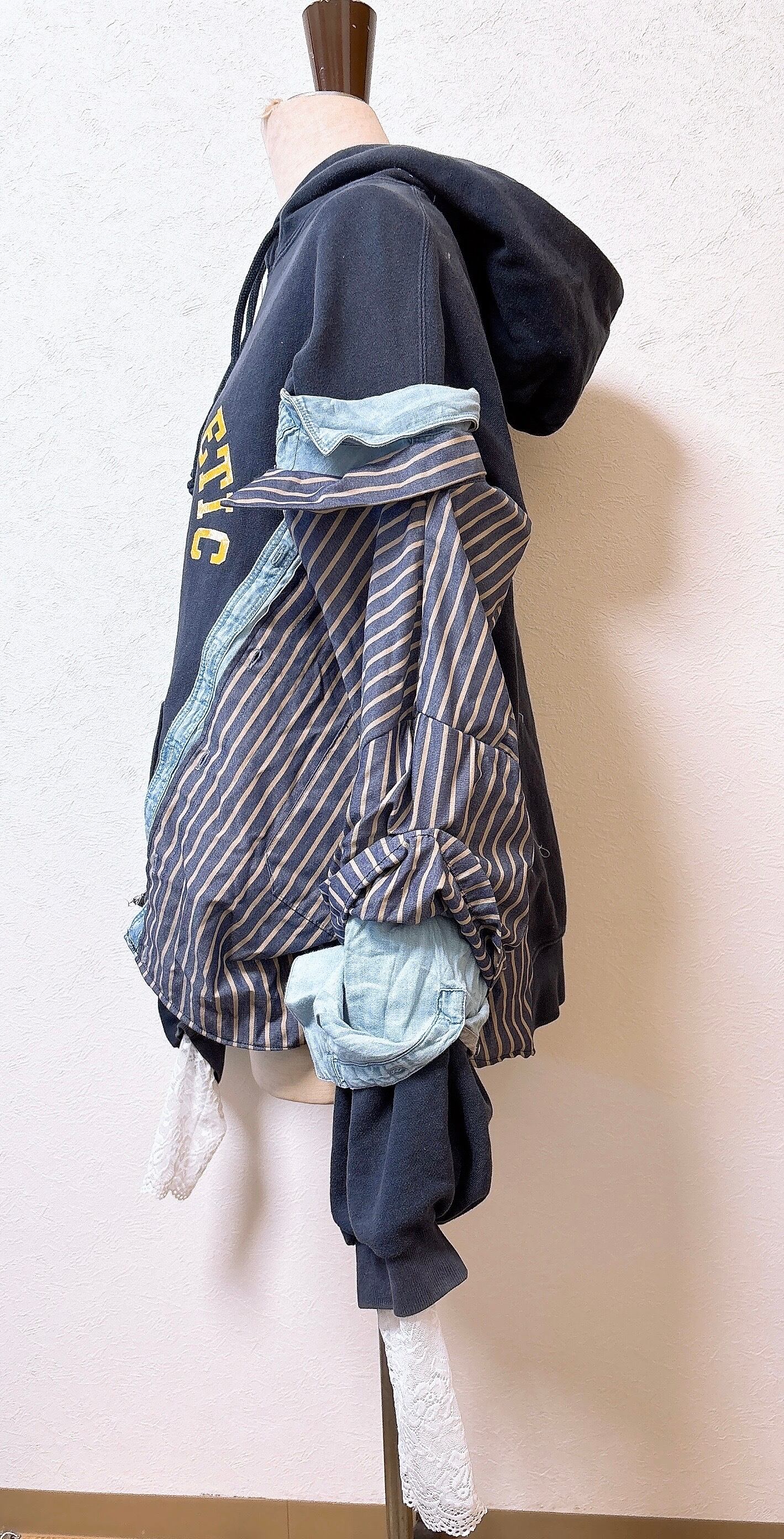 メンズシャツの下からパフ袖が見えて更にストレッチレースが見える小技が聞いたレイヤード。