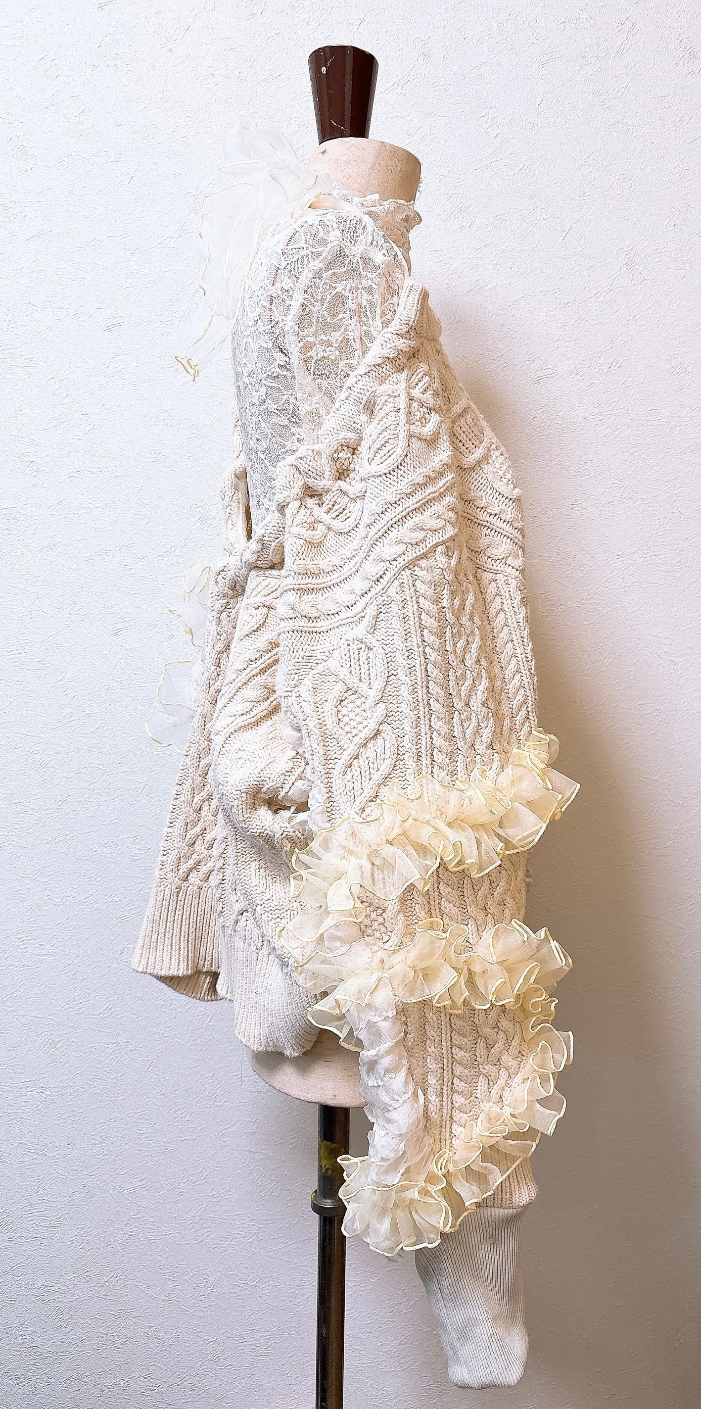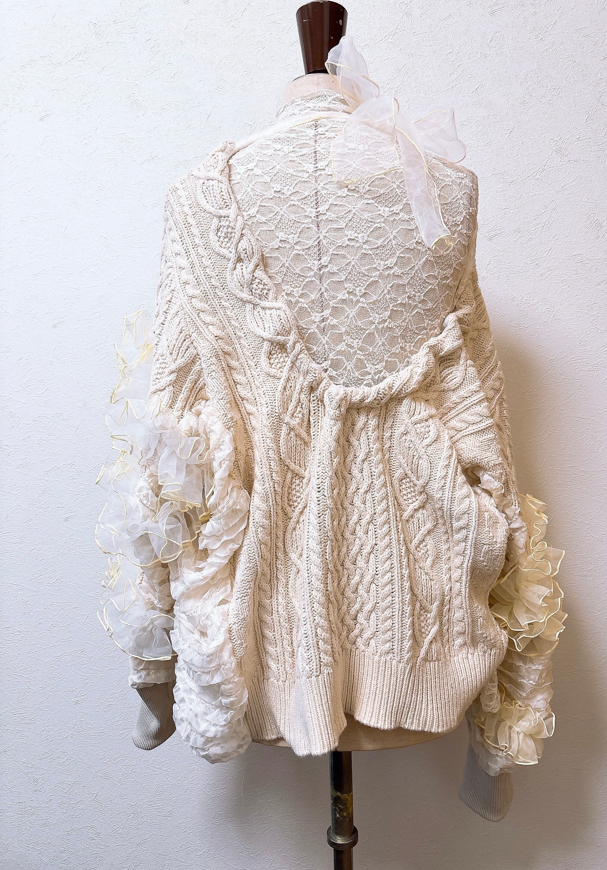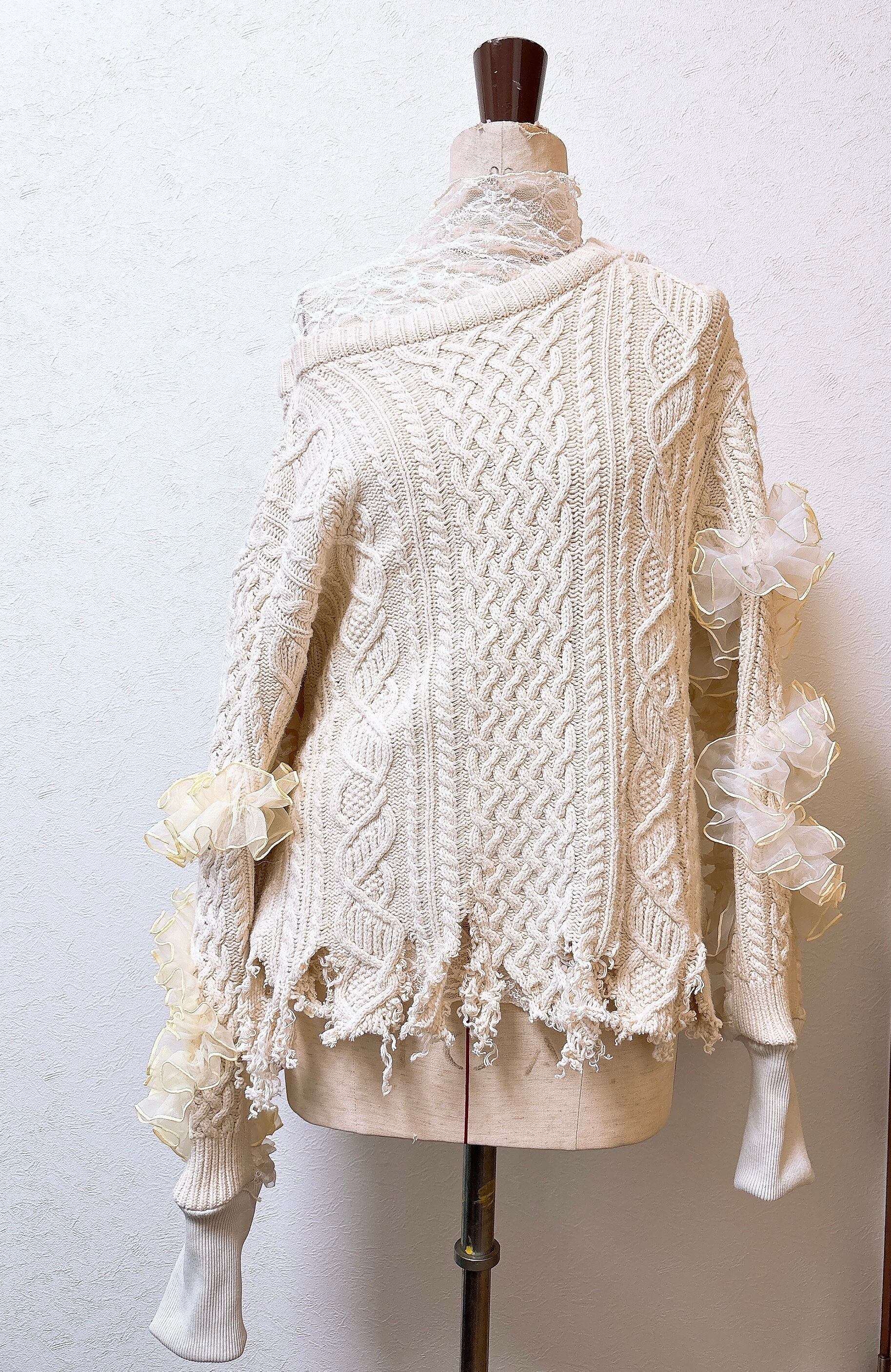古着のアランニットをバックオープンにしてオーガンジーをつけました。