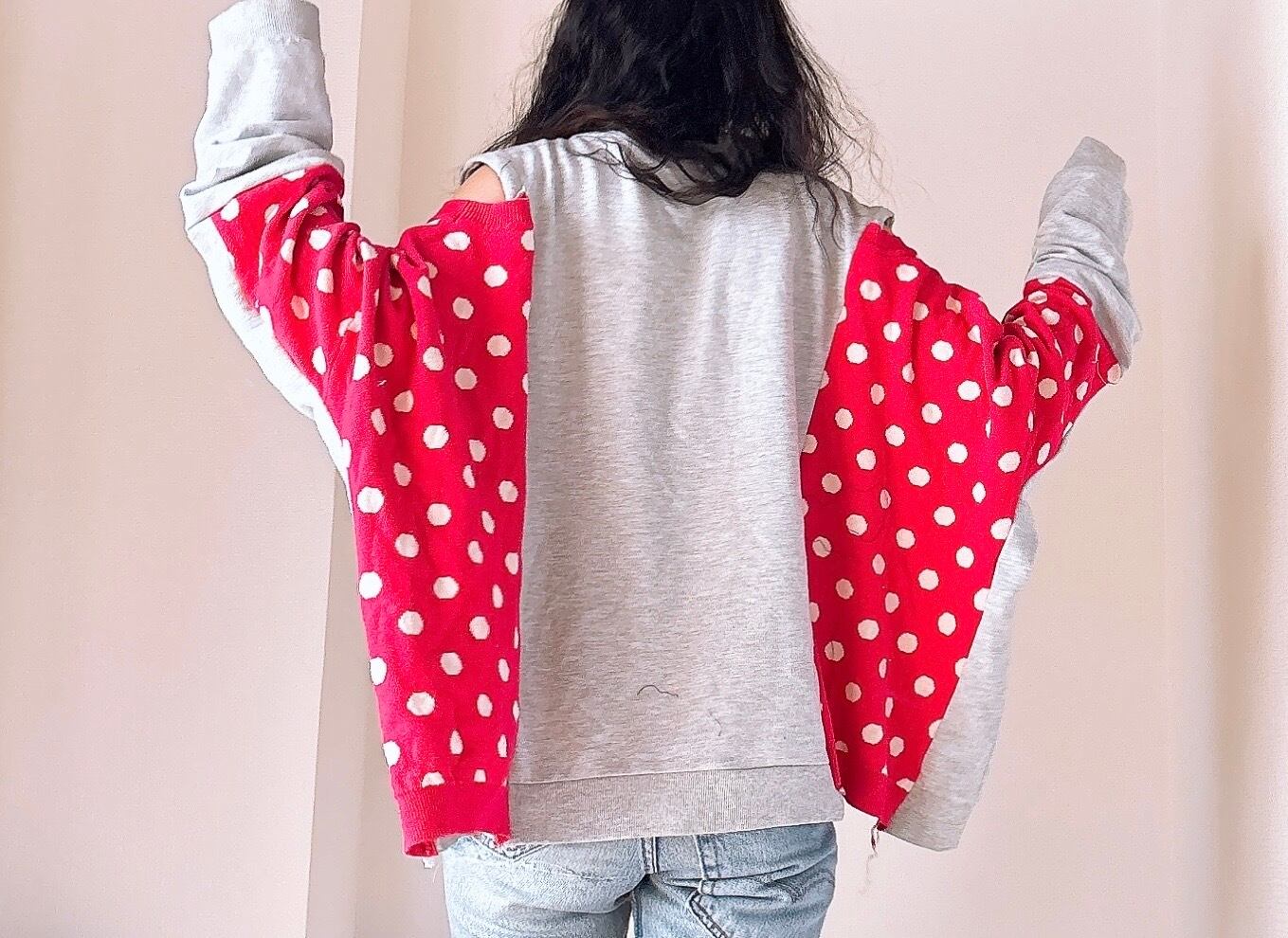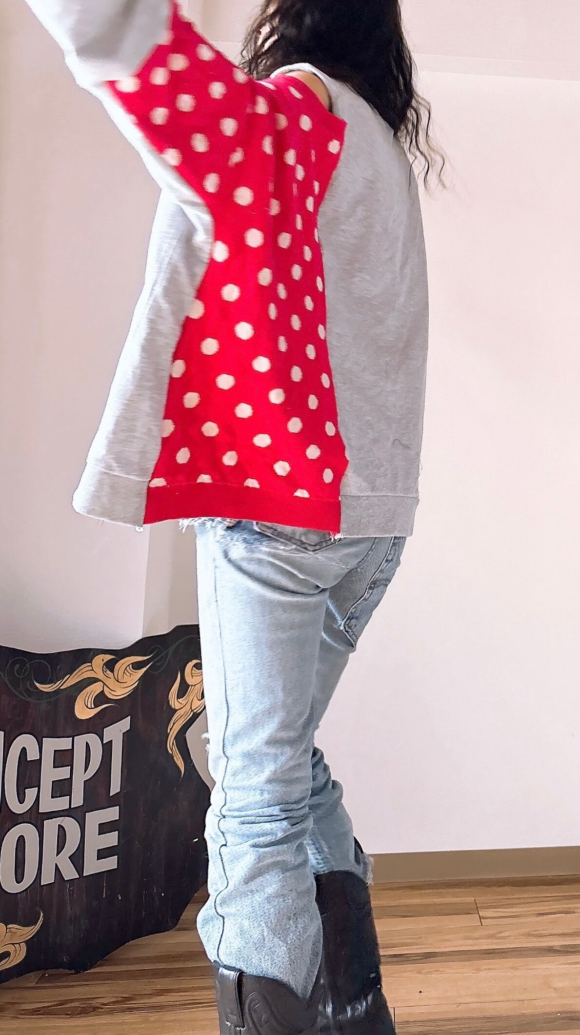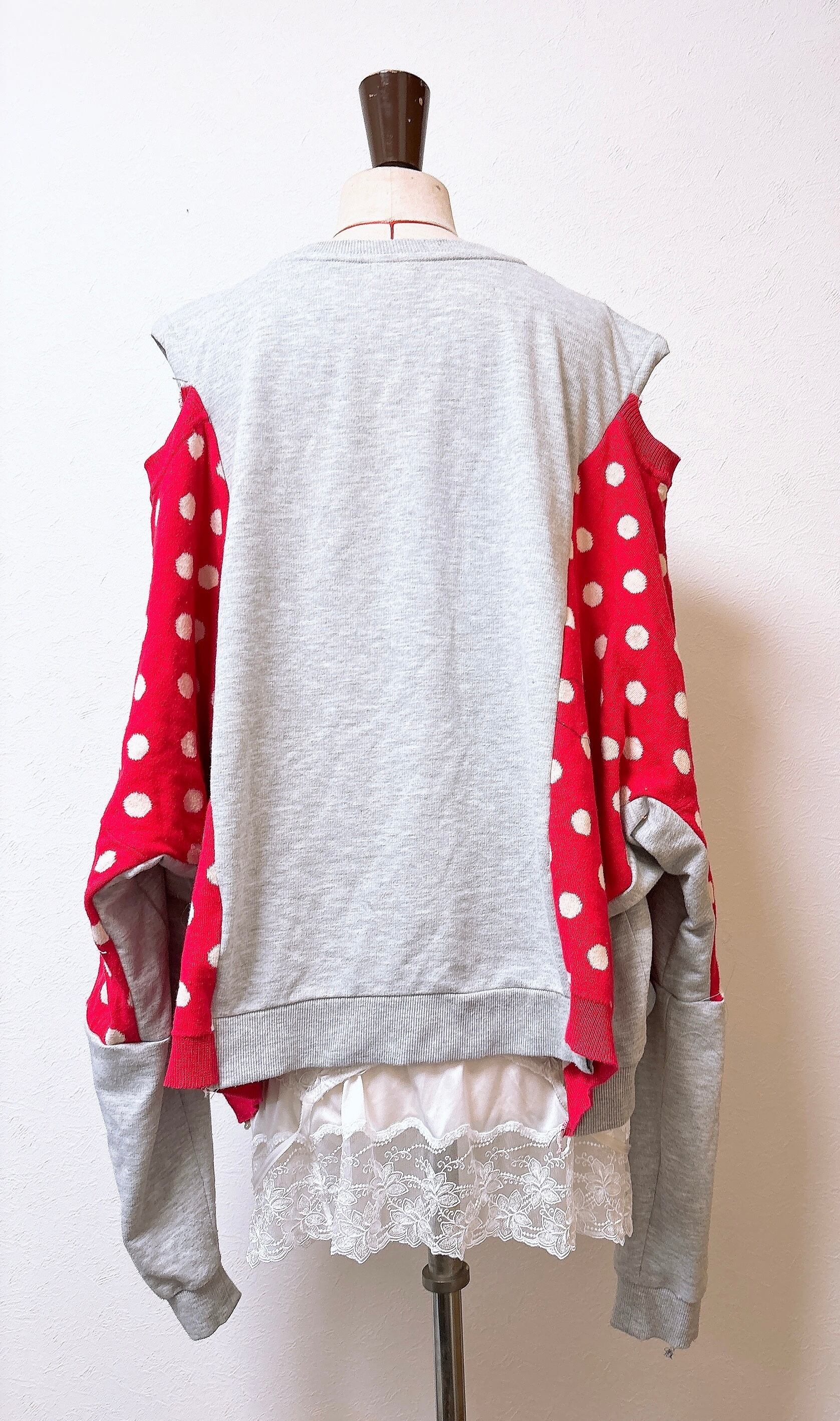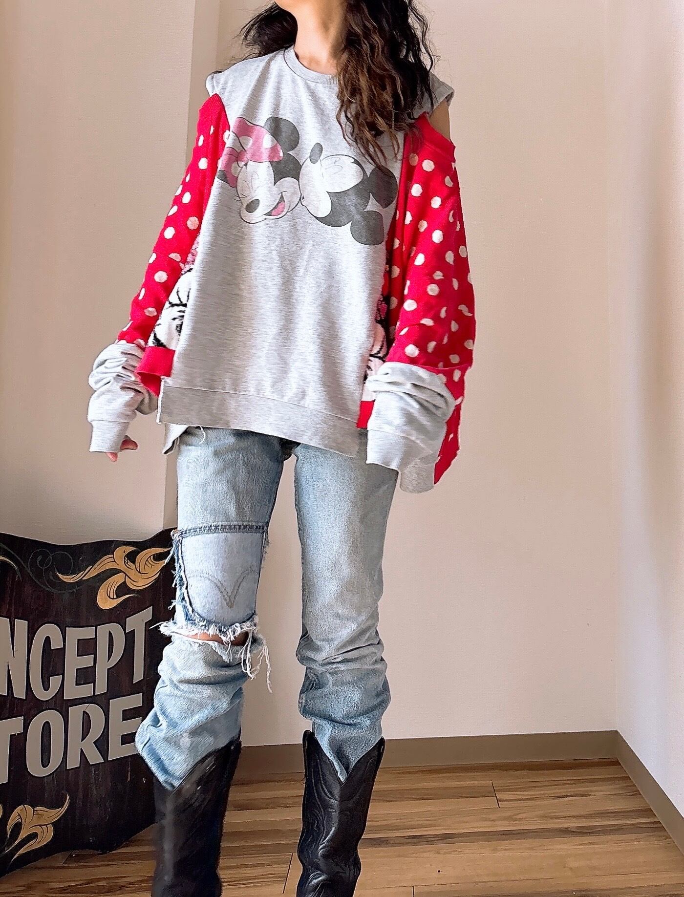 レアなねずマウスのスウェットとドットのニットをドッキング。