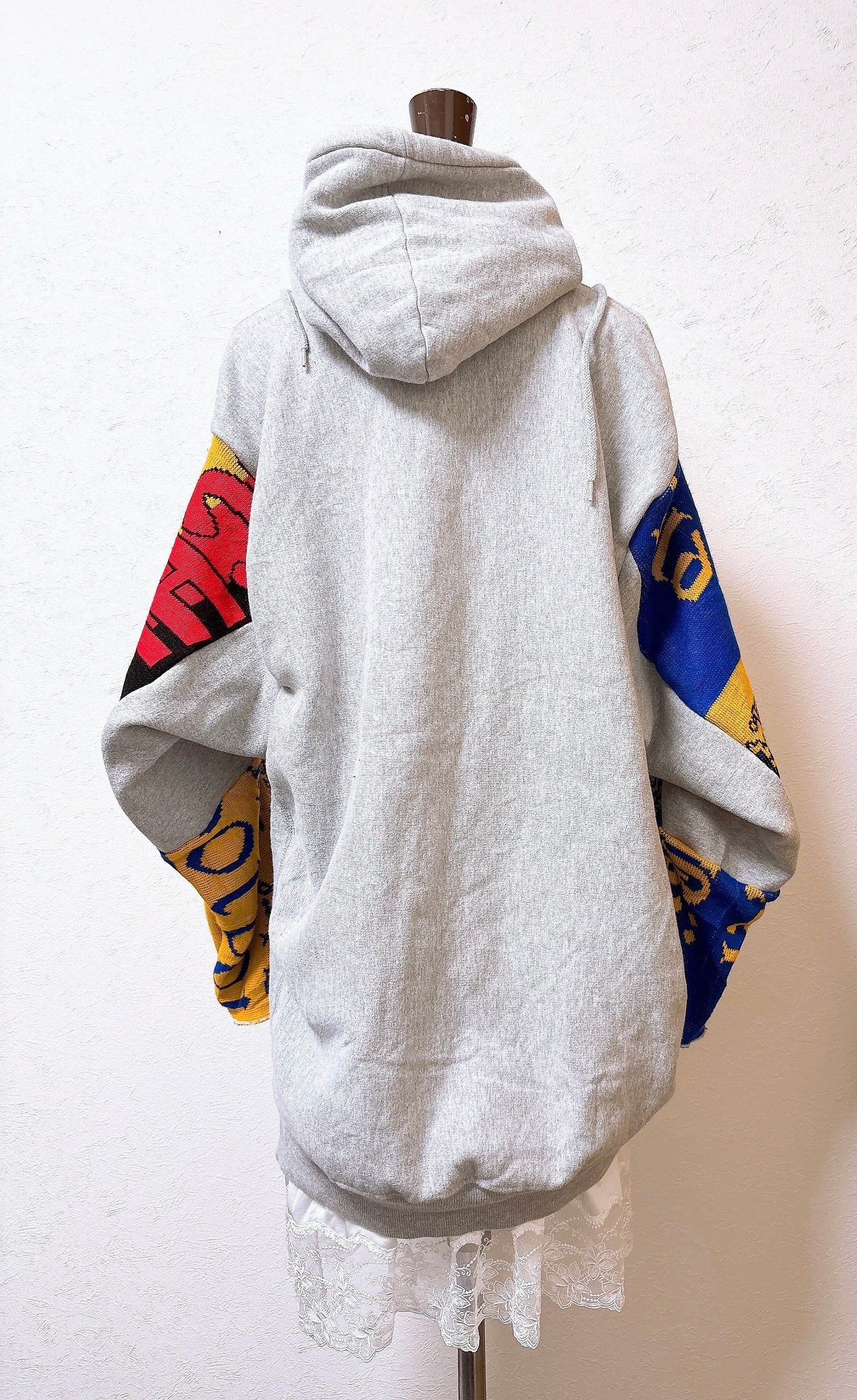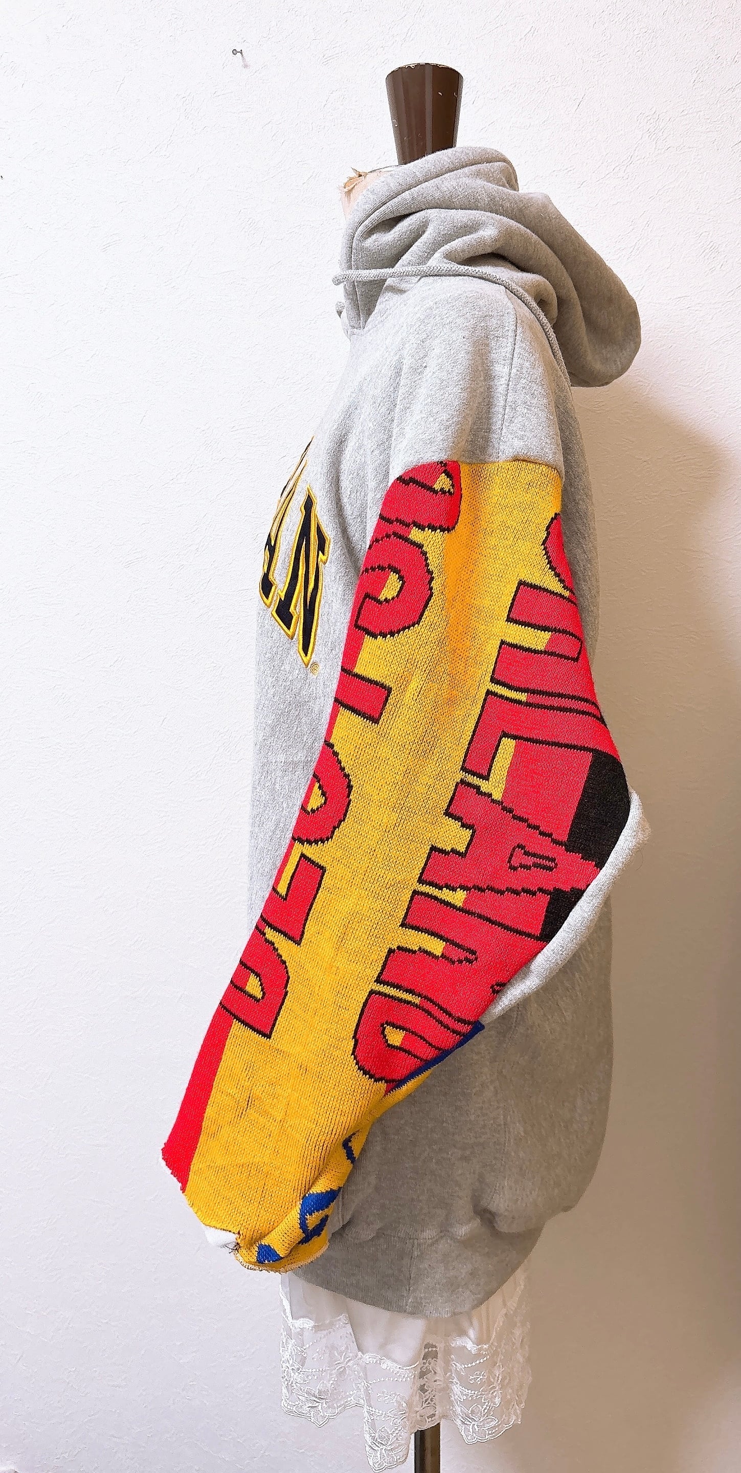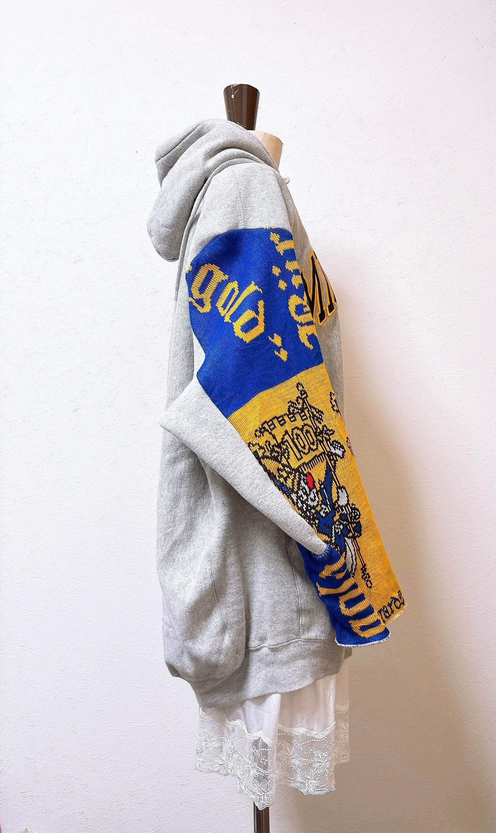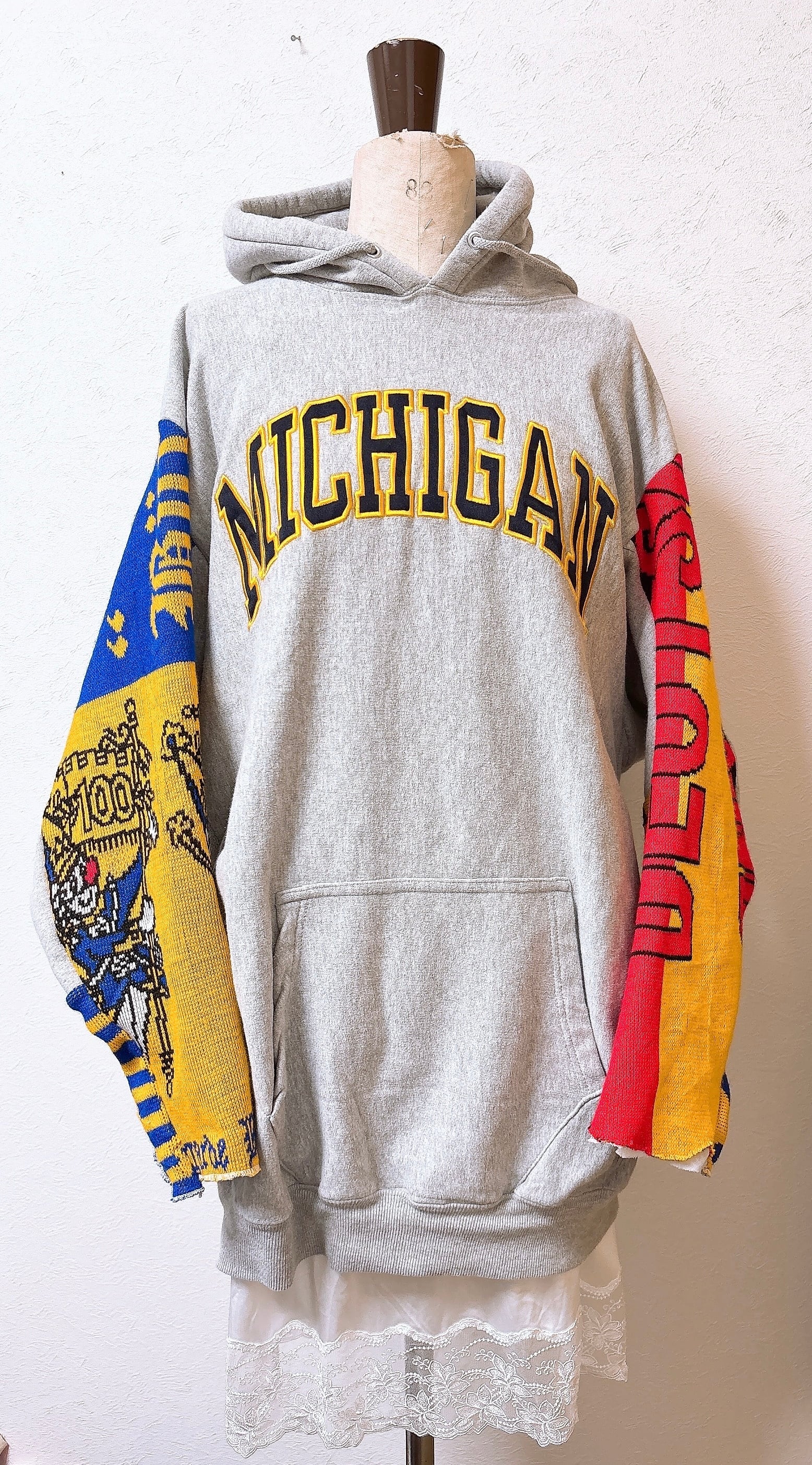 usedのサッカーマフラーとMichiganのロゴが映えるスウェットをドッキング、二枚袖仕立てにして、