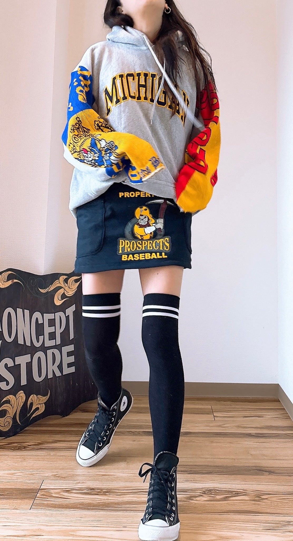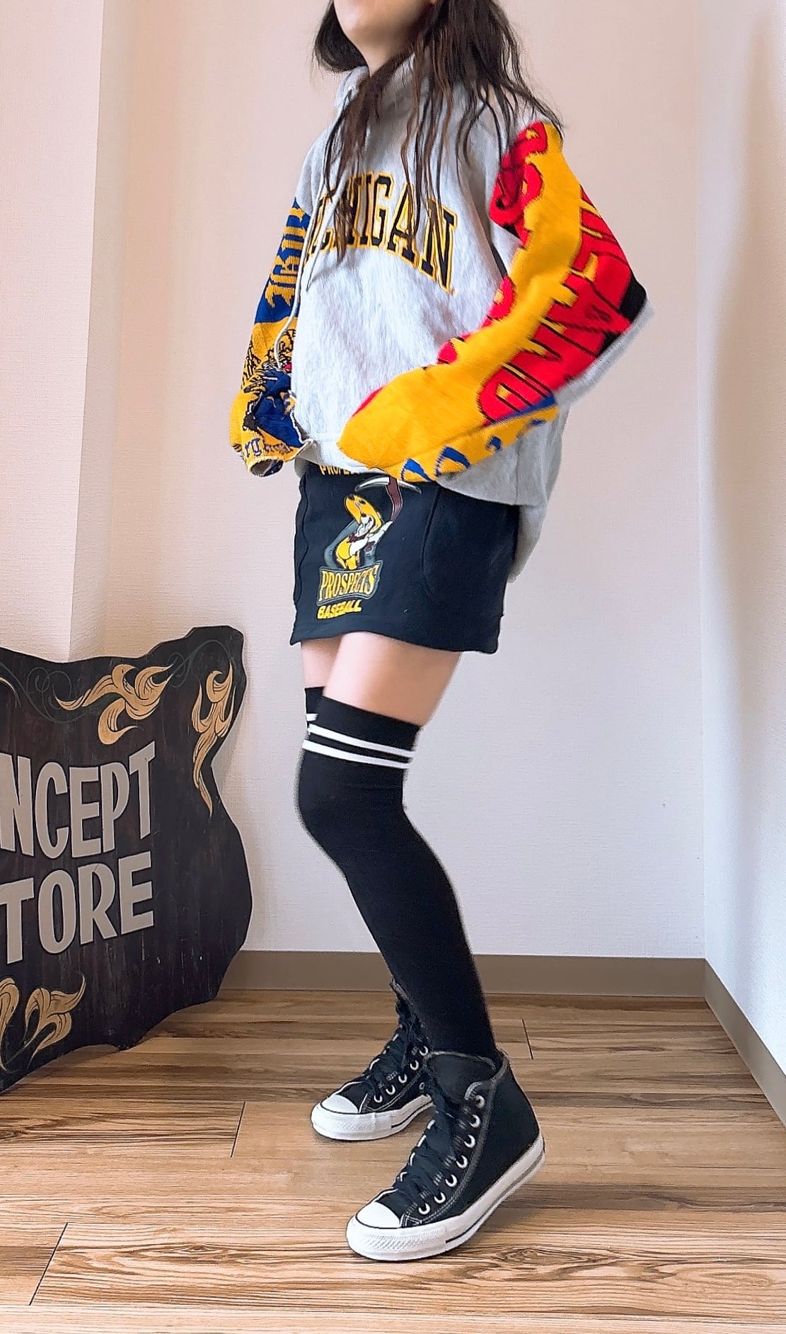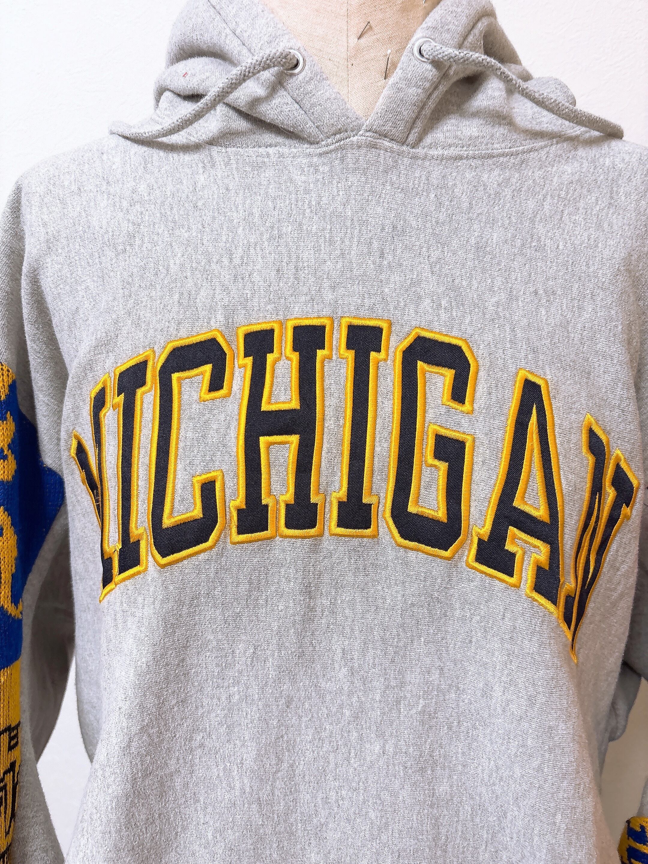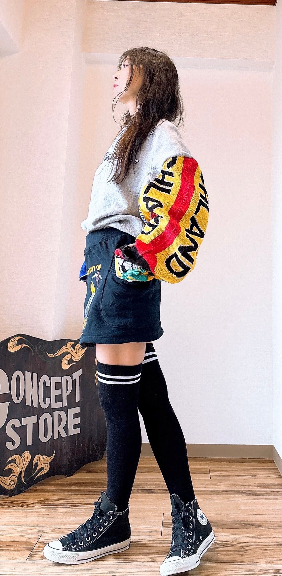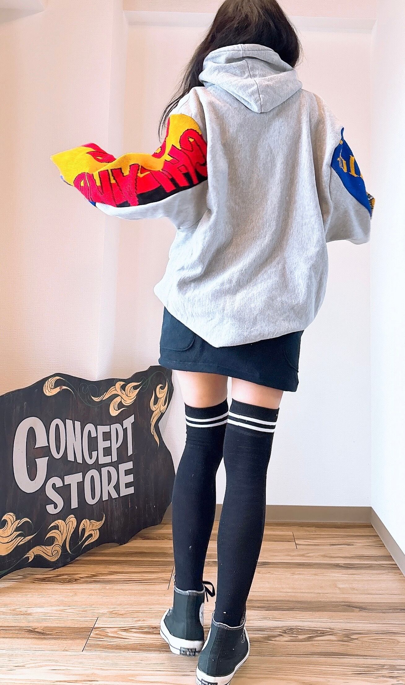 usedのサッカーマフラーとMichiganのロゴが映えるスウェットをドッキング、二枚袖仕立てにして、