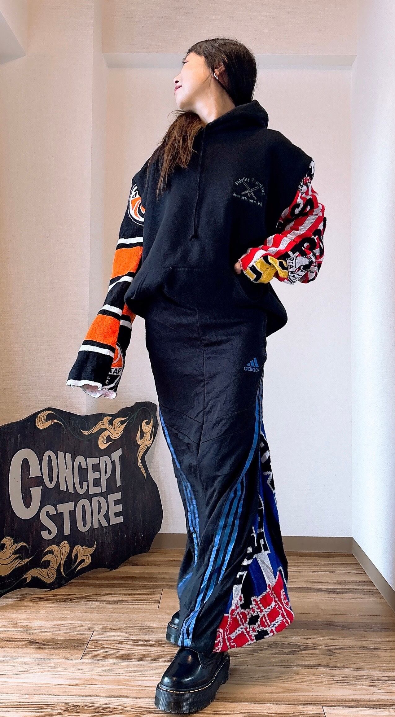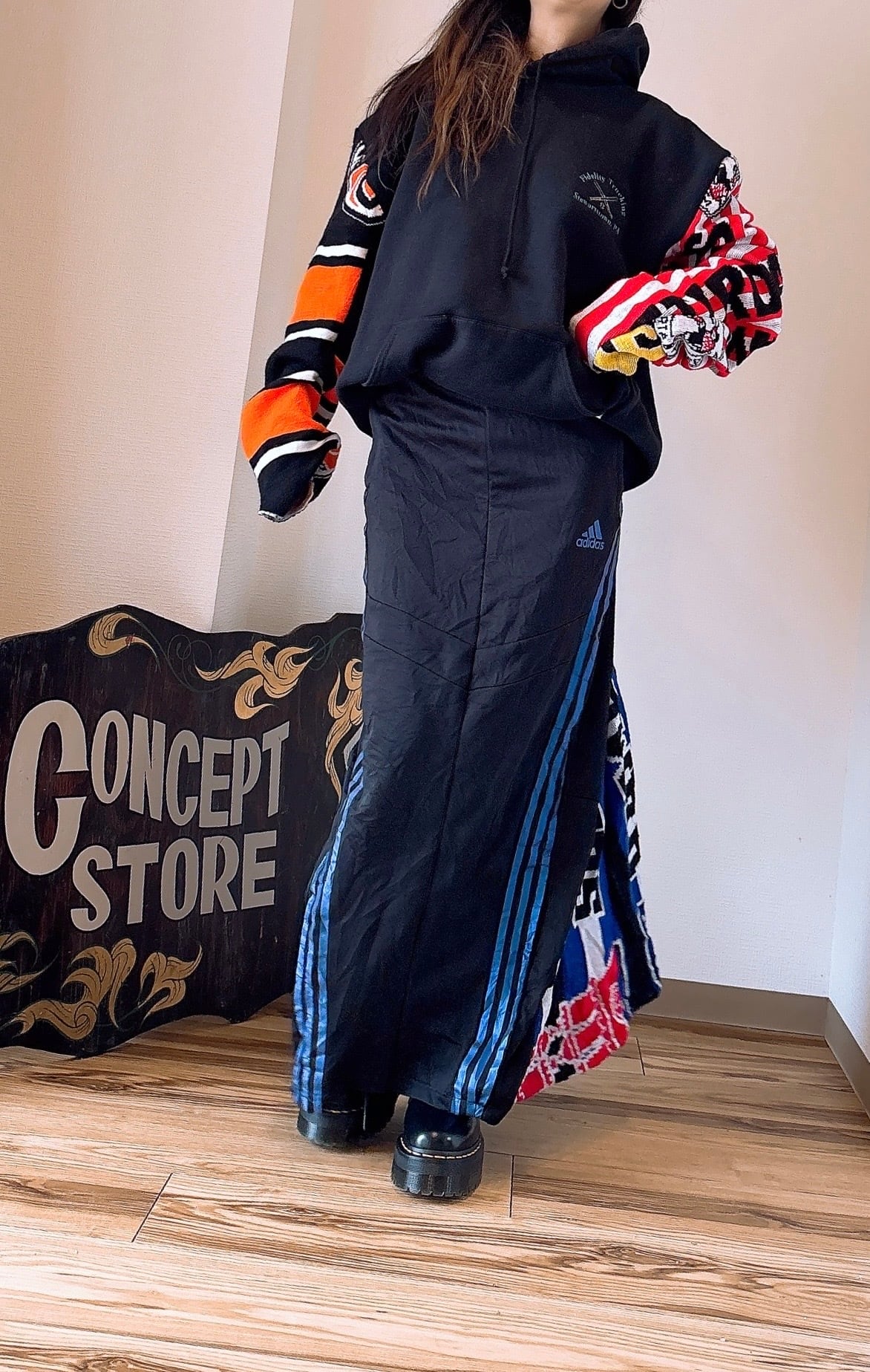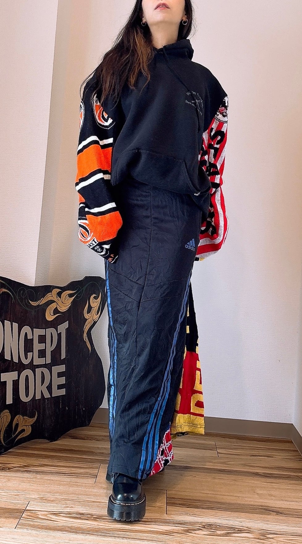 アディのトラックパンツとサッカーマフラーをドッキングして、ロングタイトにしました。