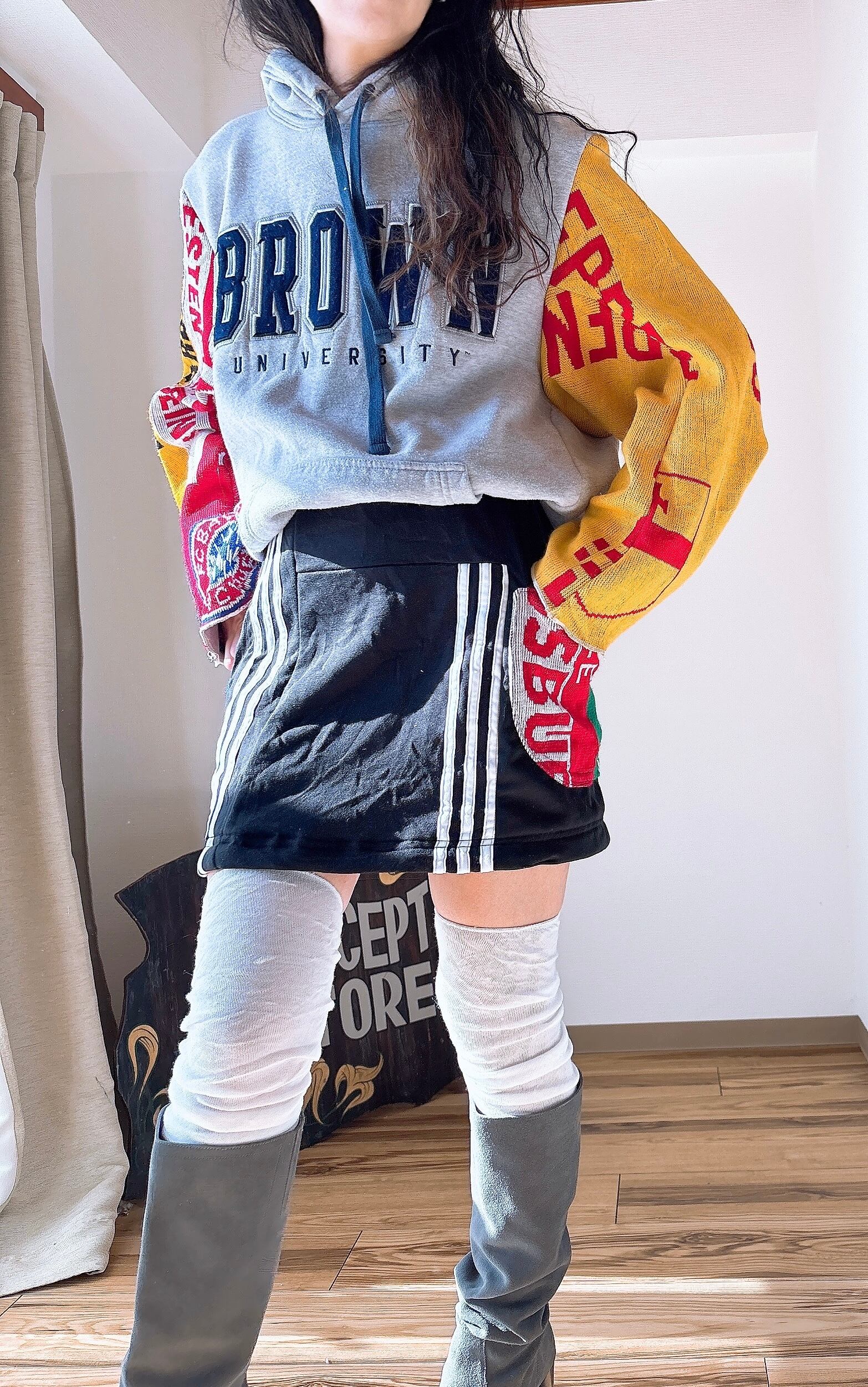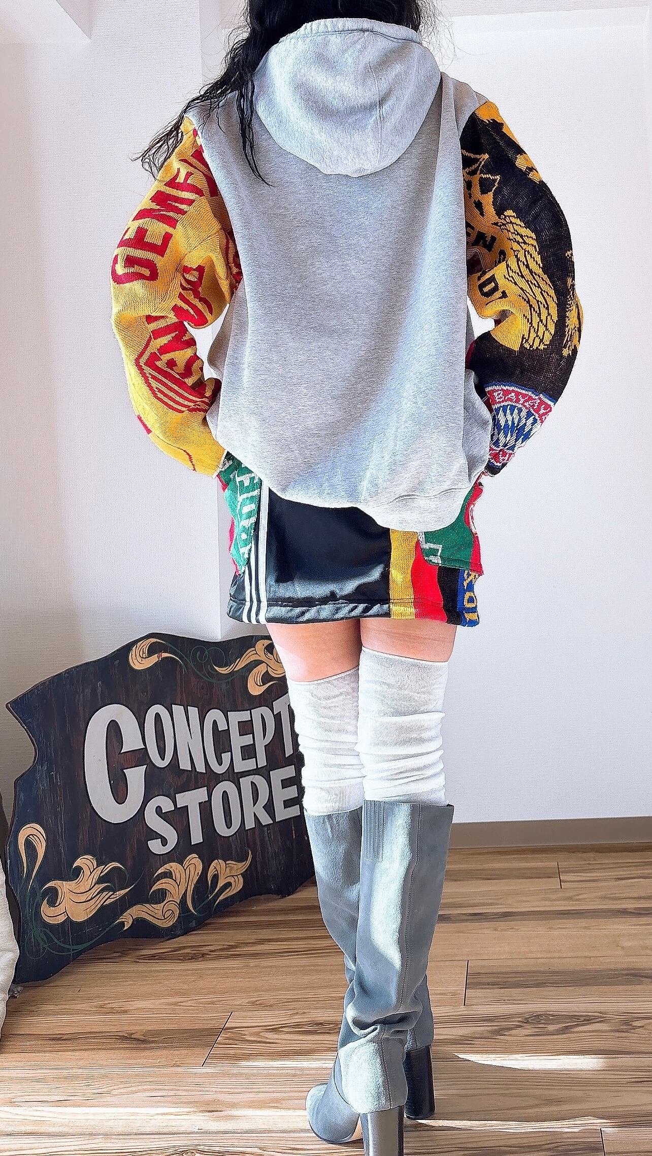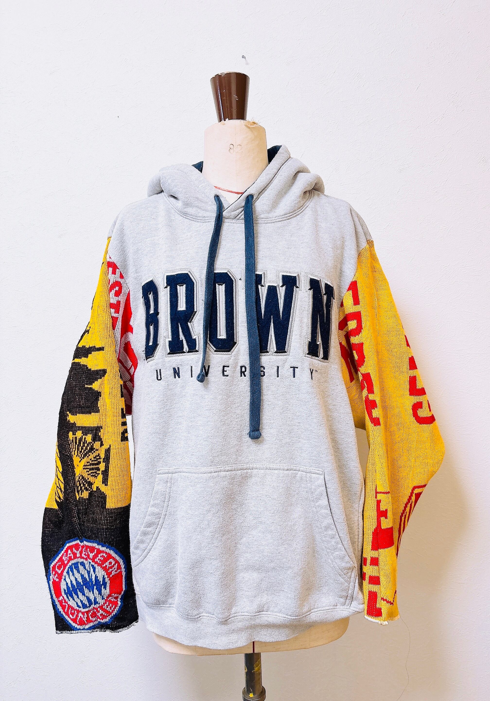 usedのサッカーマフラーにusedスウェットをドッキング、二枚袖仕立てにして、