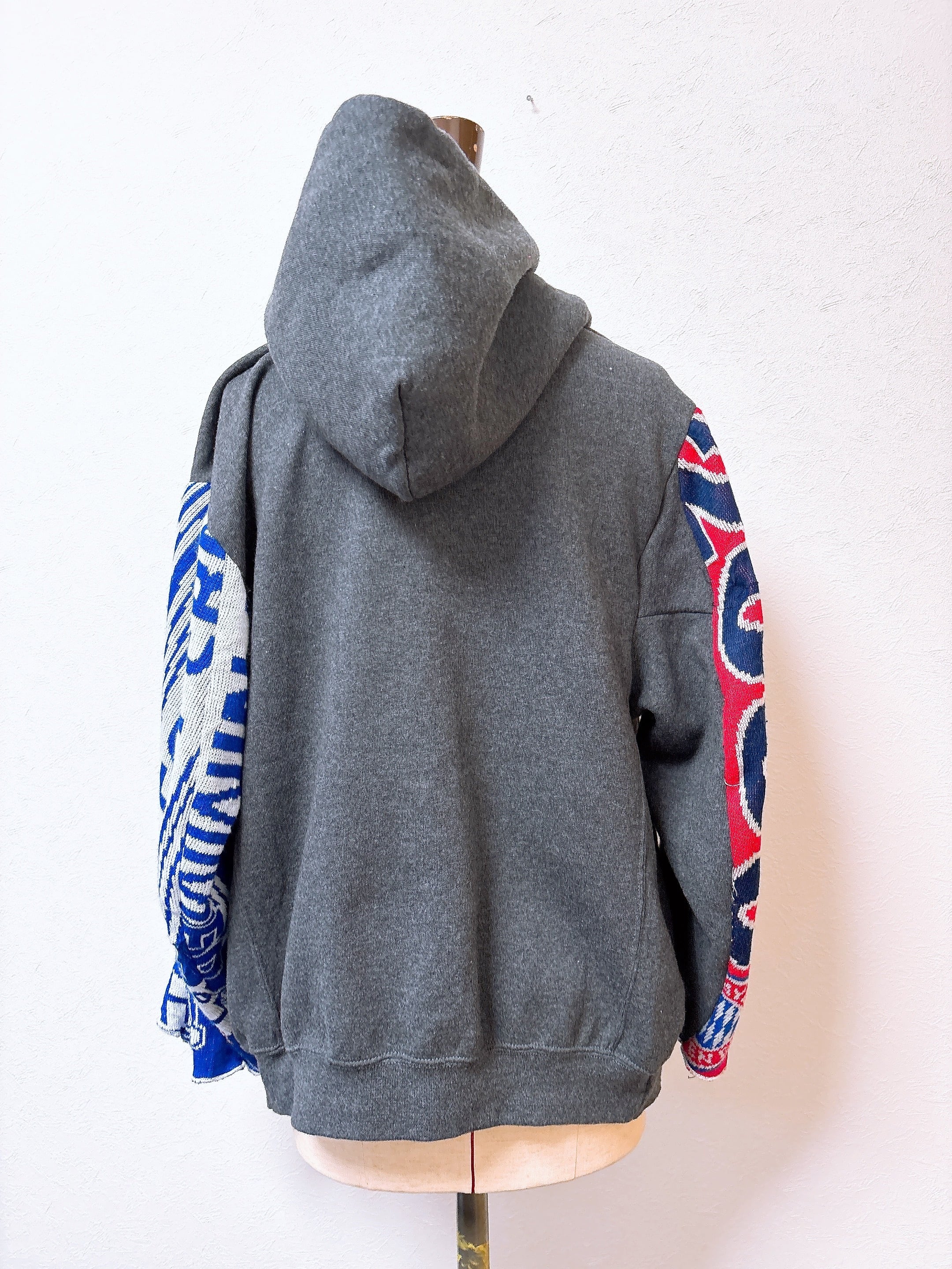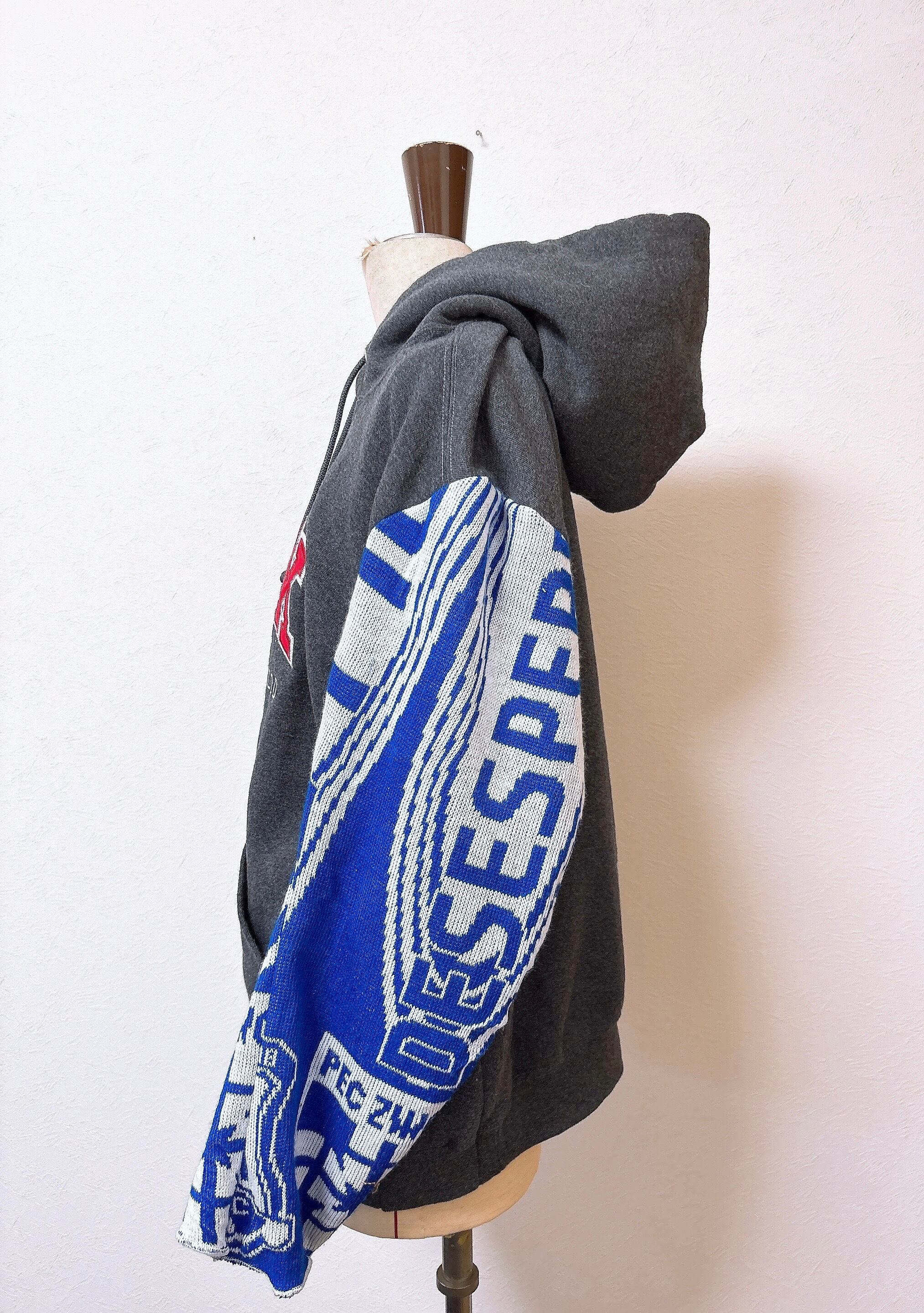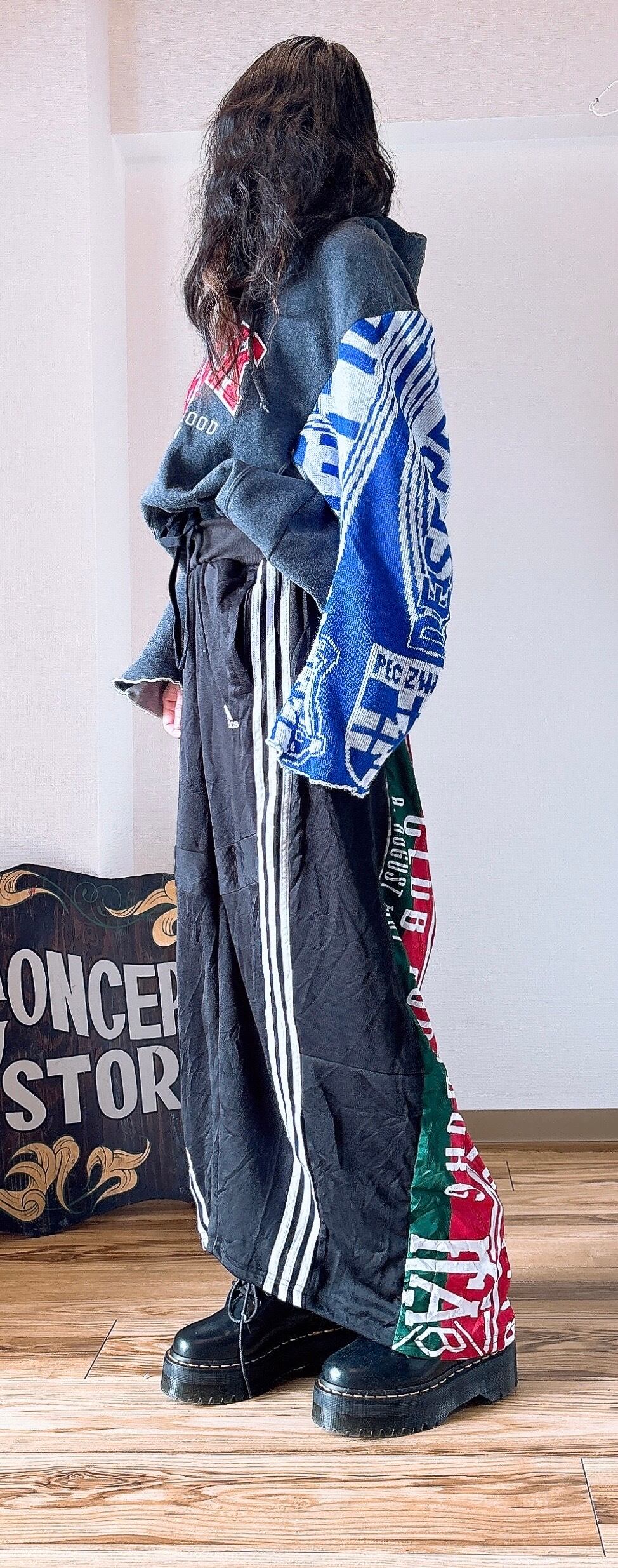 usedのサッカーマフラーにusedのRussellスウェットをドッキング、二枚袖仕立てにして、