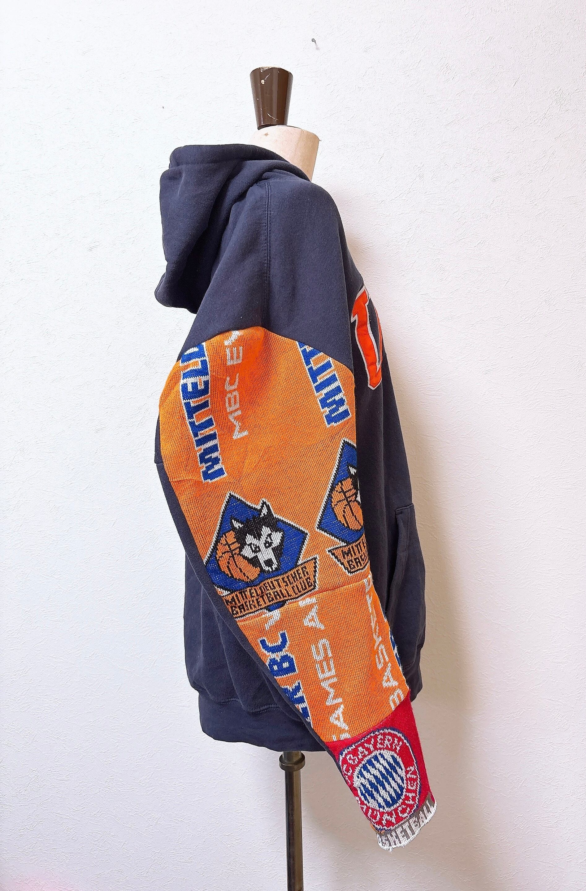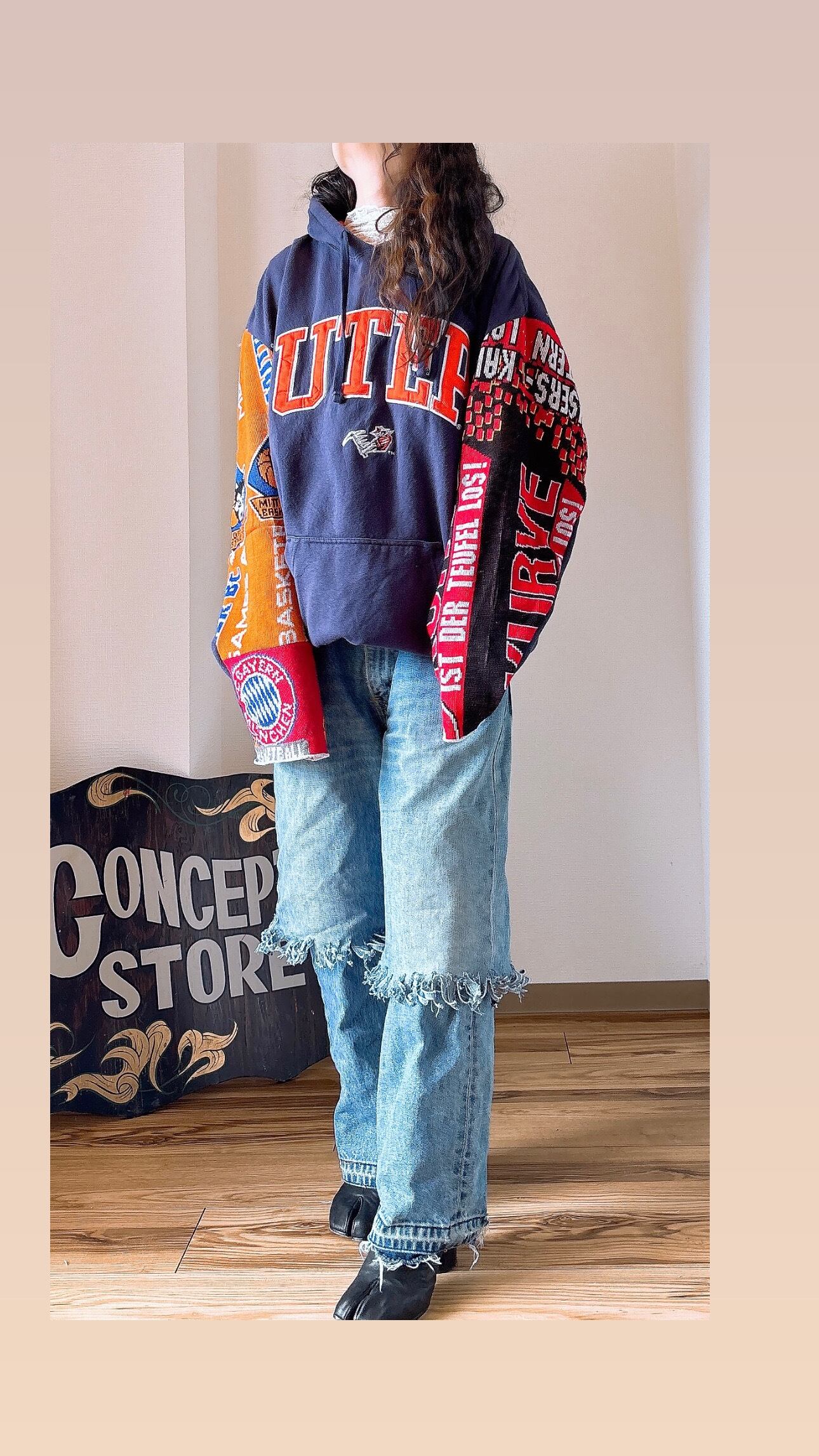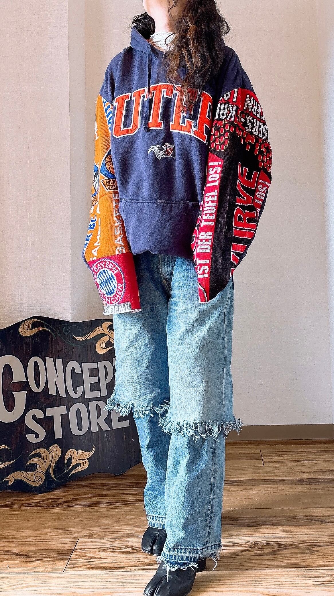 usedのサッカーマフラーにusedスウェットをドッキング、二枚袖仕立てにして、