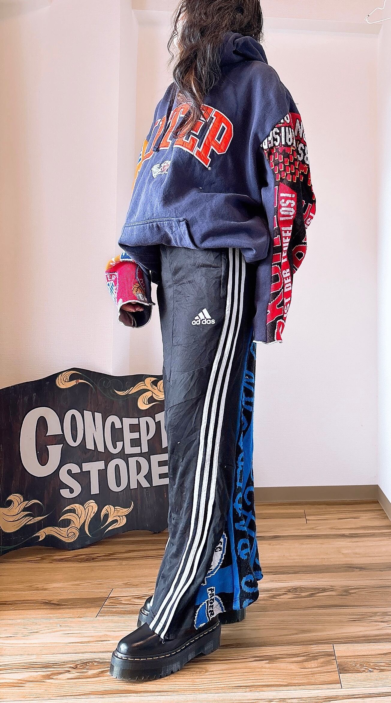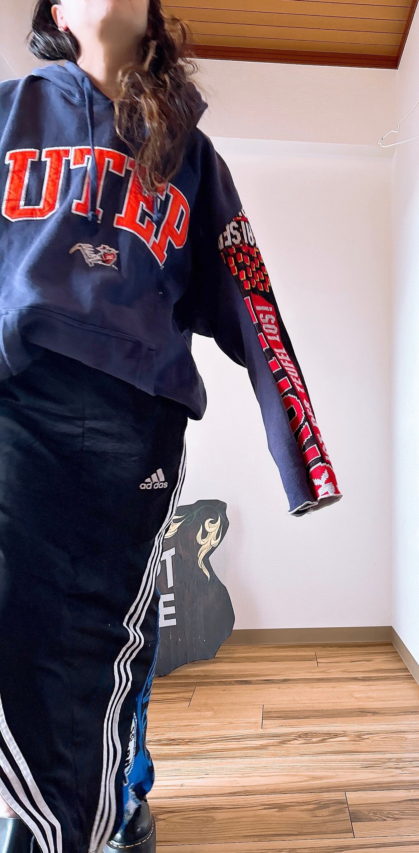 アディのトラックパンツとサッカーマフラーをドッキングして、ロングタイトにしました。