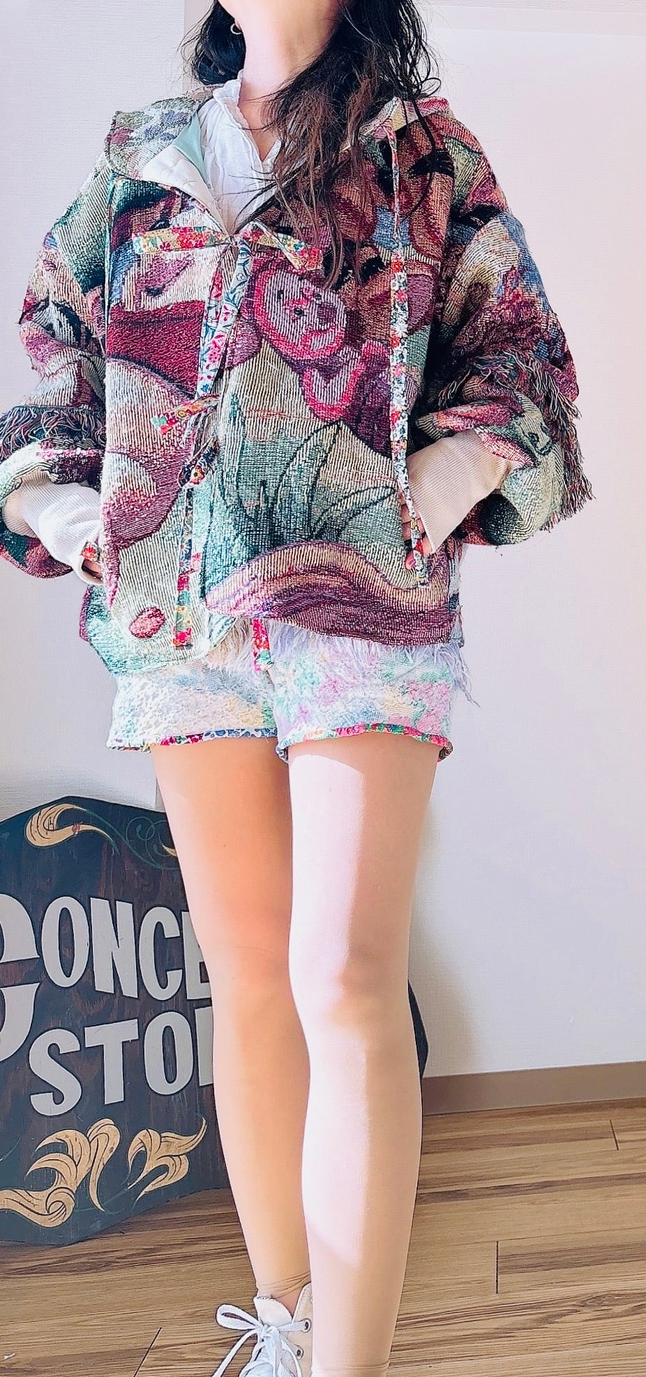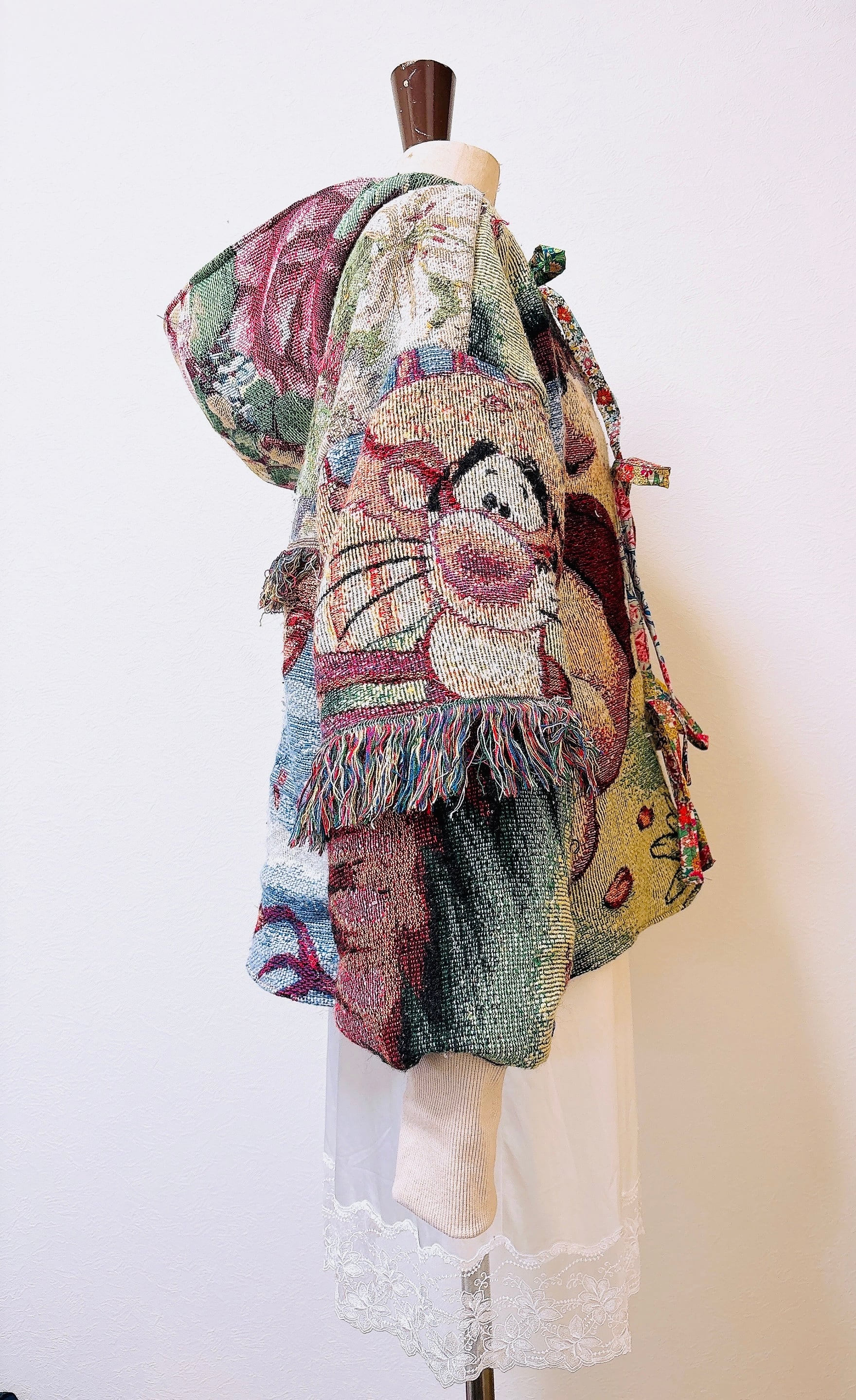 フロントは紐仕様で、軽く羽織ることも、結んでシルエットを調整することも可能。裏地や袖口には異素材を組み合わせ、ハンドメイドならではの温かみと遊び心をプラスしています。