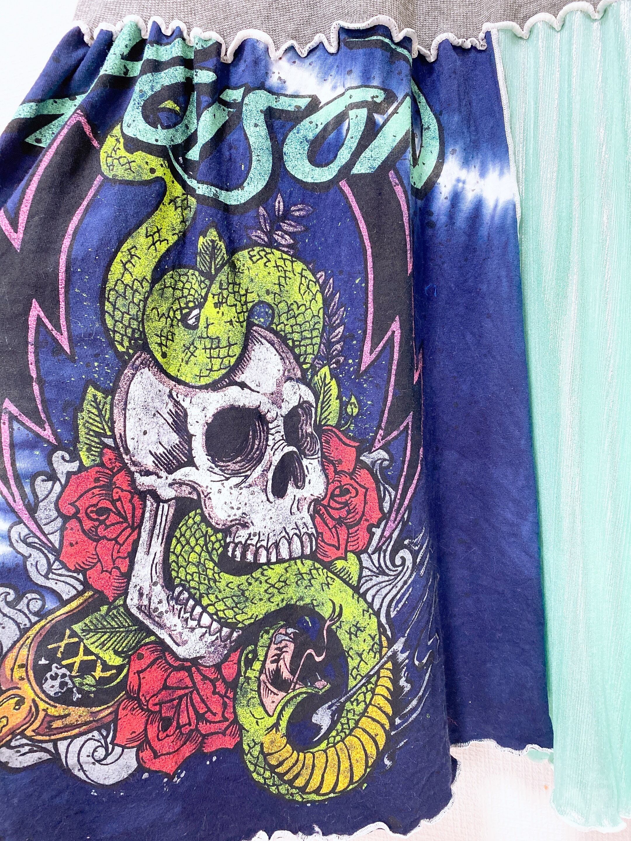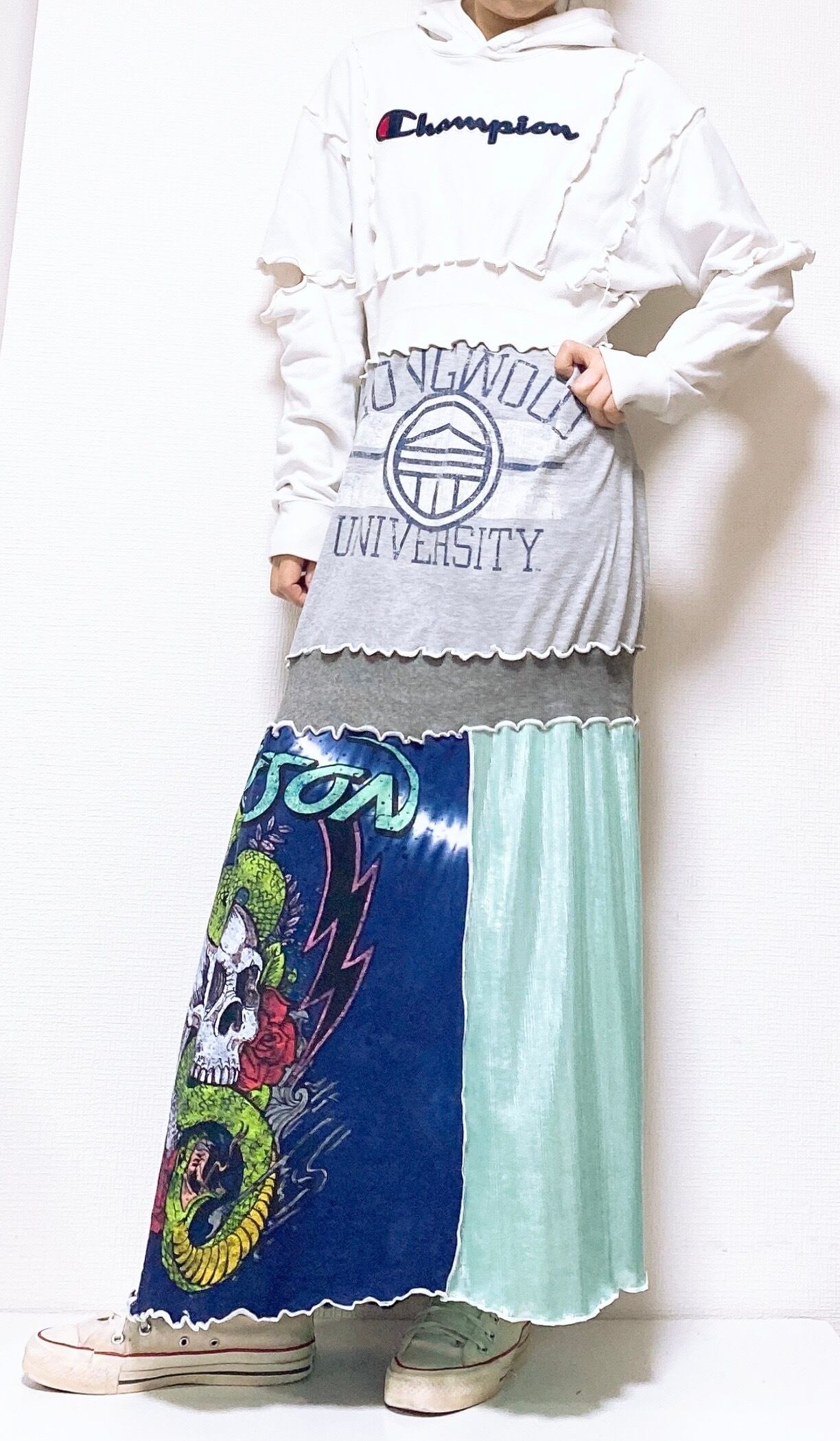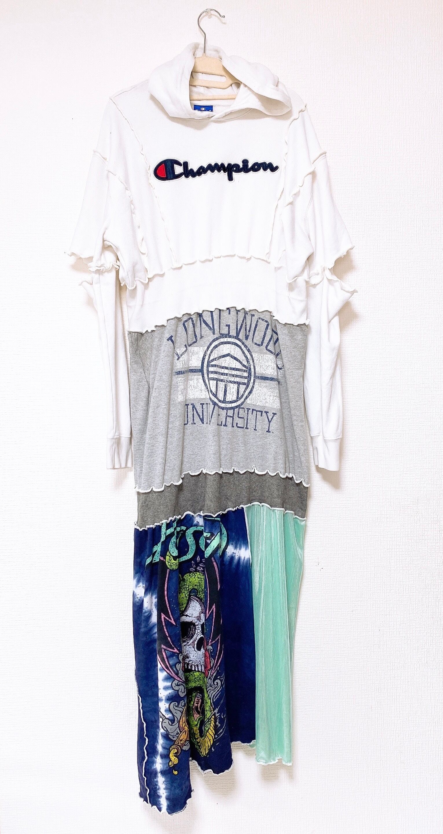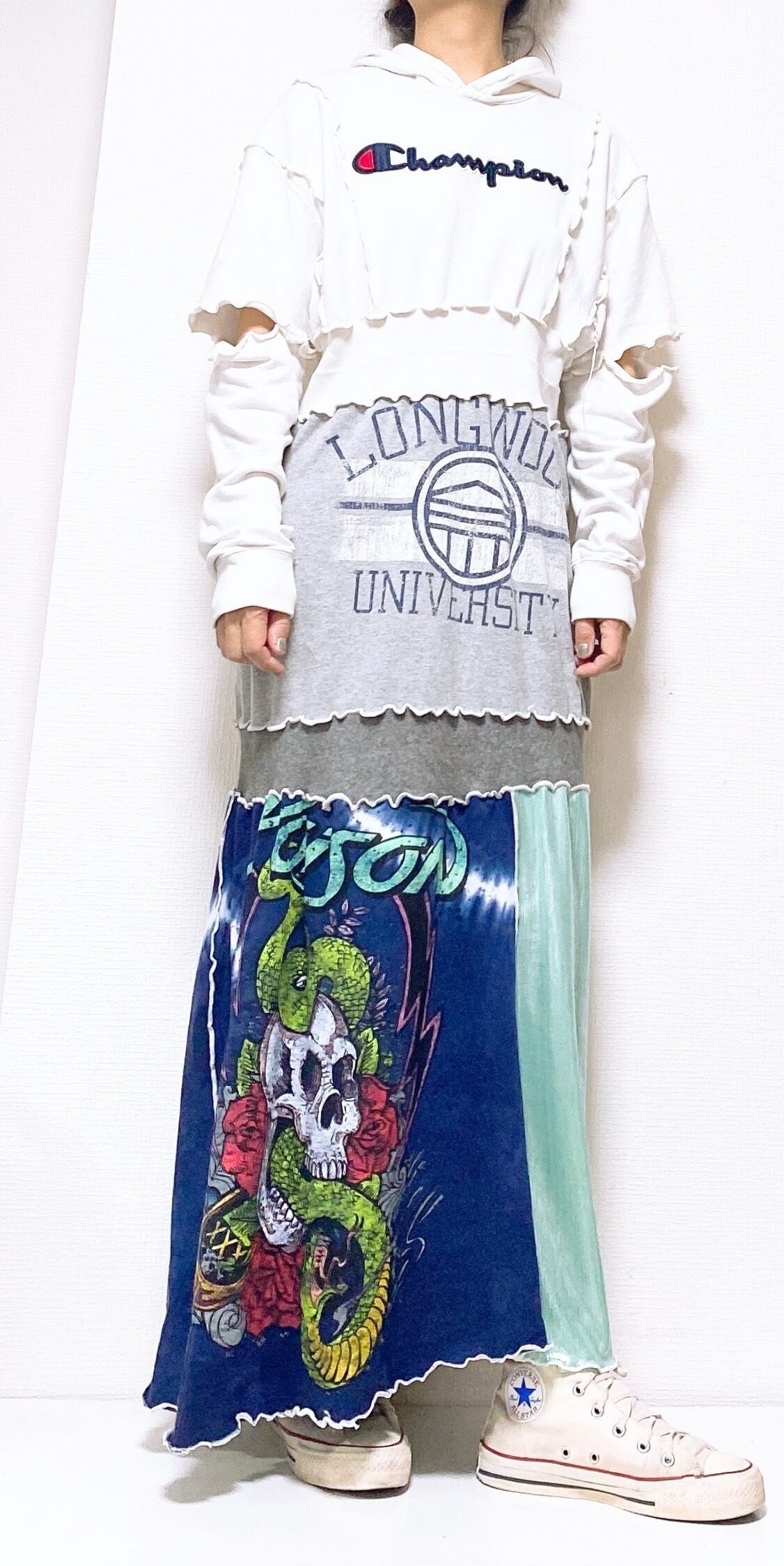 スカルのインパクト大のグラフィックを集めてワンピースにしました。