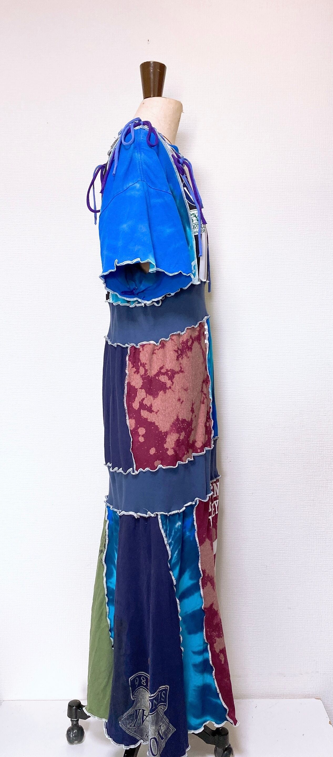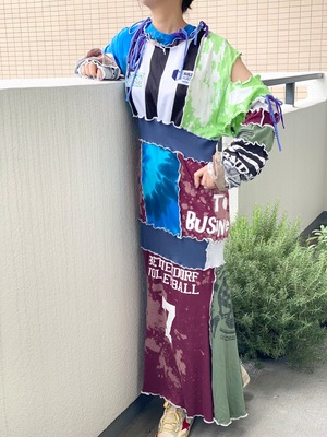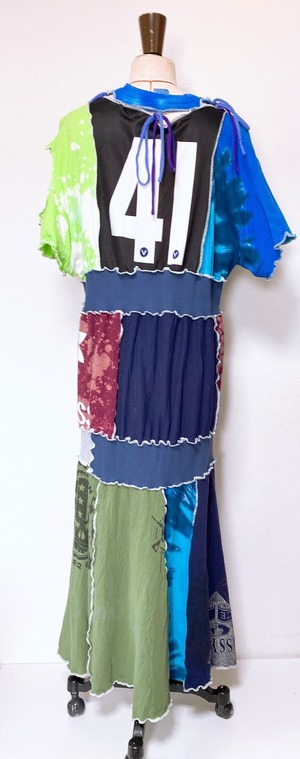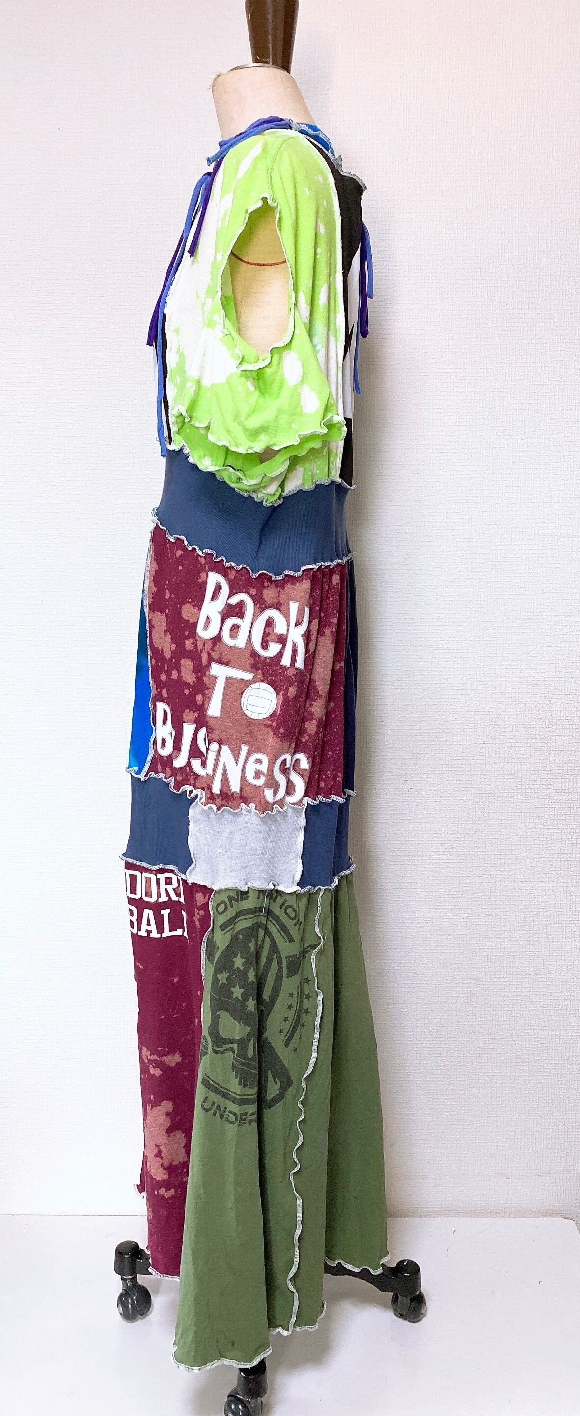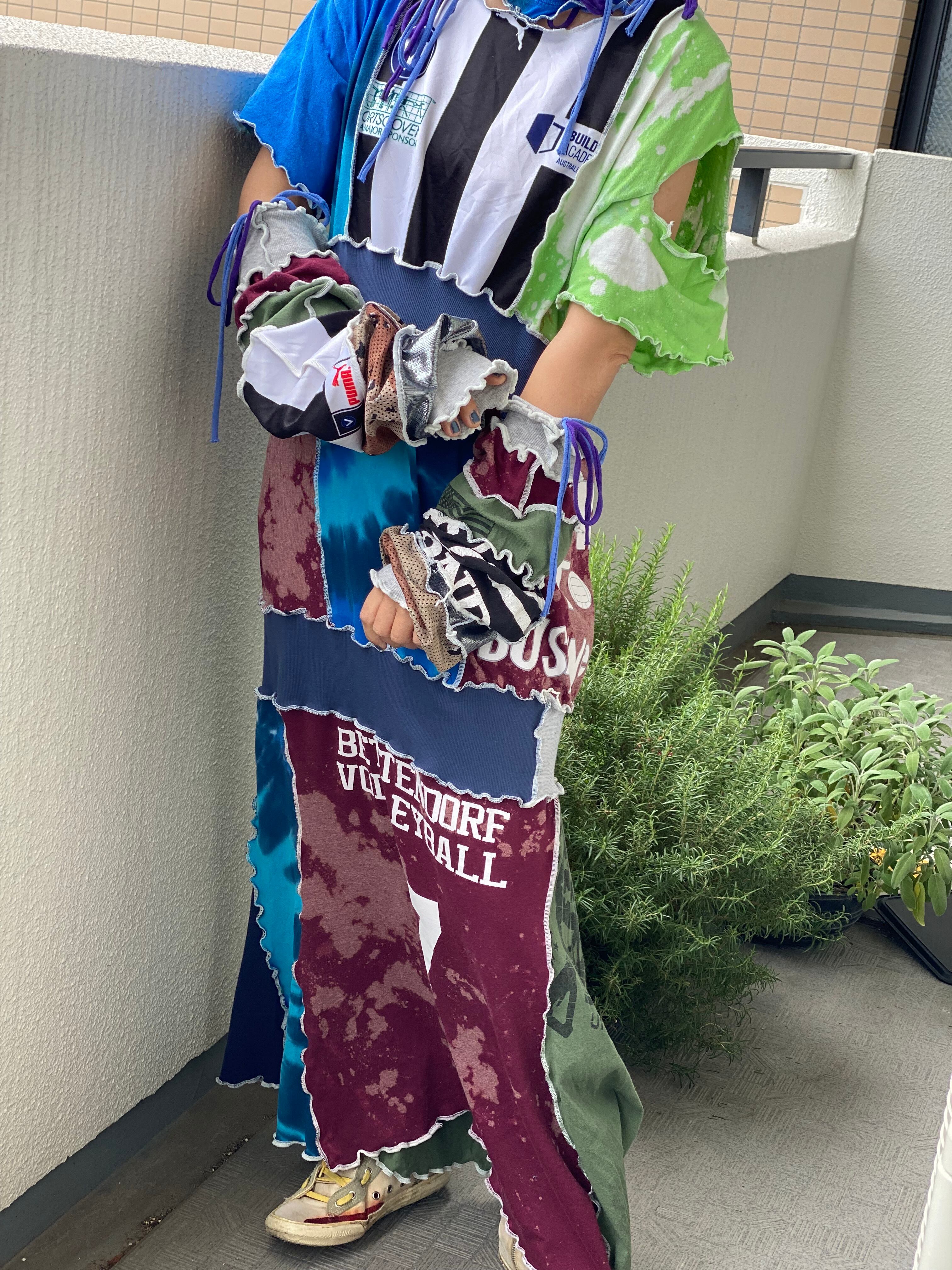 teeシャツから作ったteeシャツヤーンのリボンもついて、誰とも被らないワンピです。