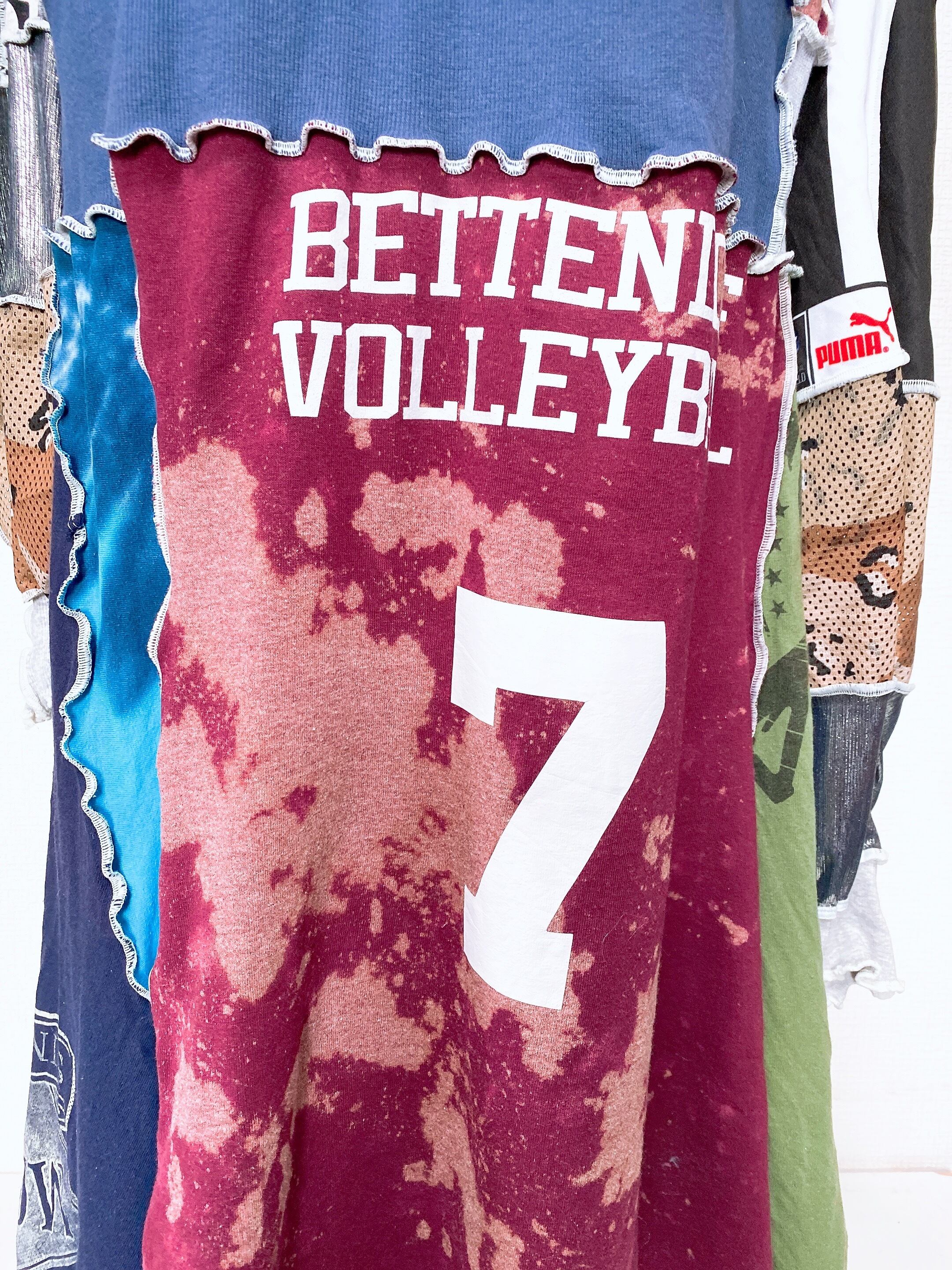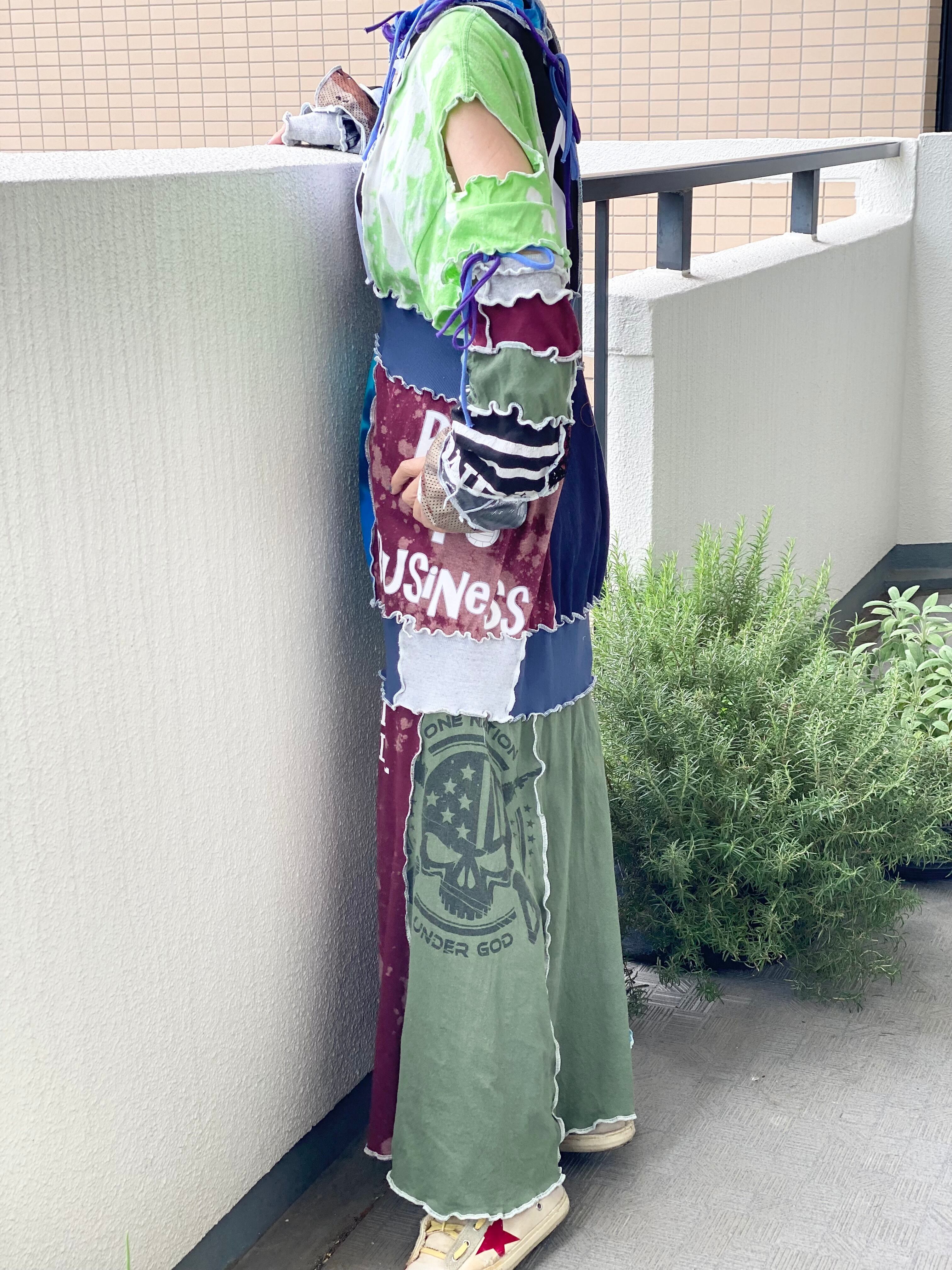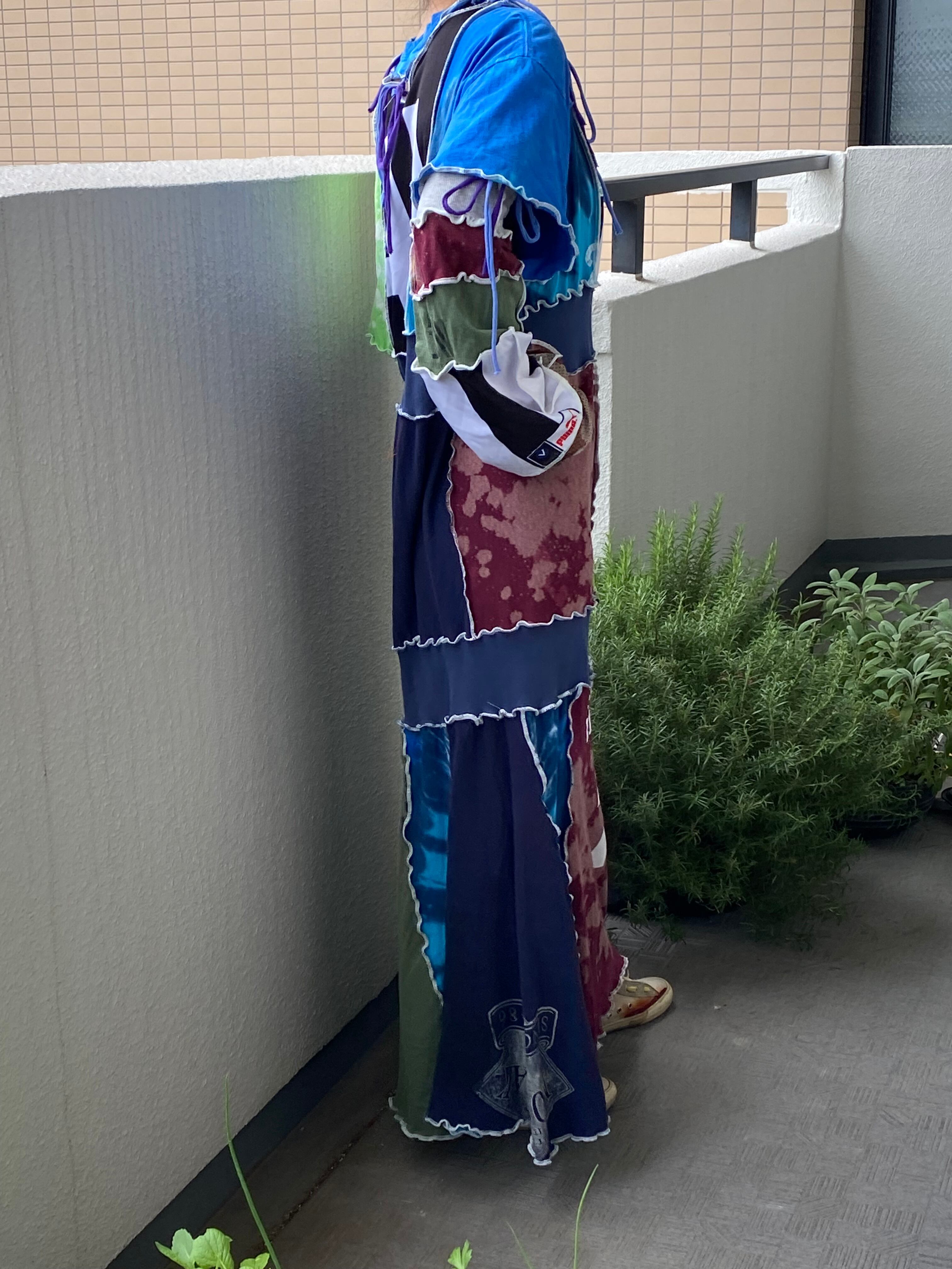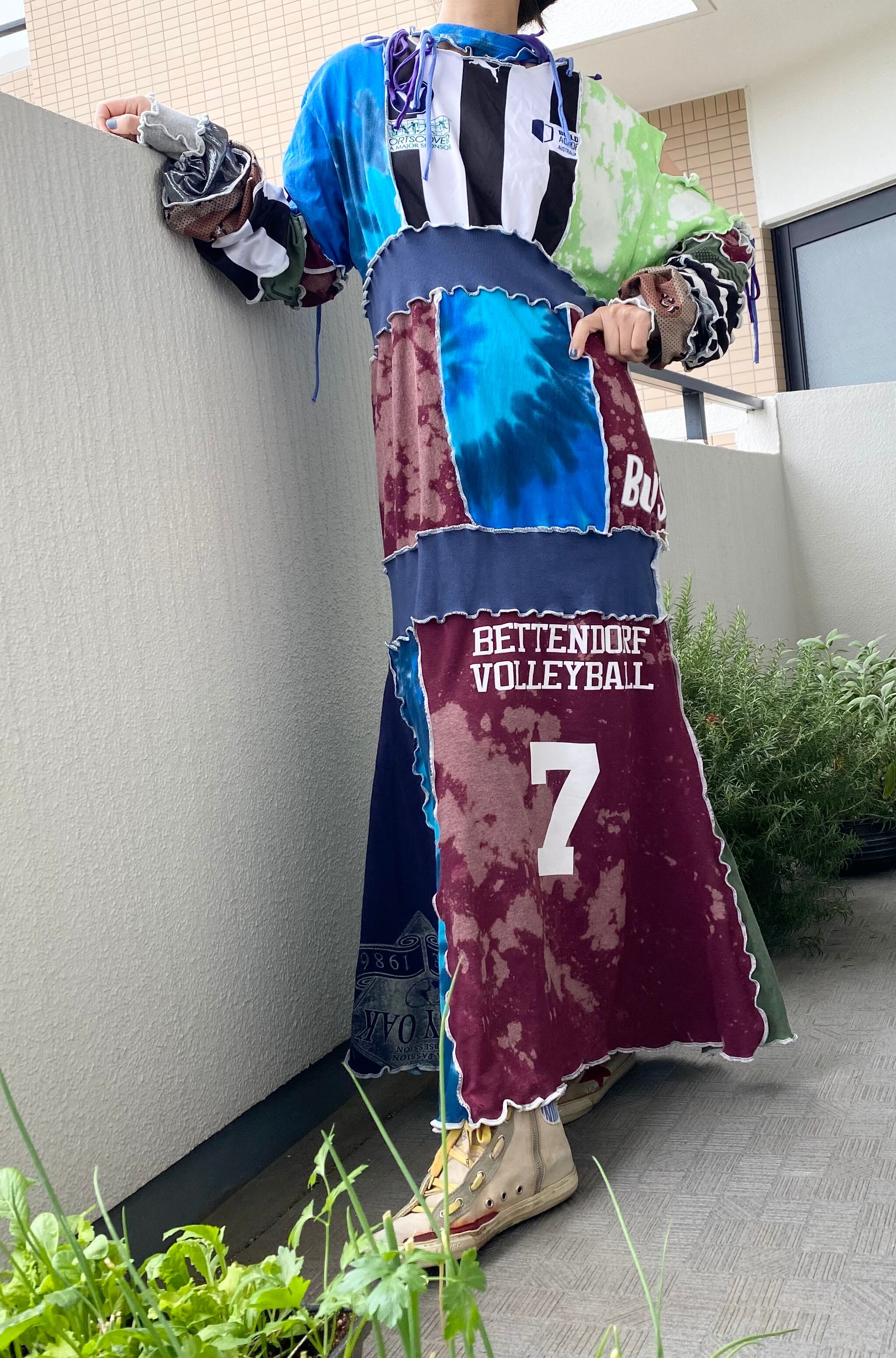 teeシャツから作ったteeシャツヤーンのリボンもついて、誰とも被らないワンピです。