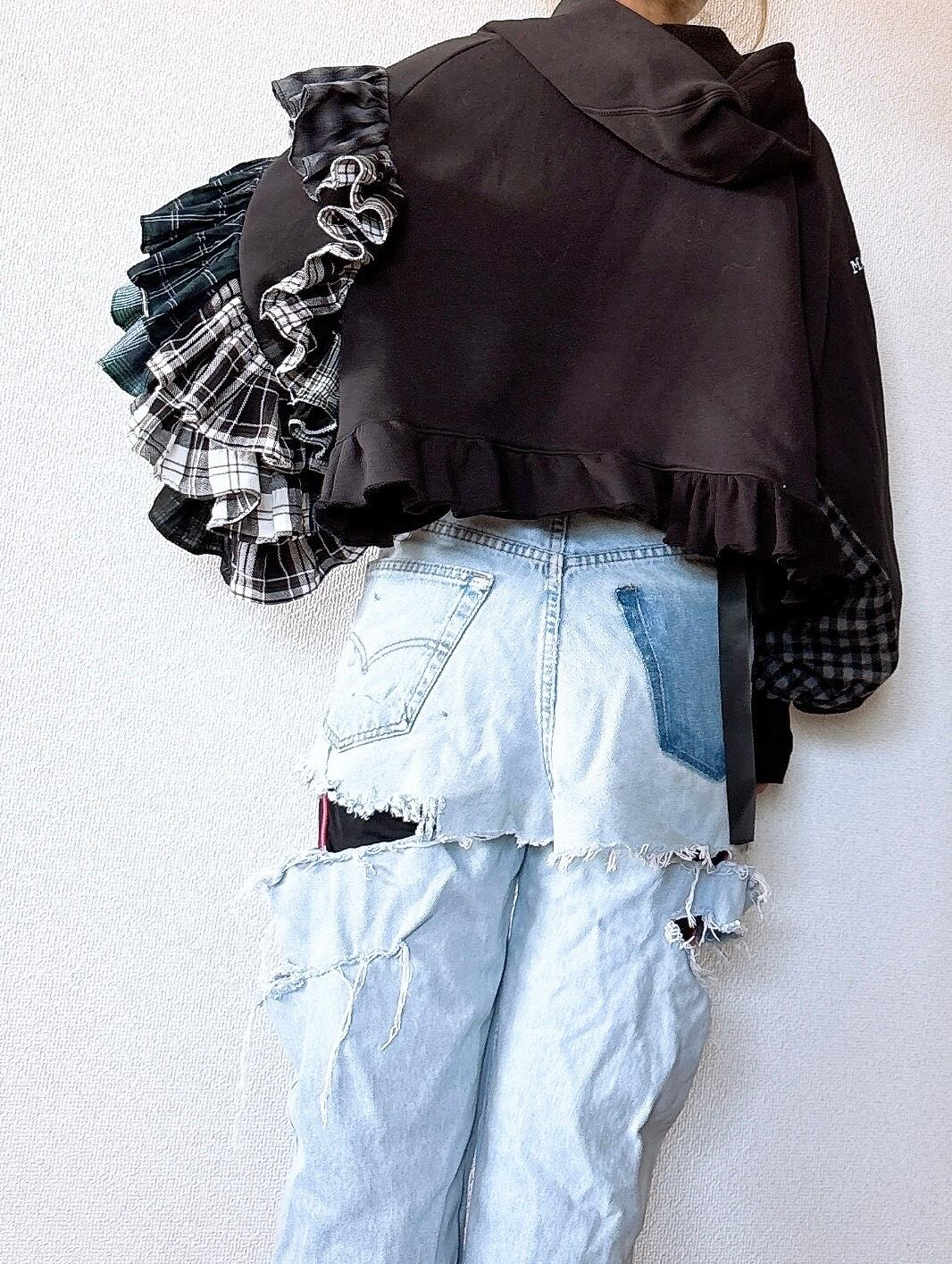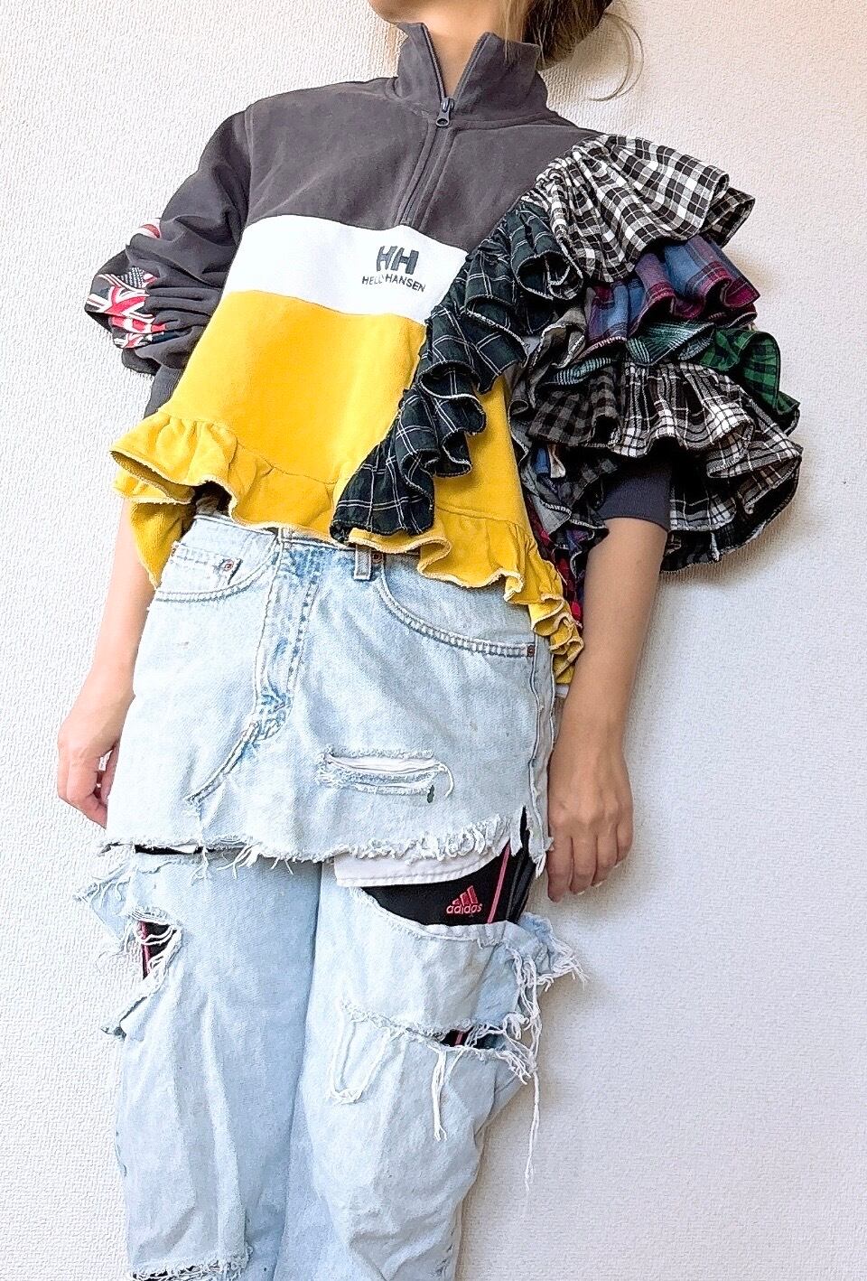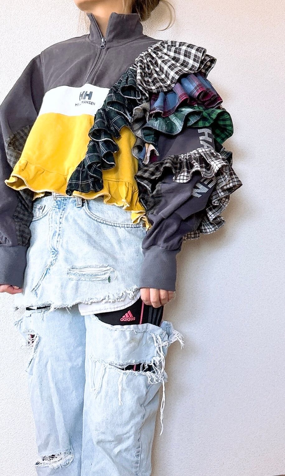 今期トレンドのチェックを古着のスウェットに挟み込んで片袖をフリルが最強に可愛い袖にしました。