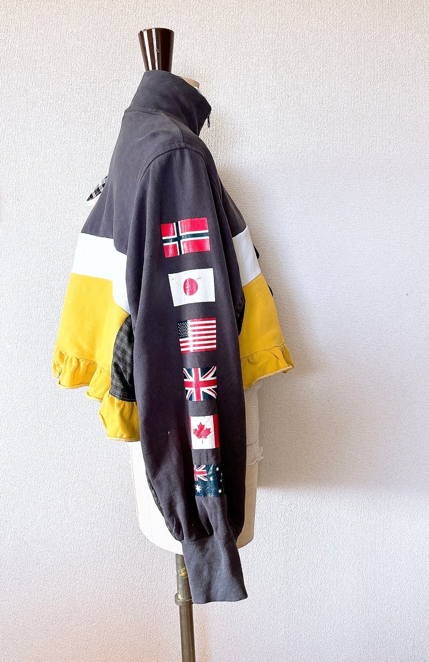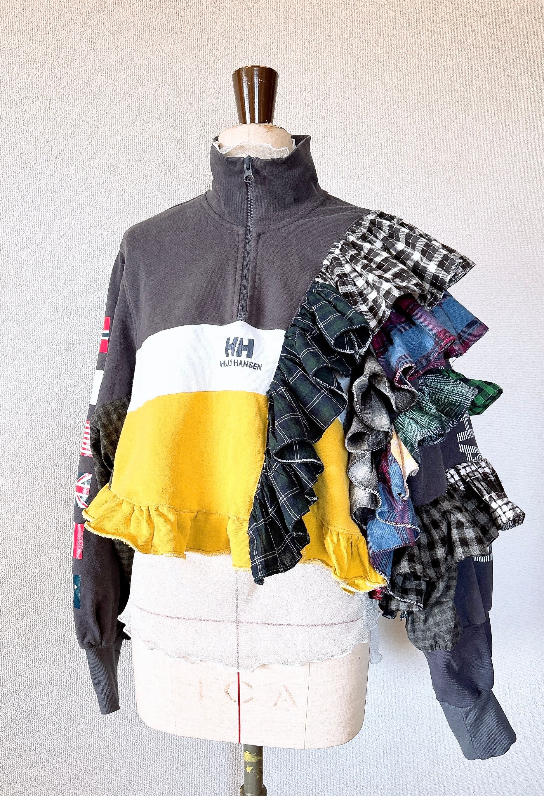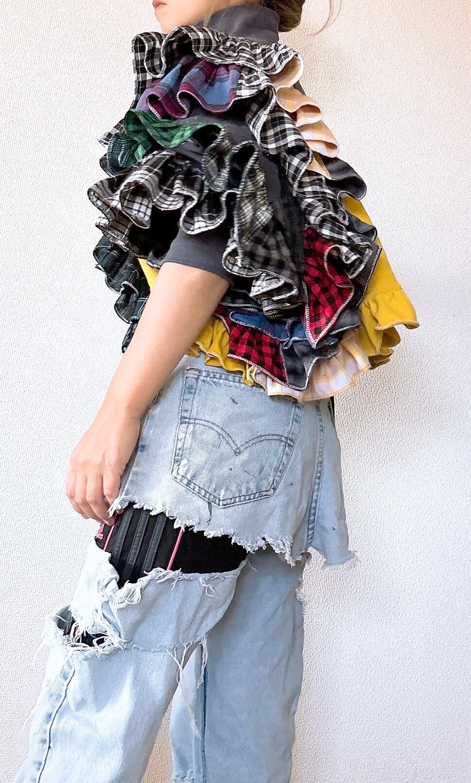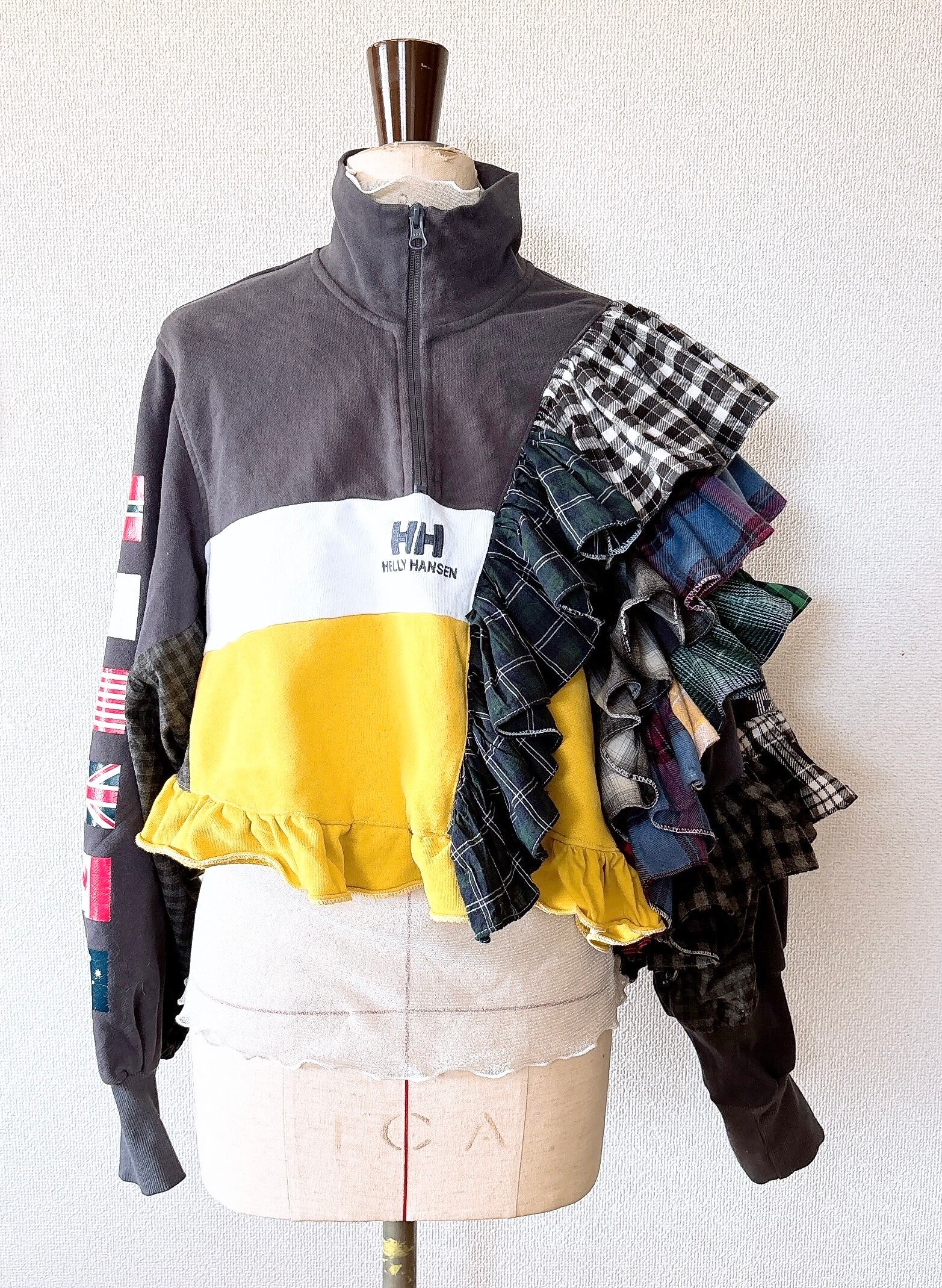 今期トレンドのチェックを古着のスウェットに挟み込んで片袖をフリルが最強に可愛い袖にしました。
