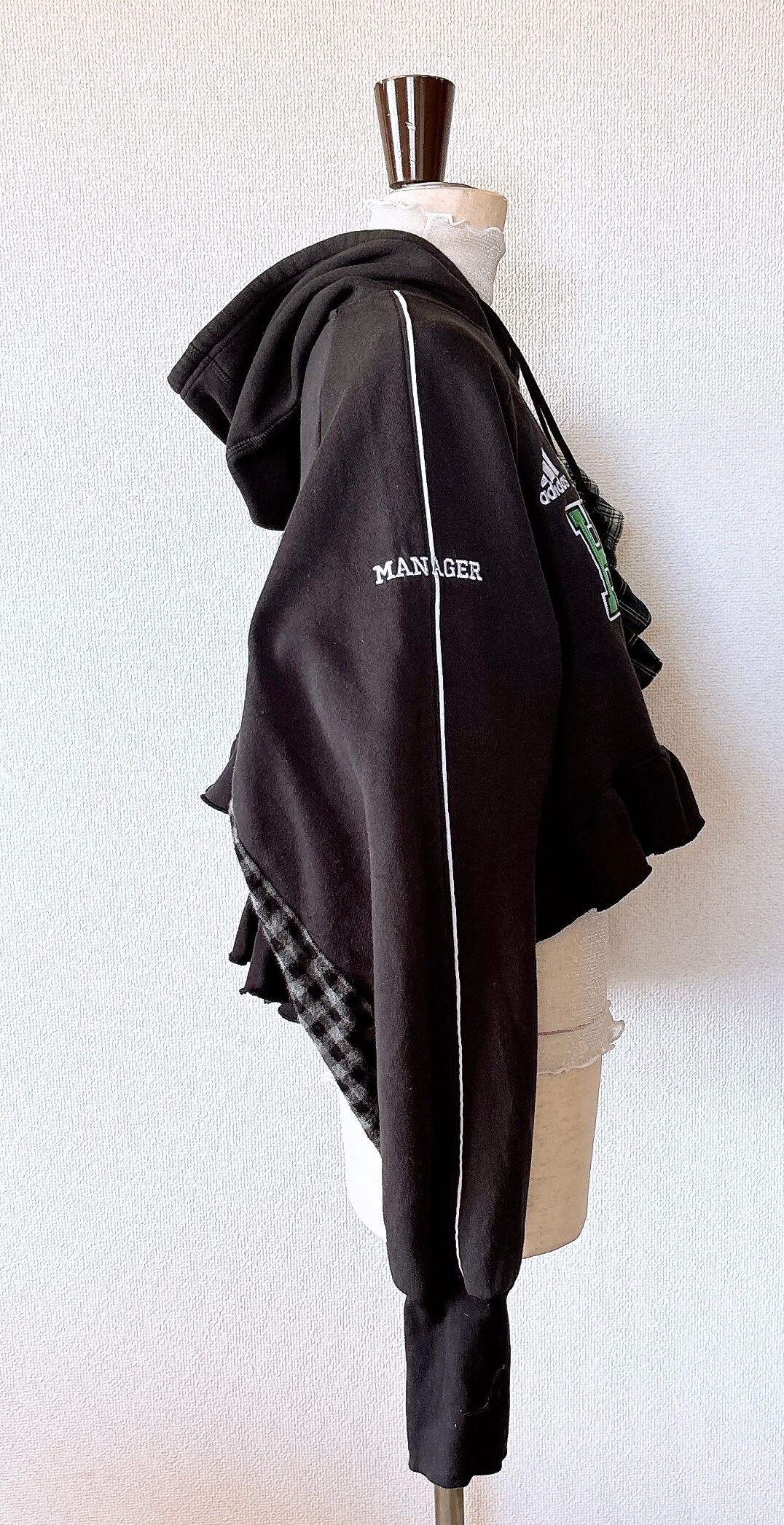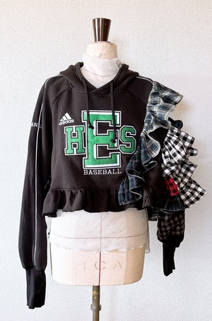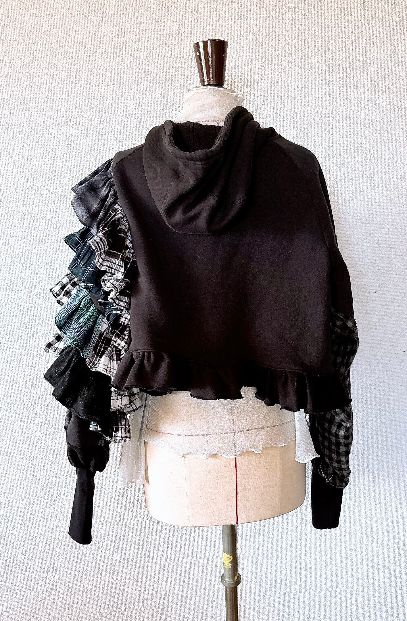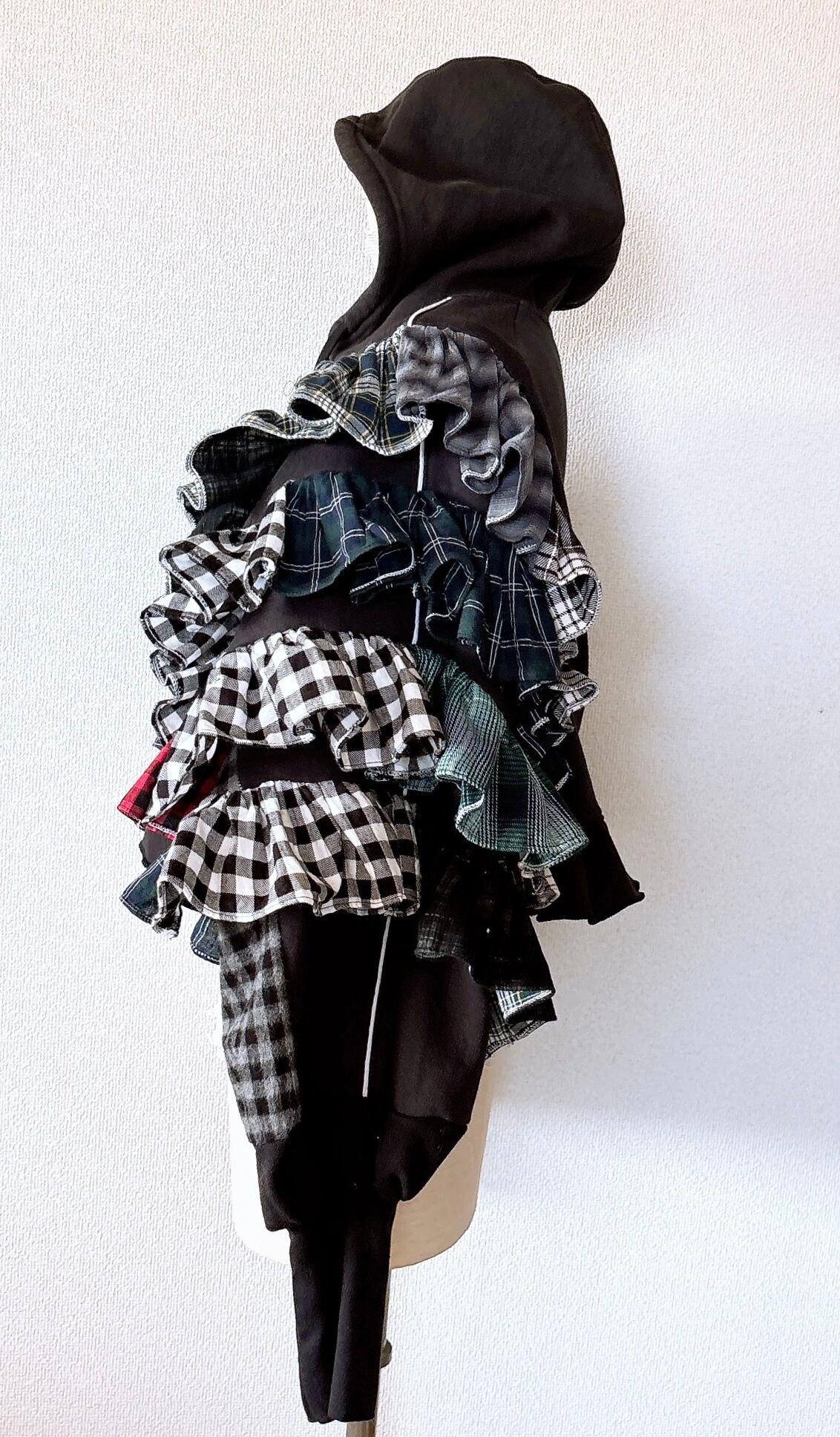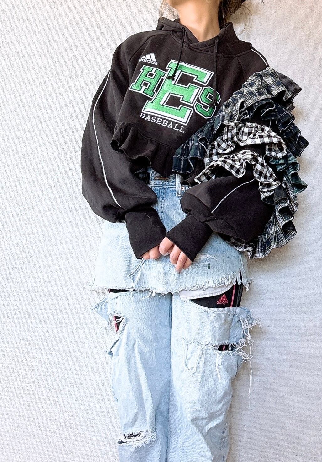 今期トレンドのチェックを古着のスウェットに挟み込んで片袖をフリルが最強に可愛い袖にしました。