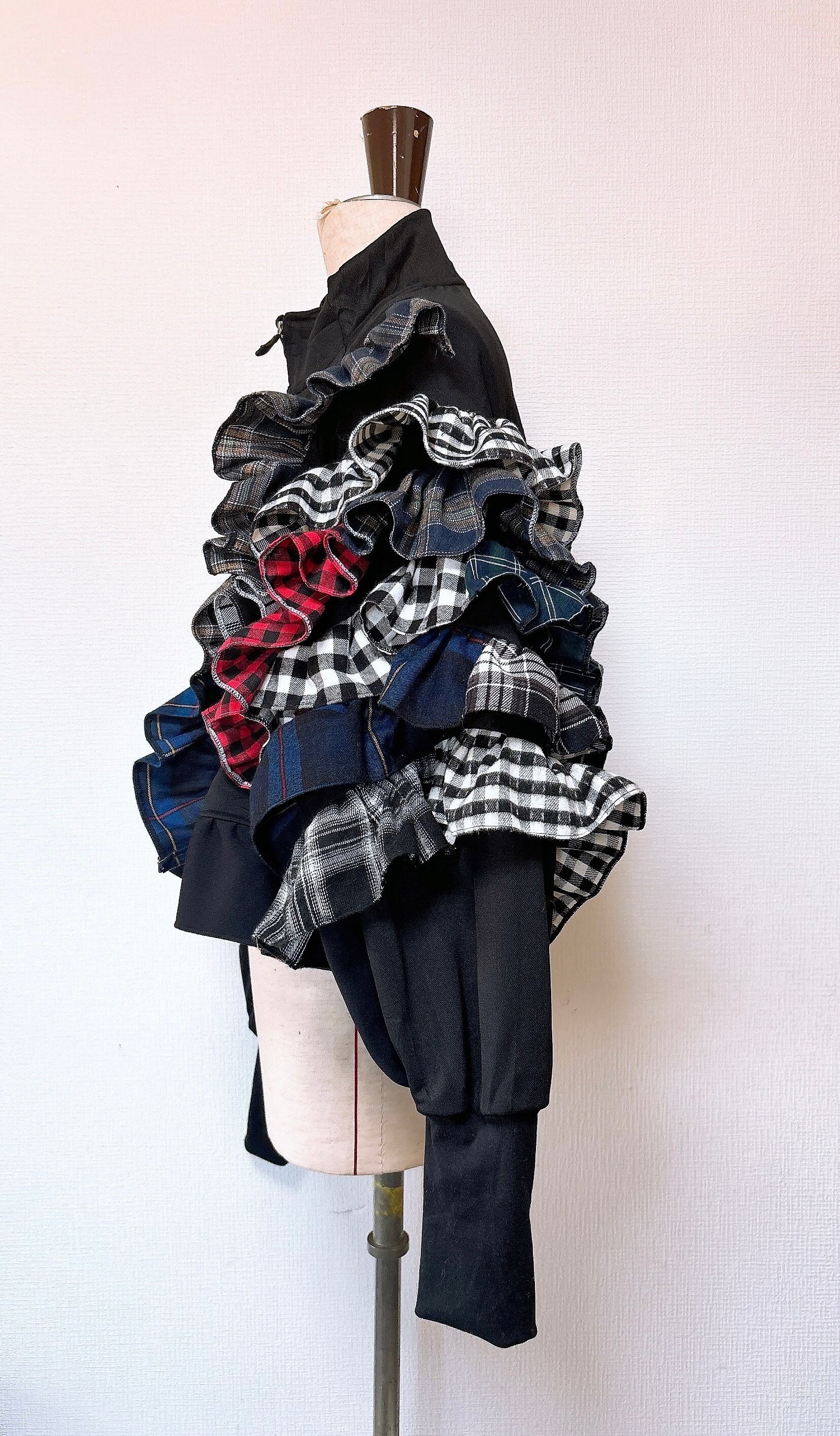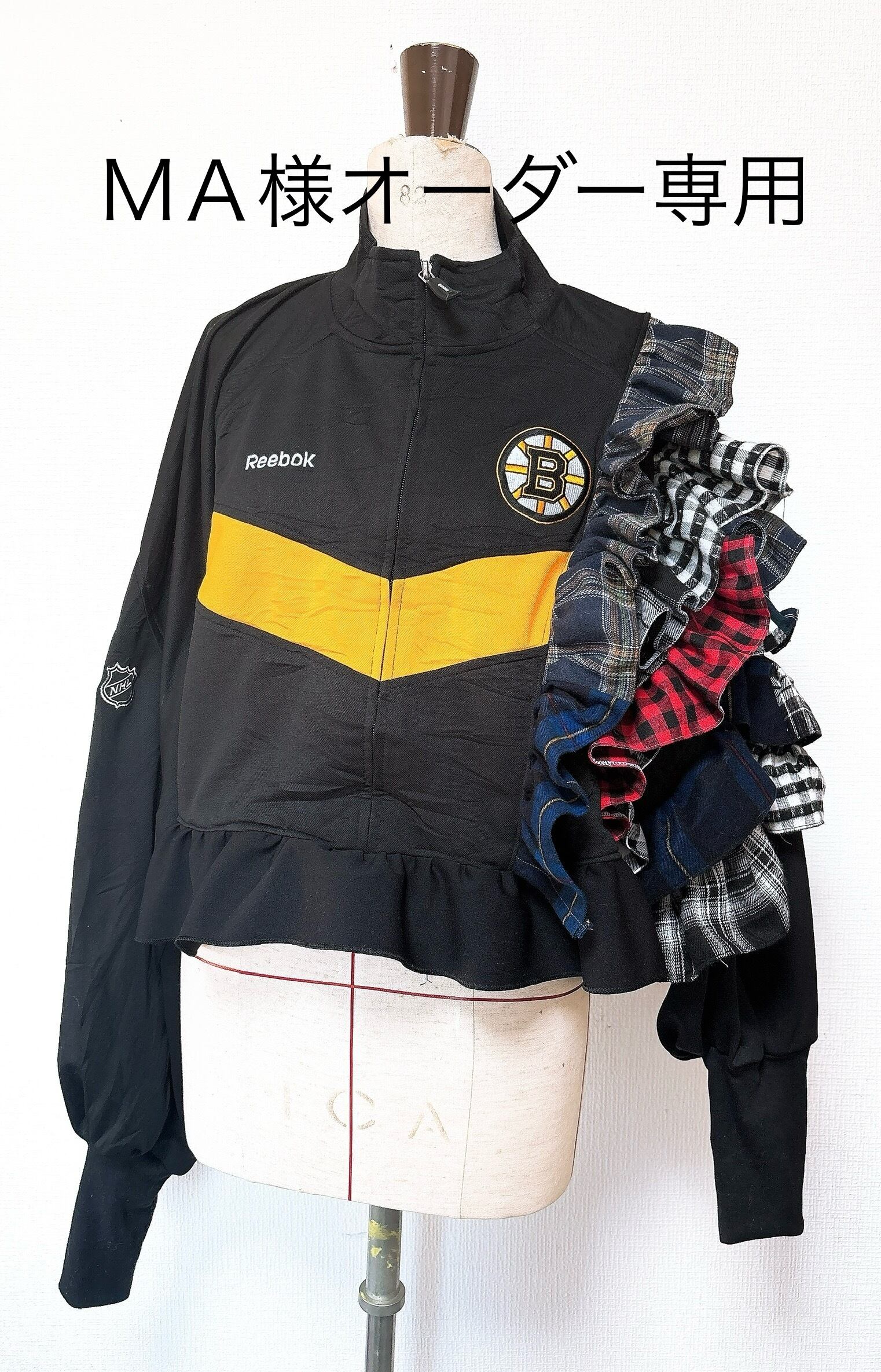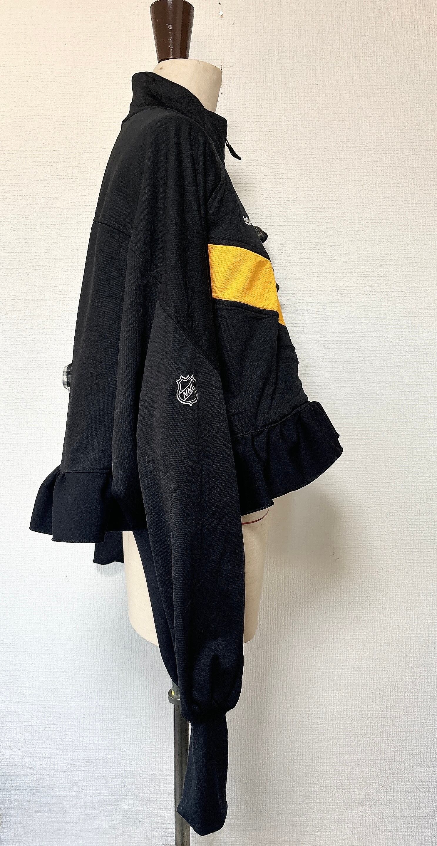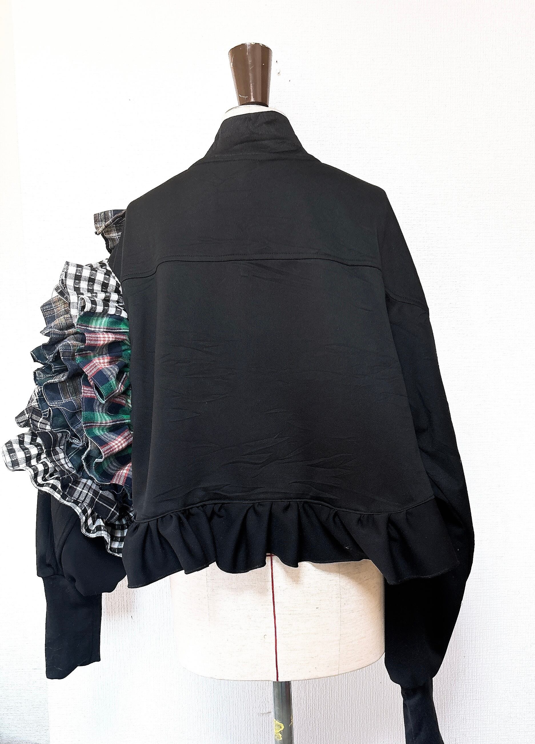 今期トレンドのチェックをリーボックのトラックジャケットに挟み込んで片袖をフリルが最強に可愛い袖にしました。