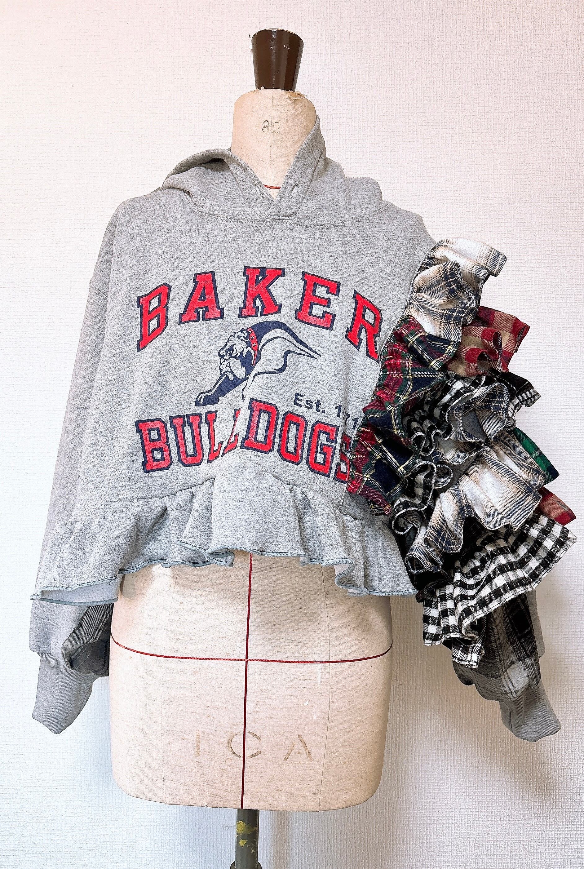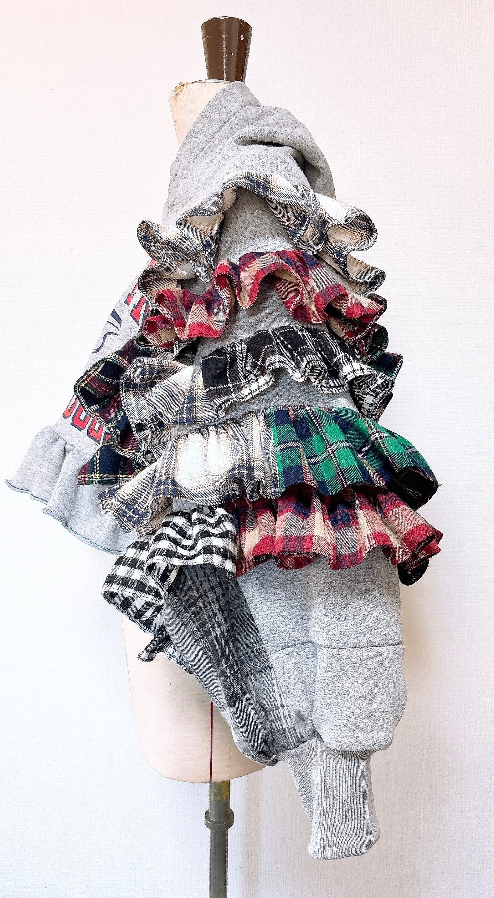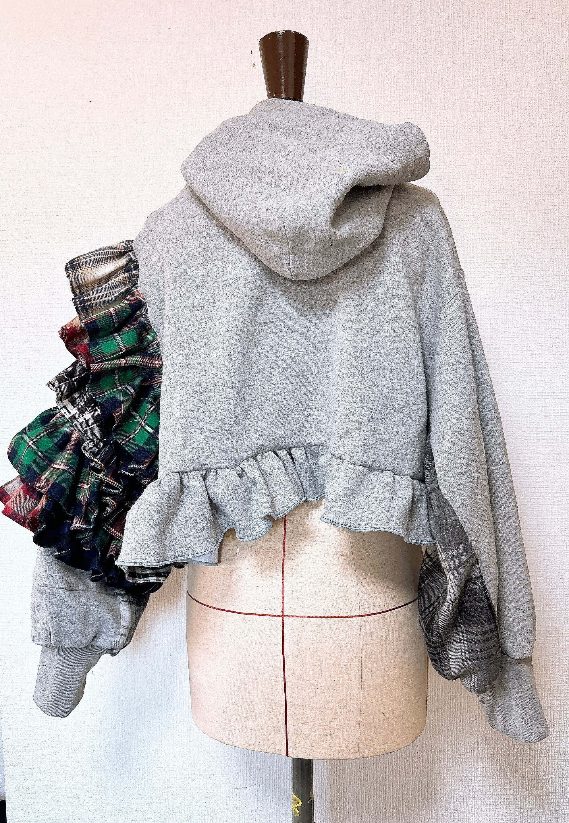 今期トレンドのチェックをusa古着に挟み込んで片袖をフリルが最強に可愛い袖にしました。