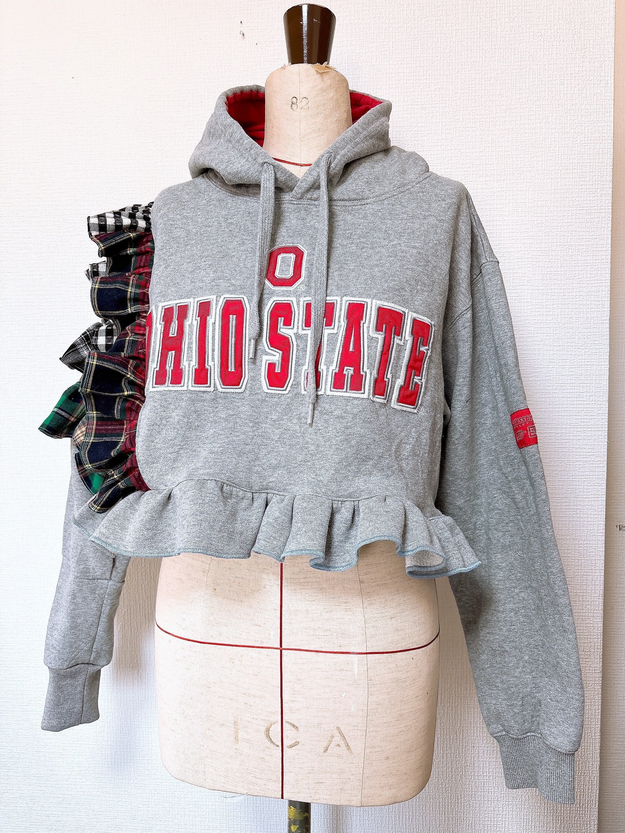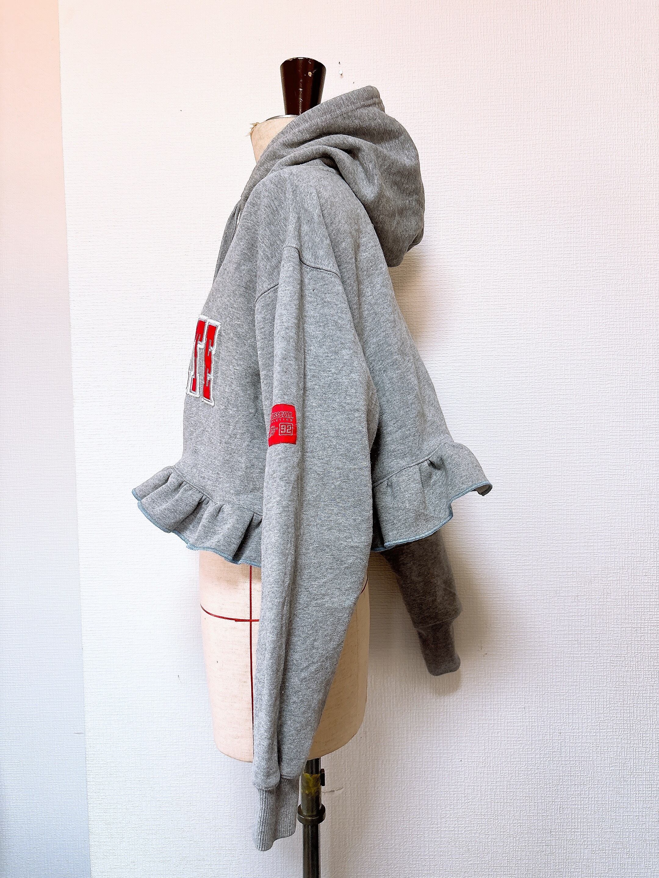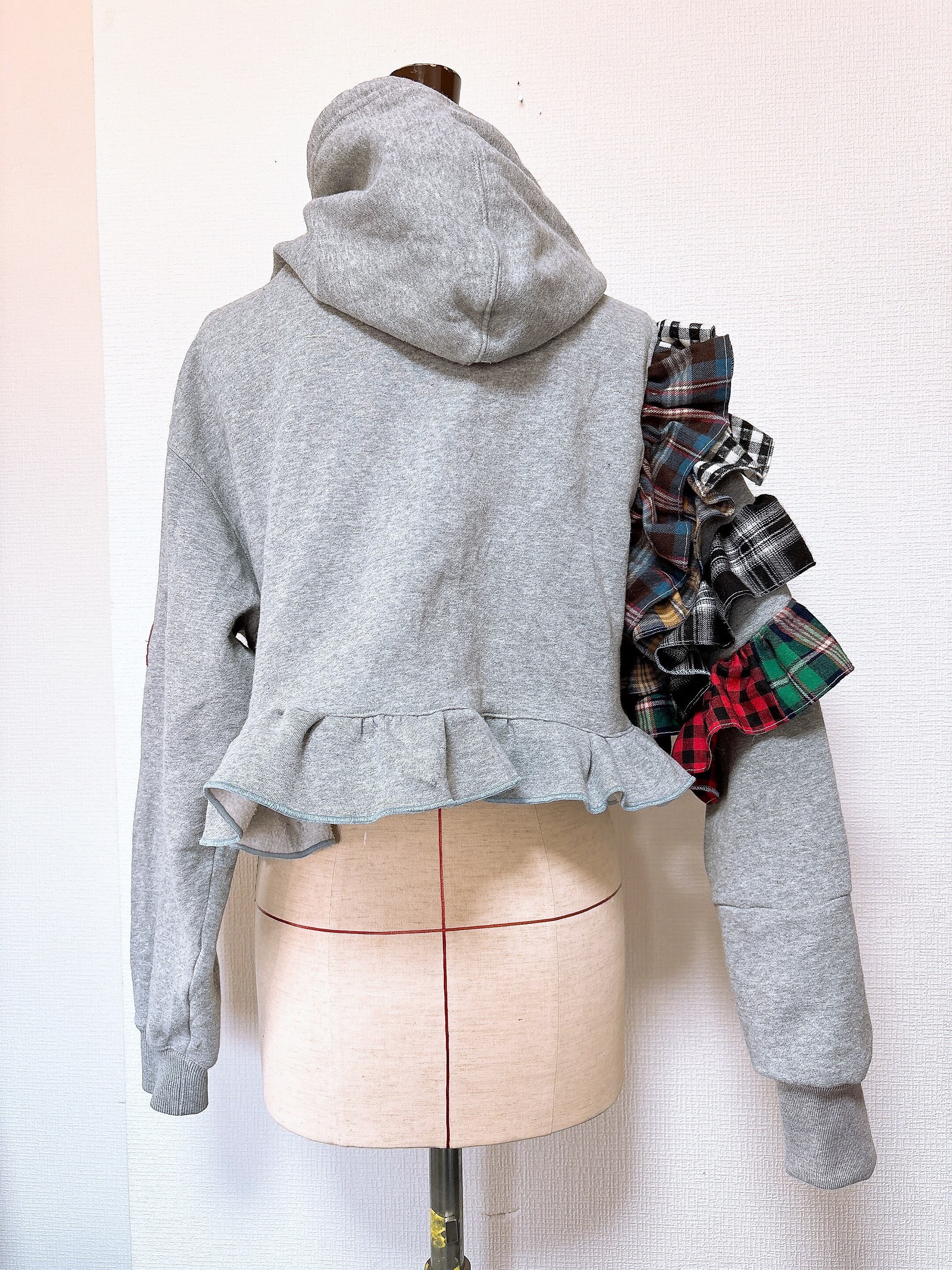 今期トレンドのチェックを古着のスウェットに挟み込んで片袖をフリルが最強に可愛い袖にしました。